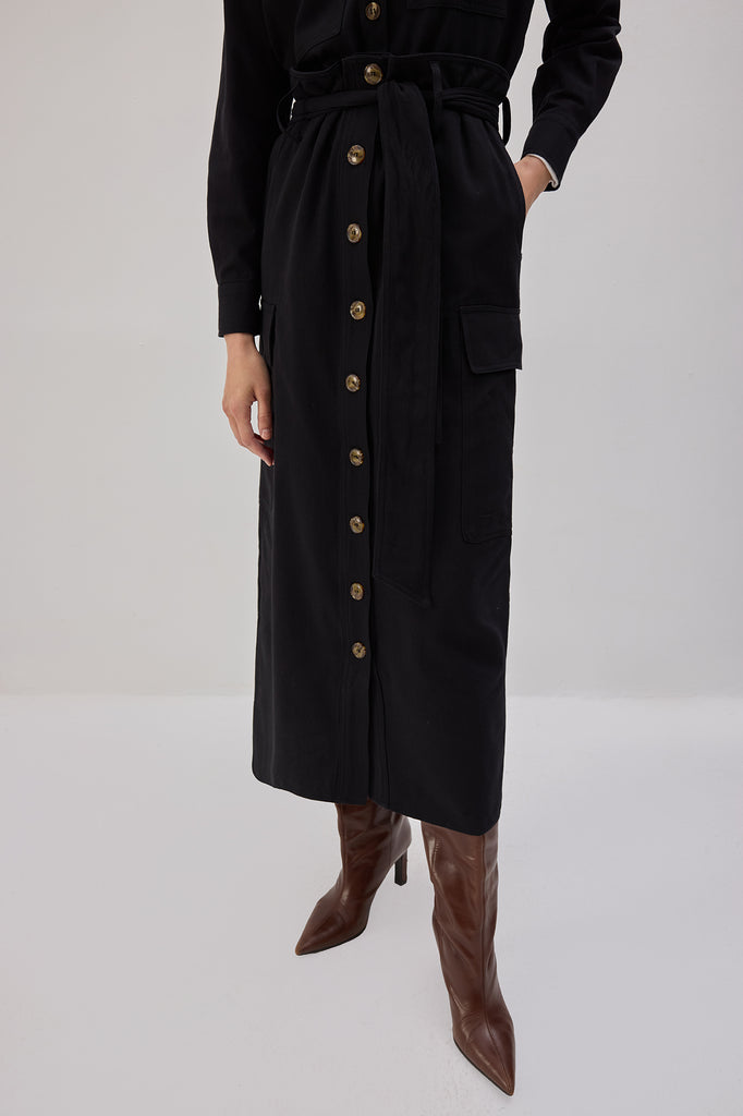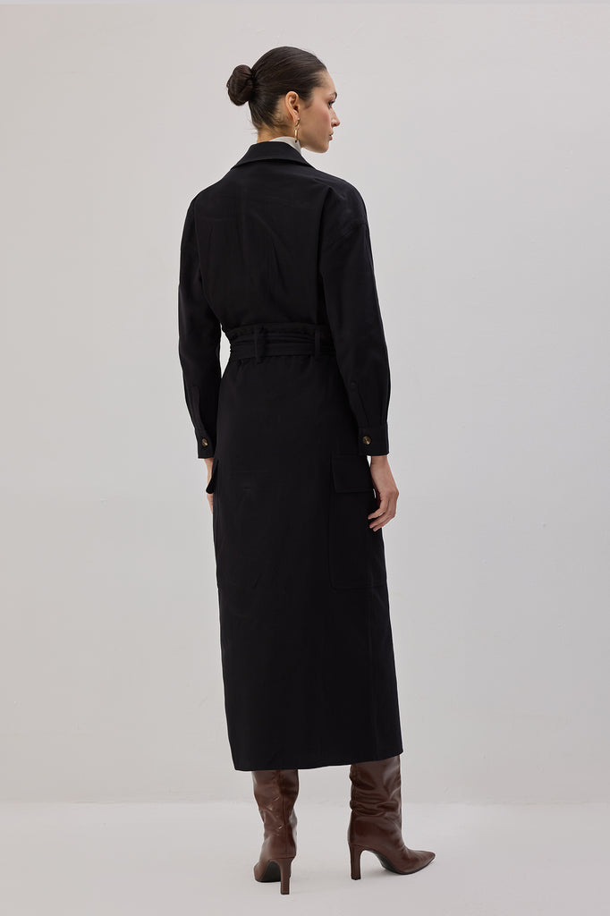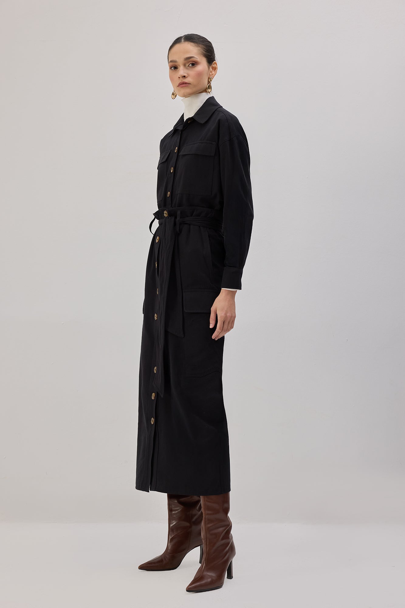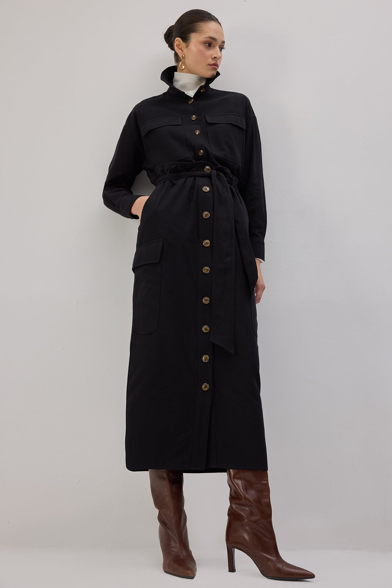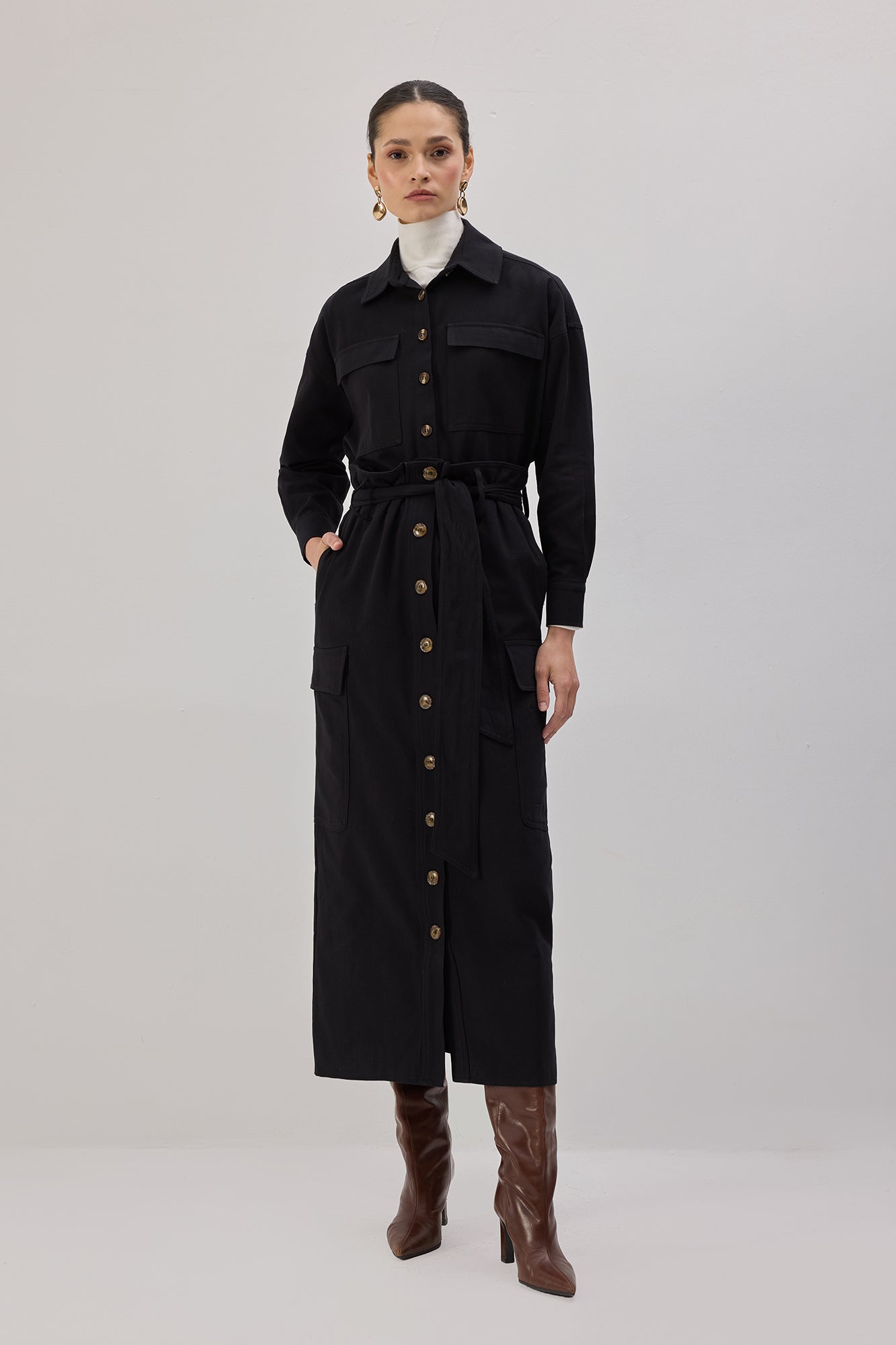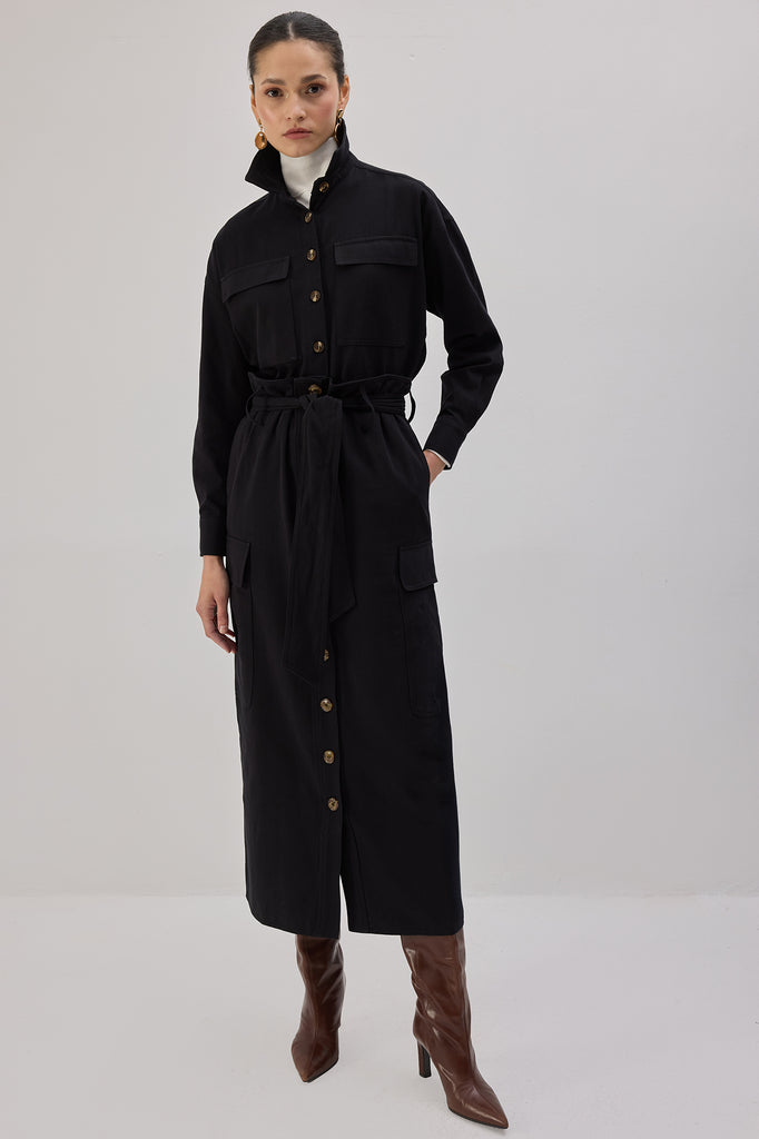 Önden tam boy düğme kapamalı. Kuşak detaylı. Yan cepli.
