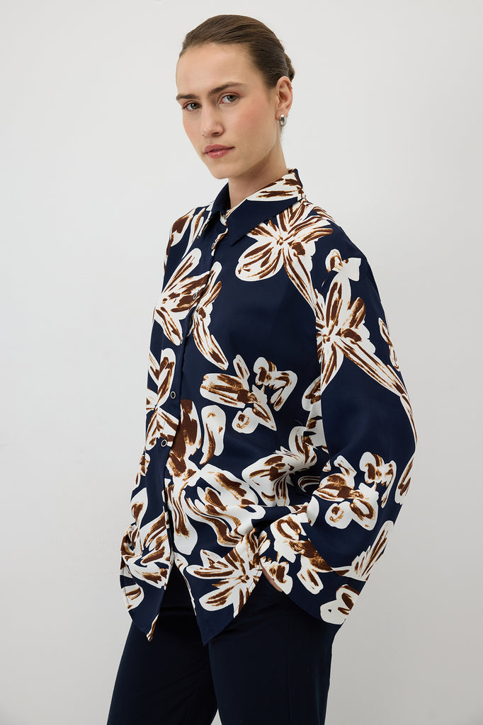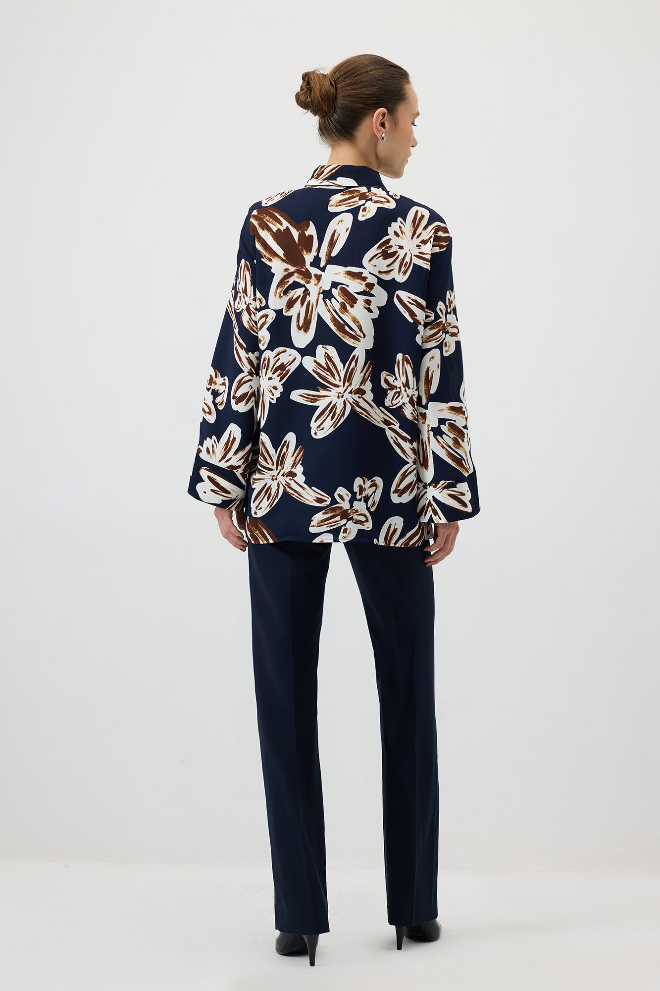 Desenli saten gömlek. Klasik yaka. Uzun kol. Geniş manşetli. Önden düğmeli.