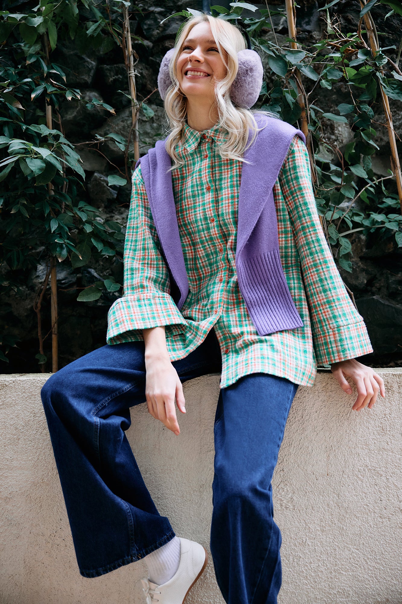 Düşük omuzlu. Uzun kollu. Yumuşak dokulu. Ekose gömlek.