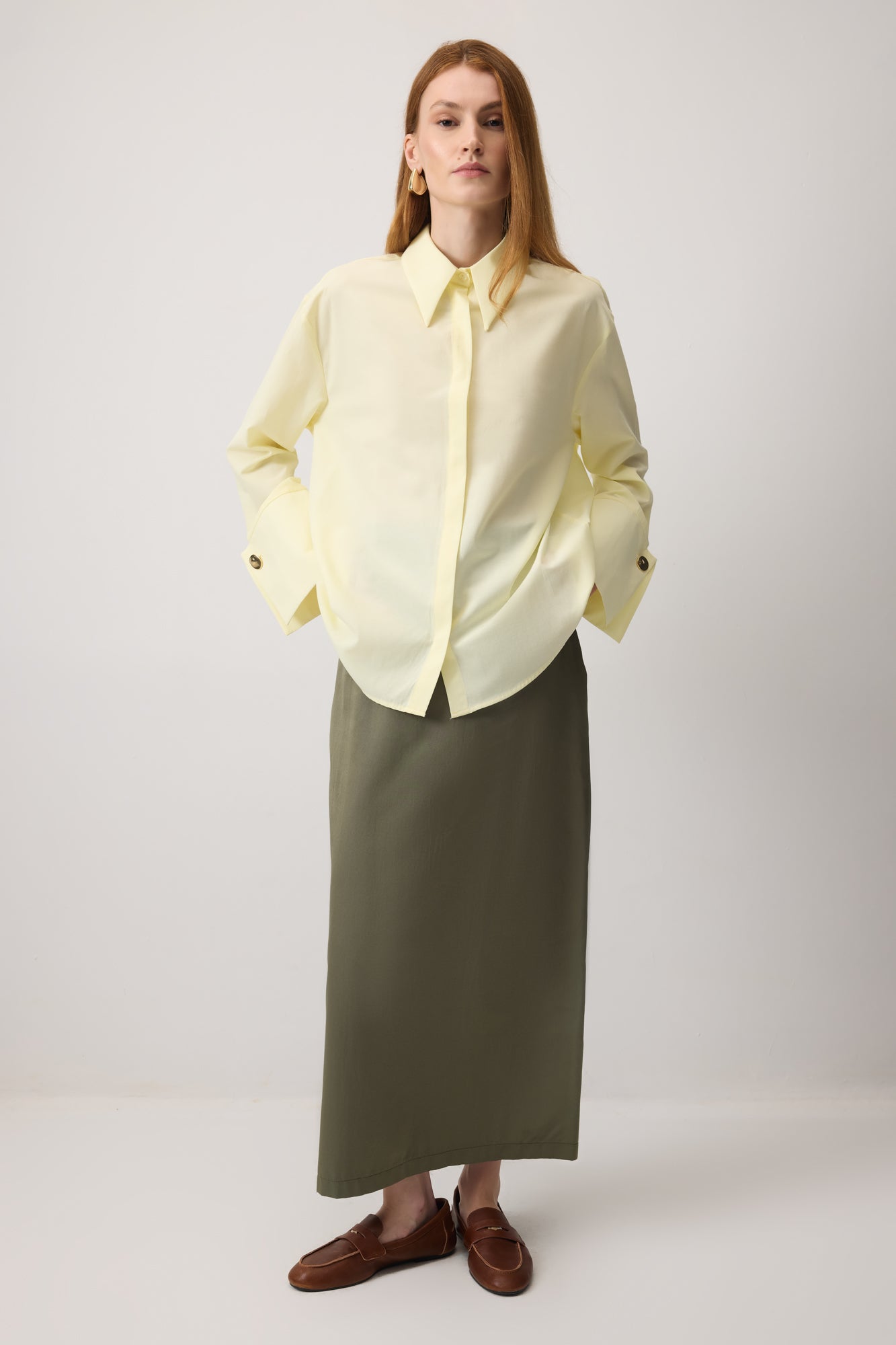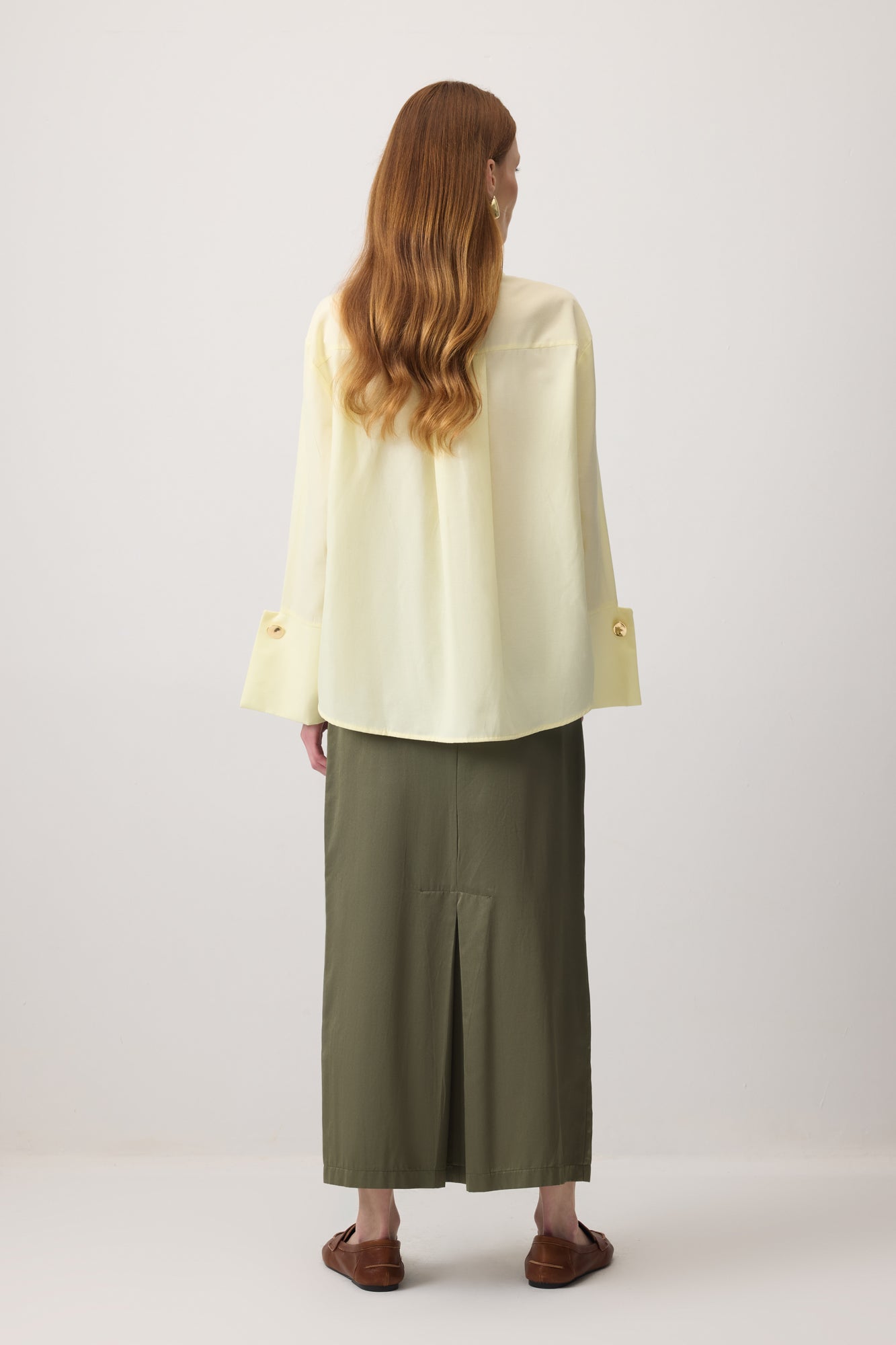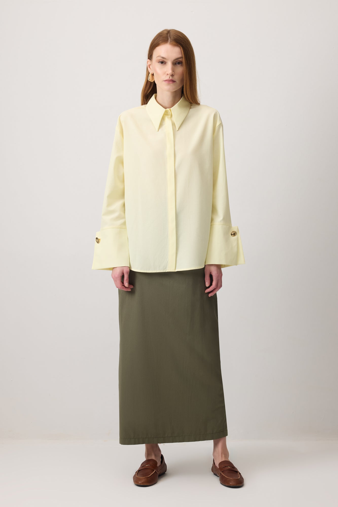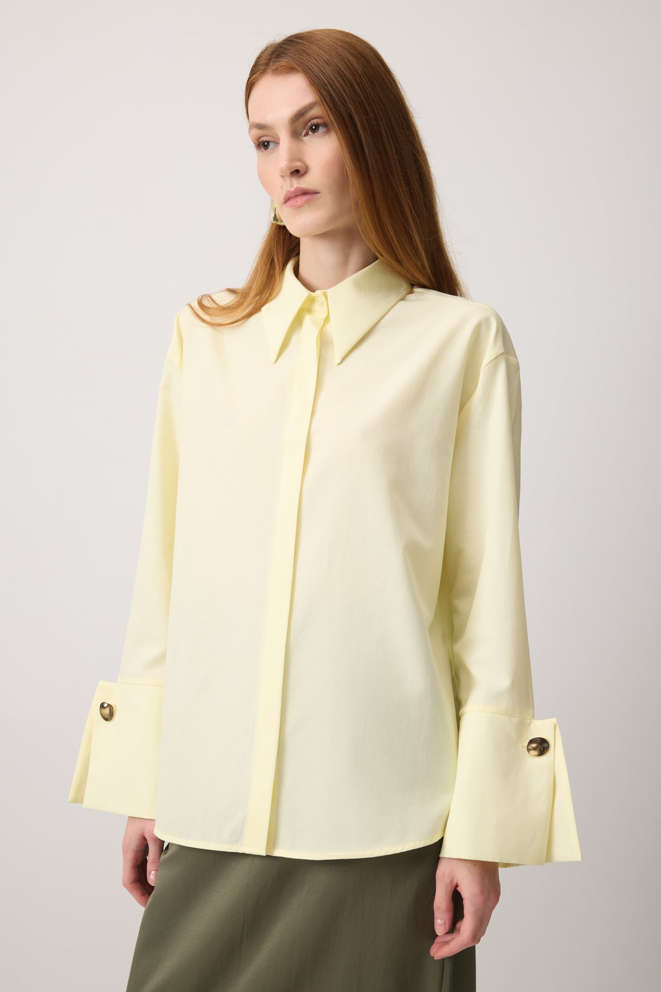 Uzun kollu gömlek. Geniş manşetli. Gold düğme detaylı. Gizli patlı.