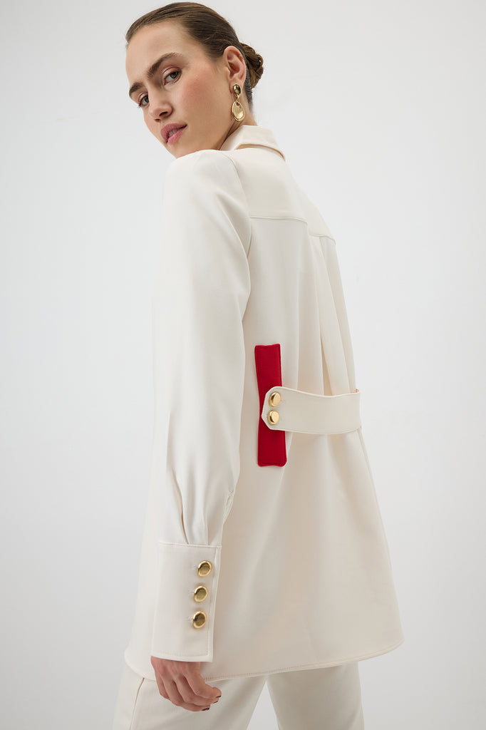 Zamansız çizgilere modern bir dokunuş katan bu gömlek, arka kısmındaki kırmızı kemer ve gold düğme detaylarıyla şık bir görünüm sunar. Yumuşak dokusu ve düz kesimi sayesinde gün boyu konfor sağlar. Ofis stilinden şehir şıklığına kadar farklı kombinlerde kolayca yer bulur.