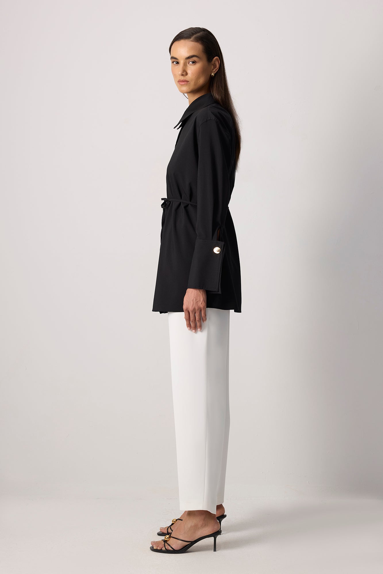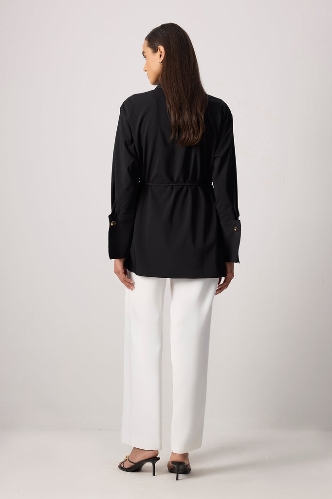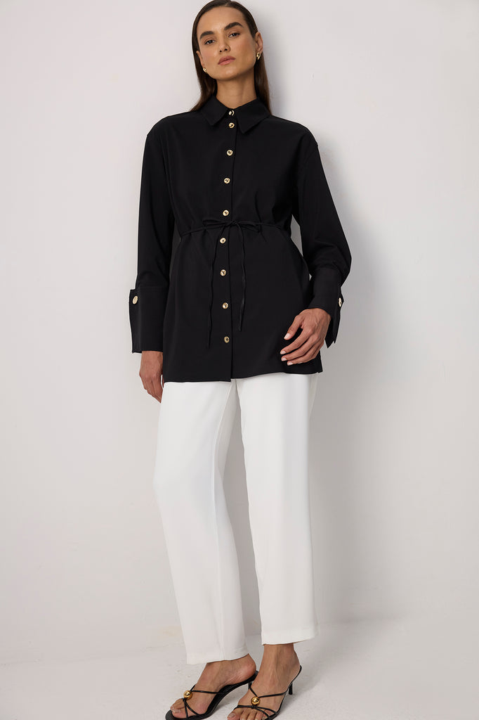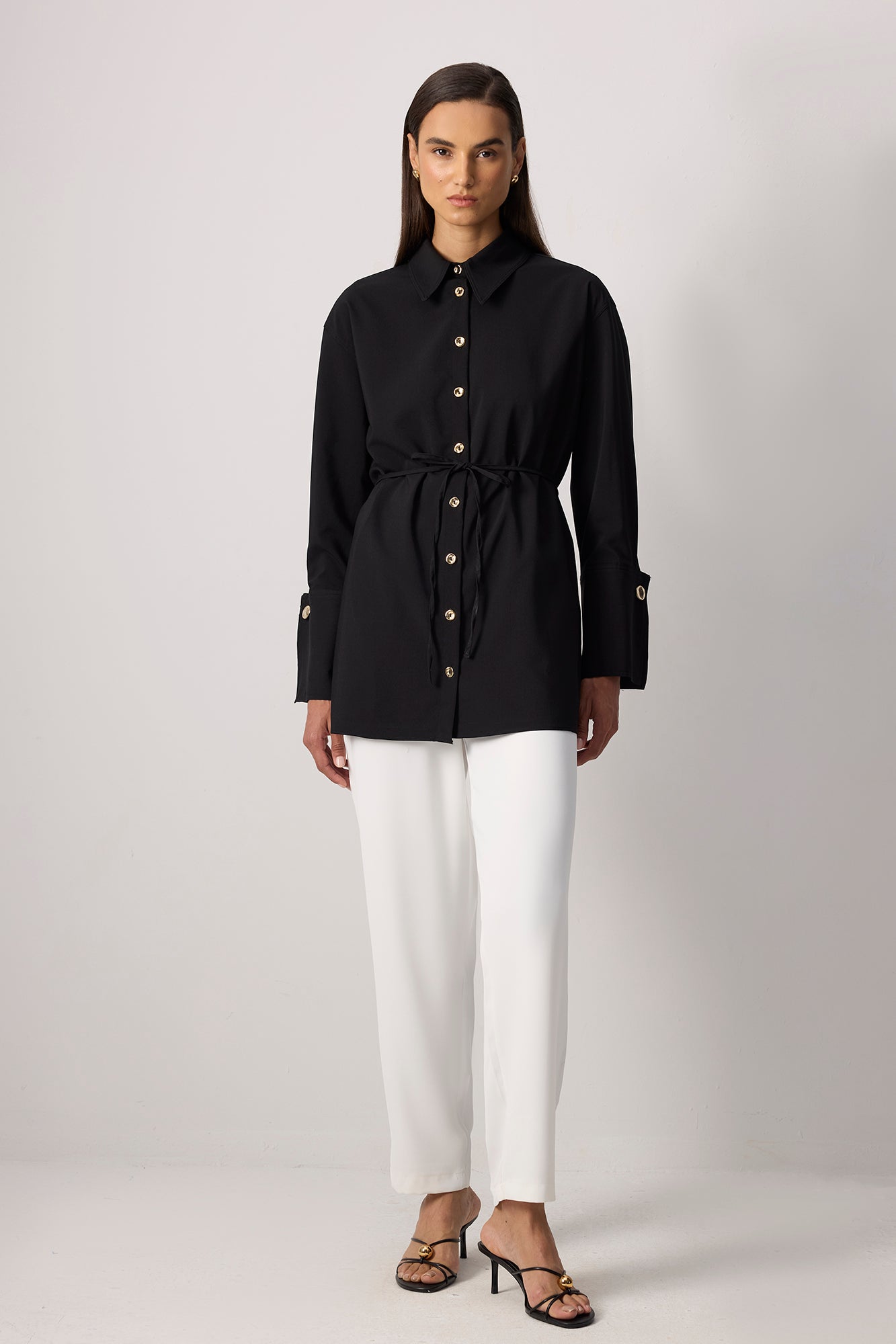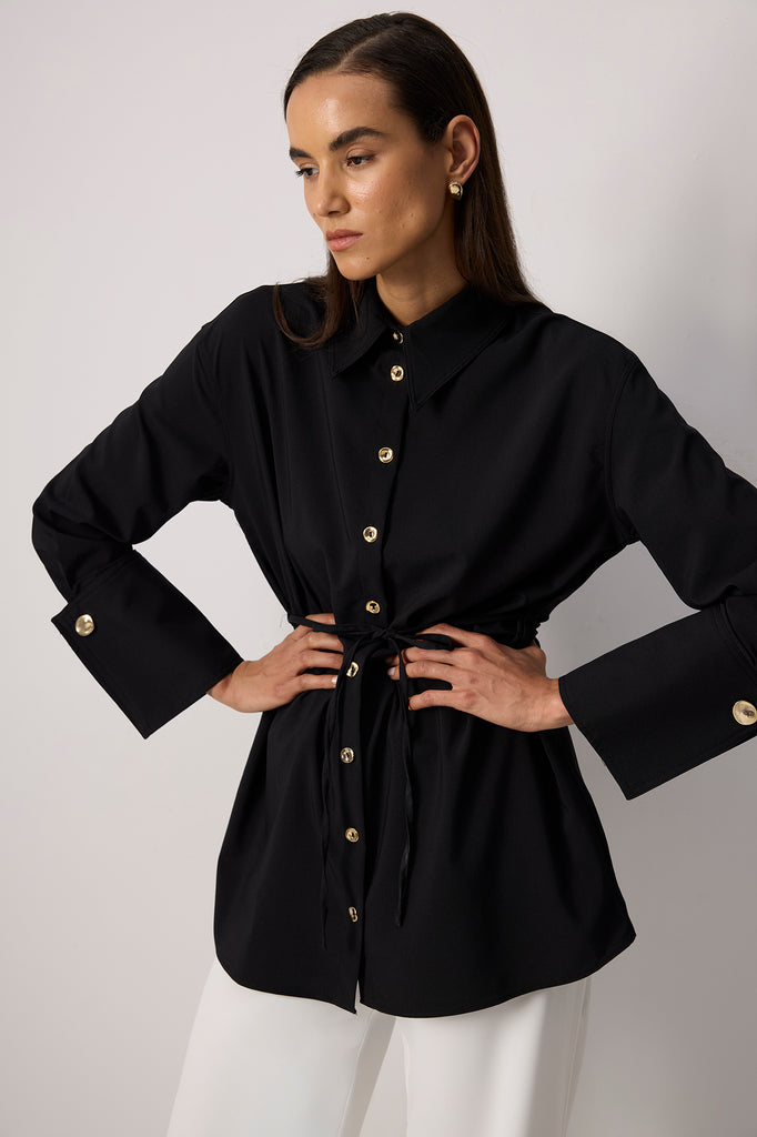 Viskon. Gömlek yaka. Ön ve manşetler metal düğme kapamalı. Geniş manşetli. Biye kemerli.