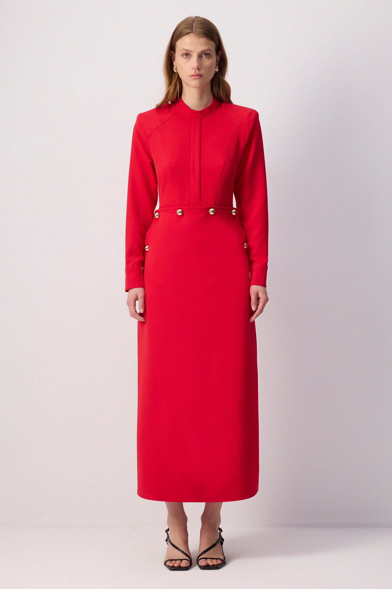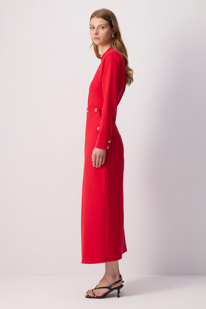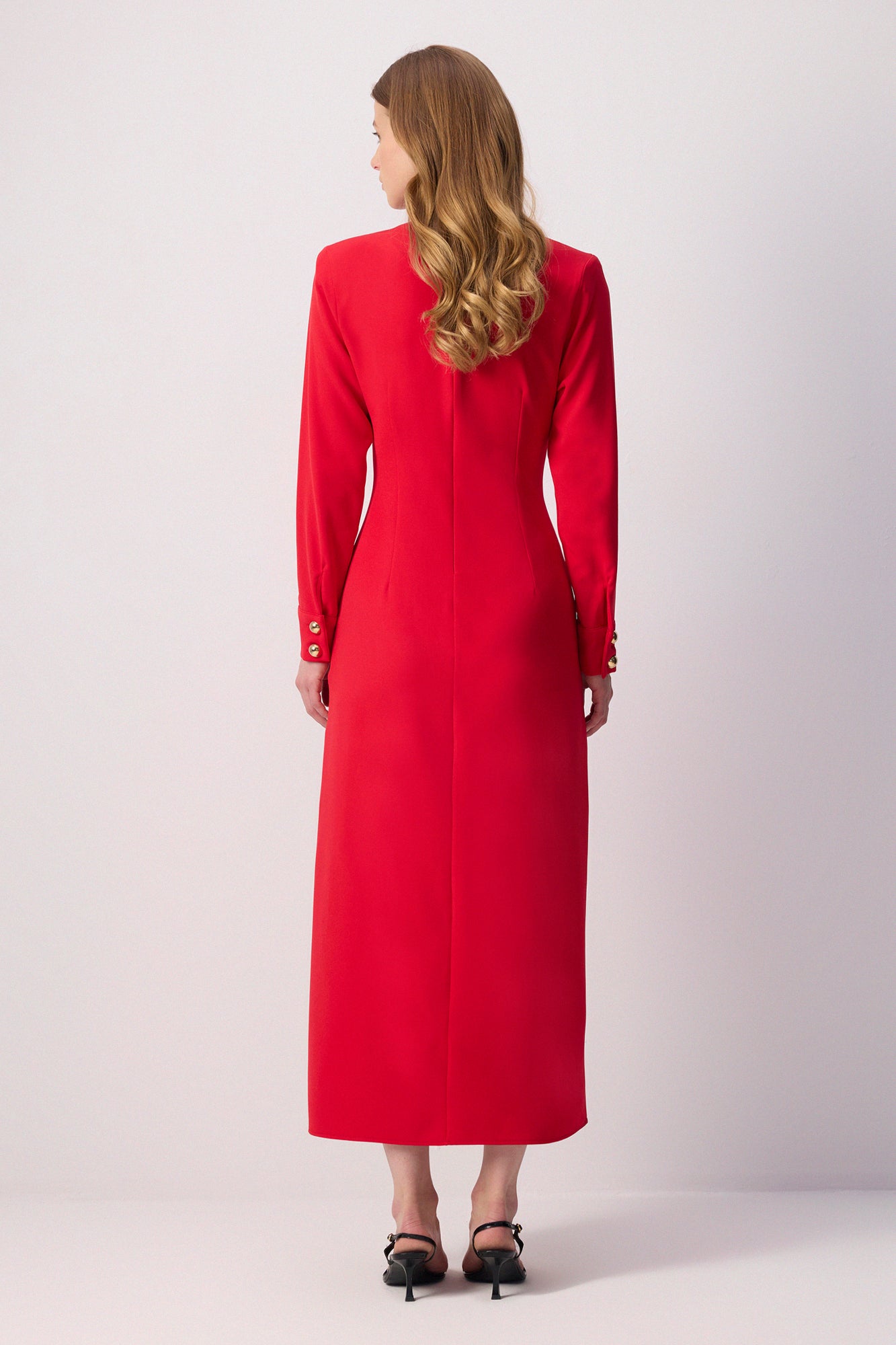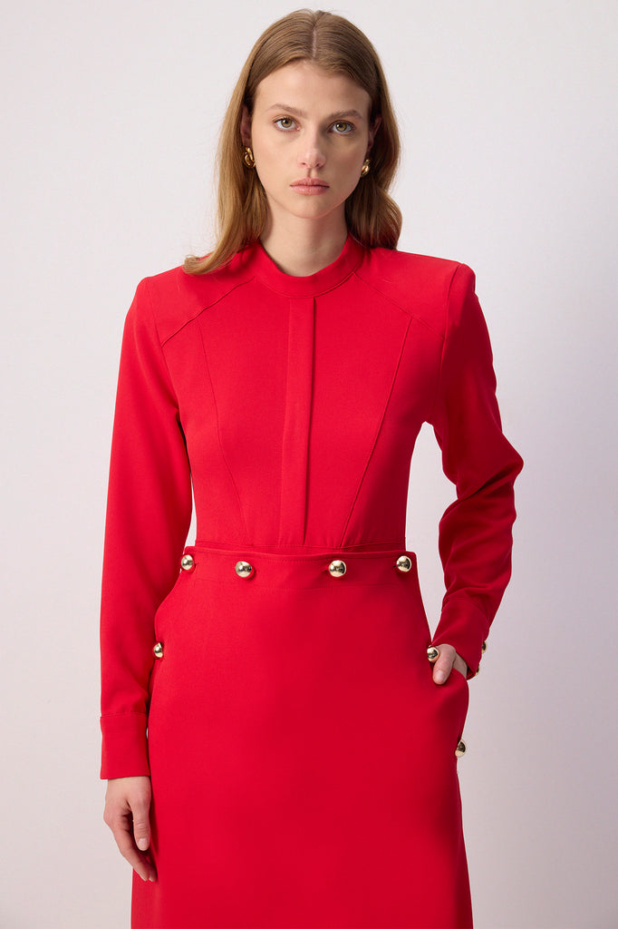 Hakim yaka. Vatkalı. Arkadan gizli fermuarlı. Gold düğme detaylı. Çift cepli.