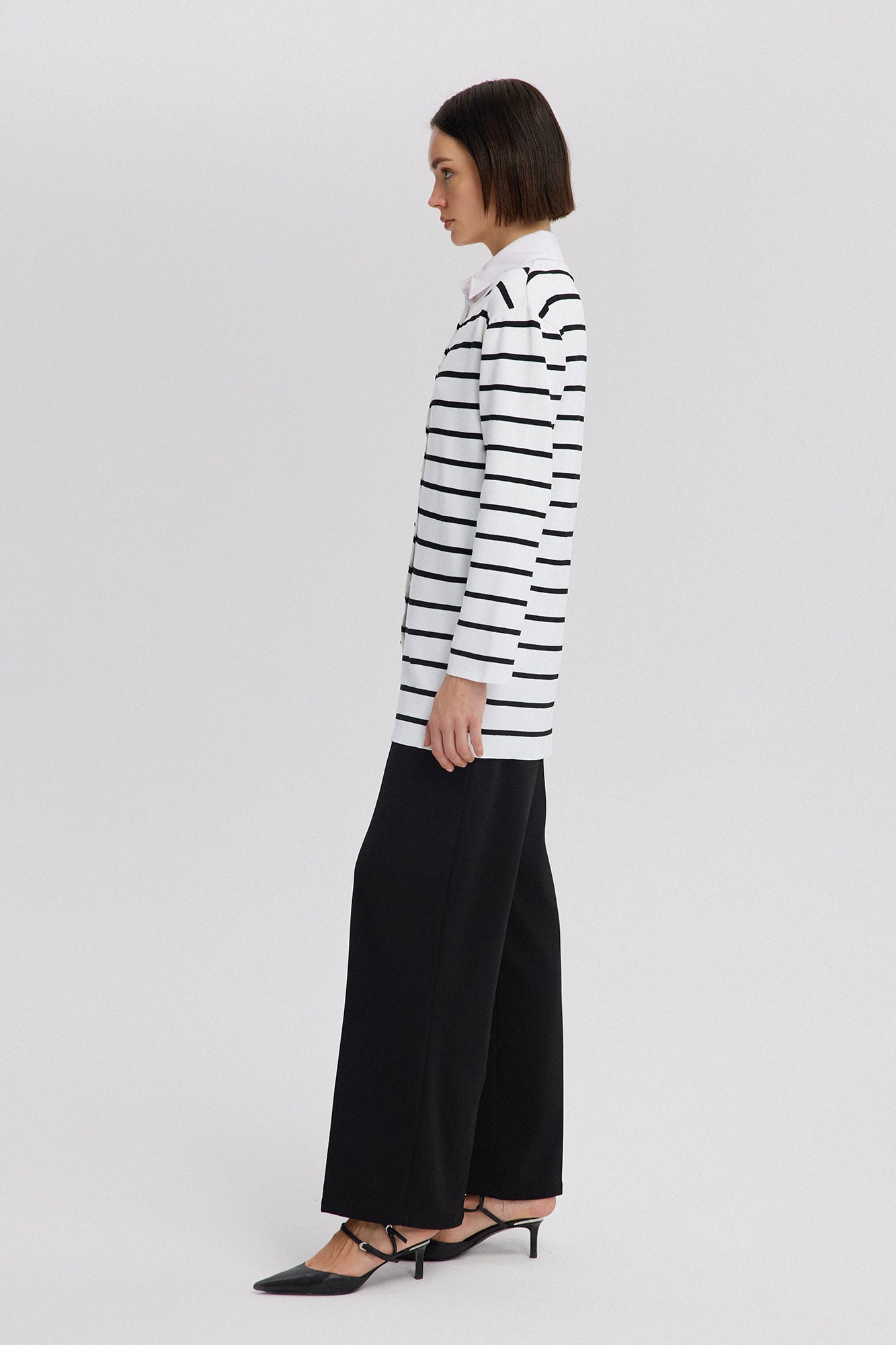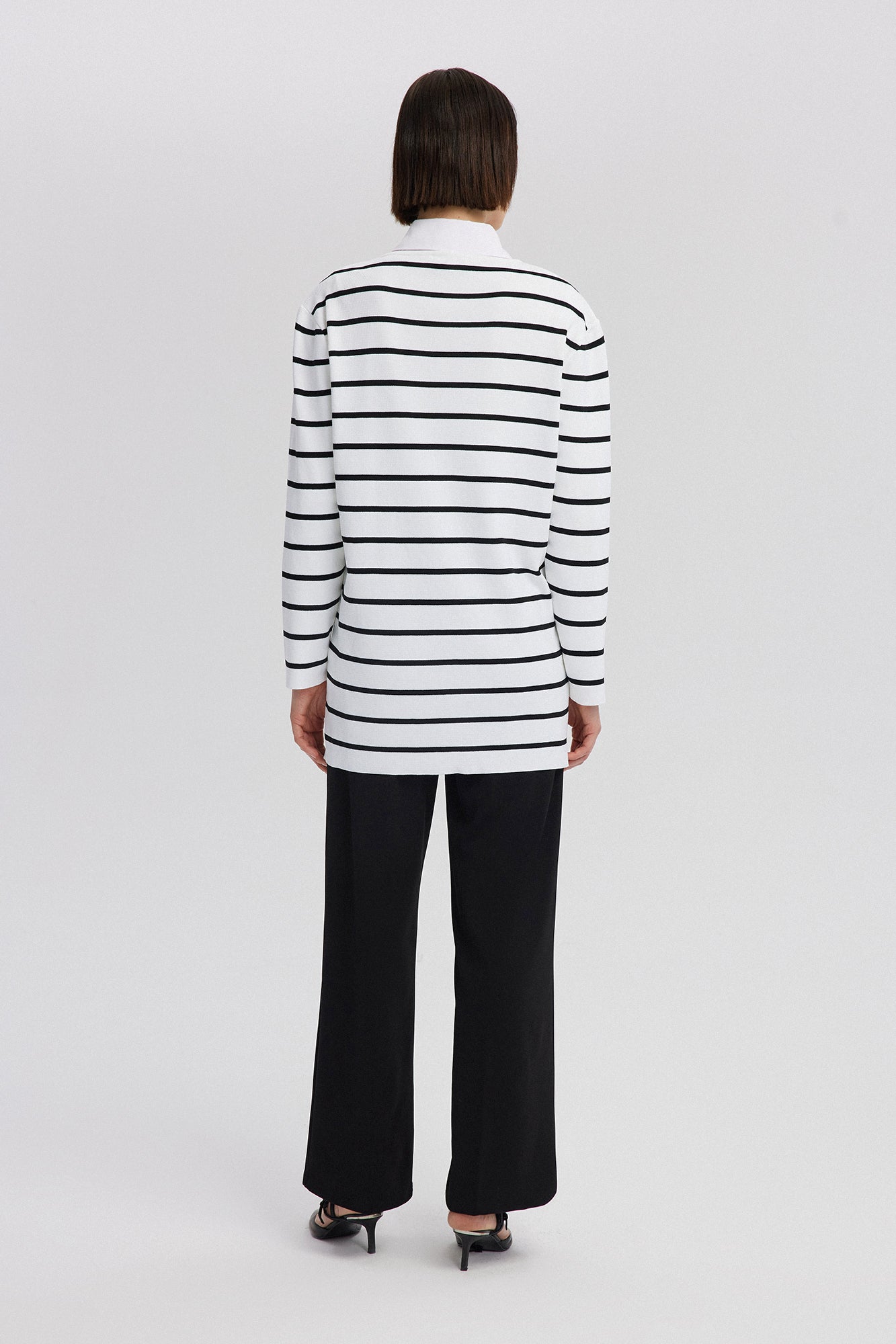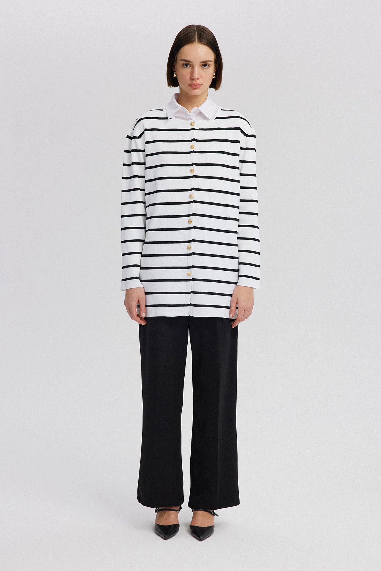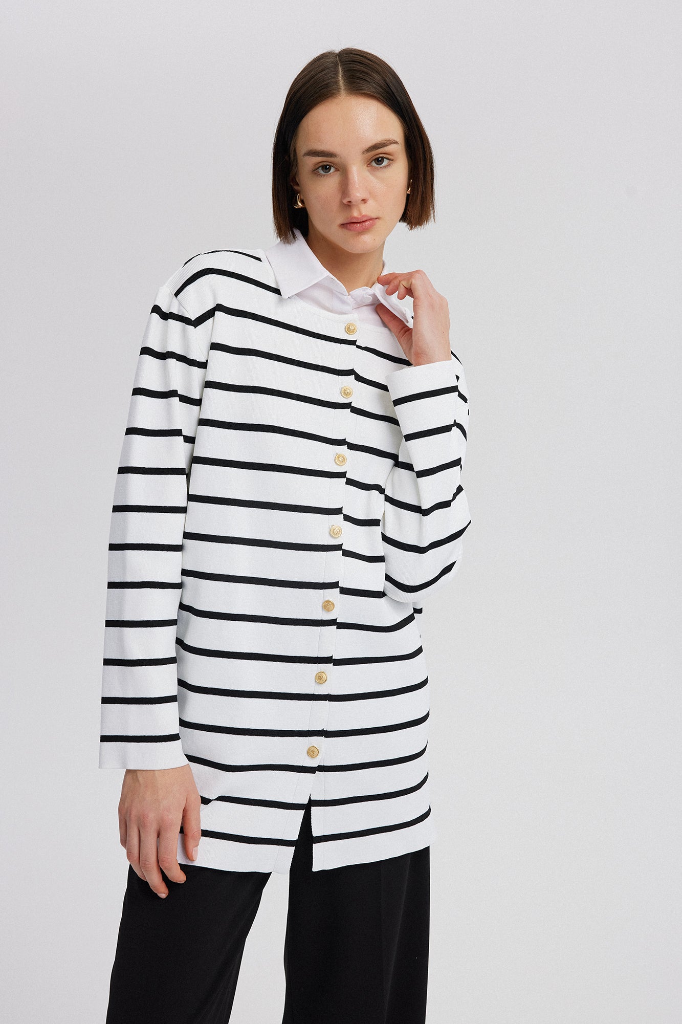 Bisiklet yaka. Uzun kollu ve düşük omuzlu. Kontrast çizgili. Gold düğme detaylı. Triko.