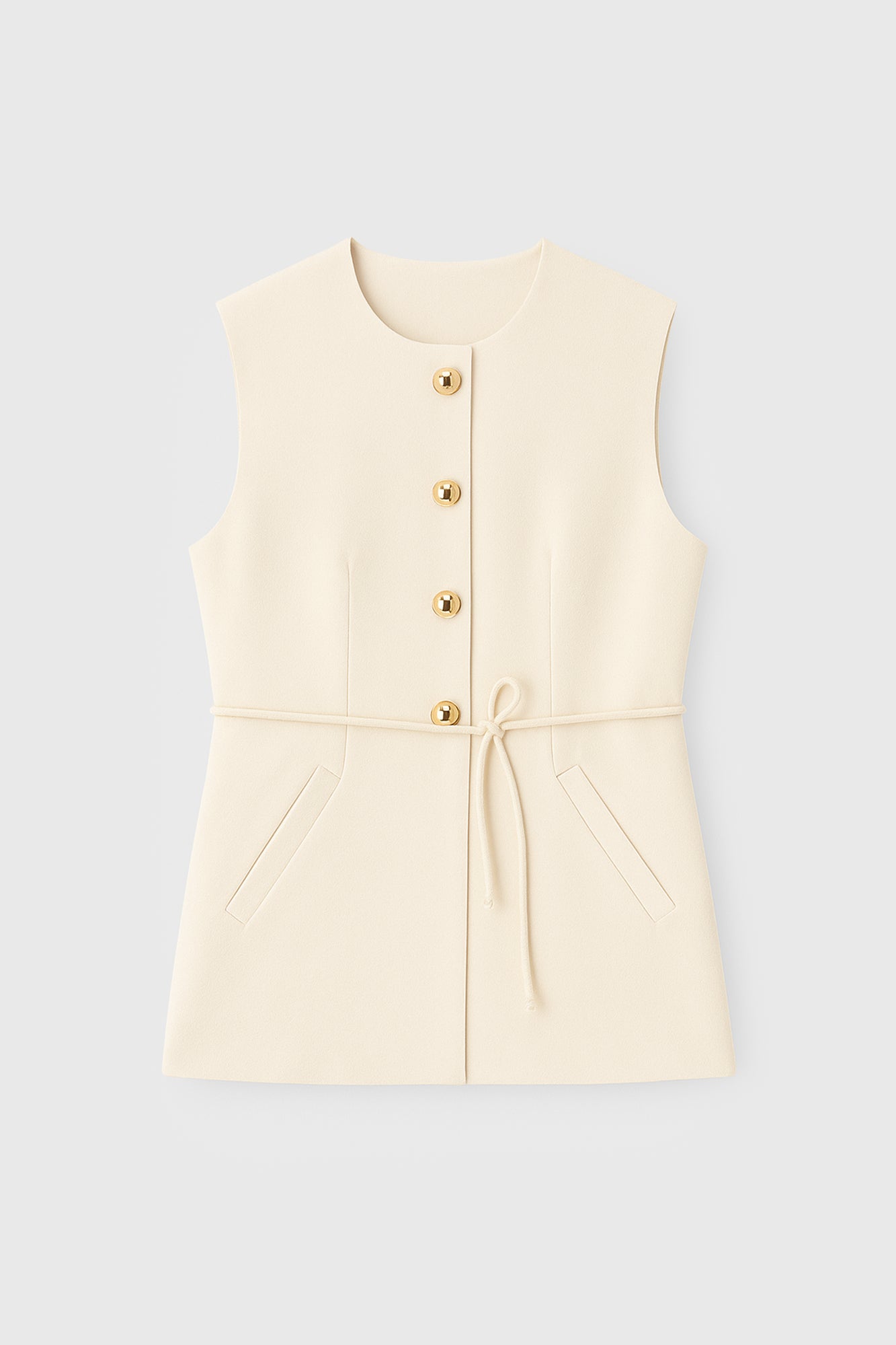 Bisiklet yaka. Kolsuz. Gold düğme kapamalı.