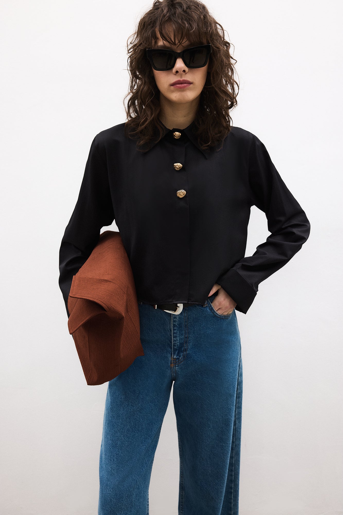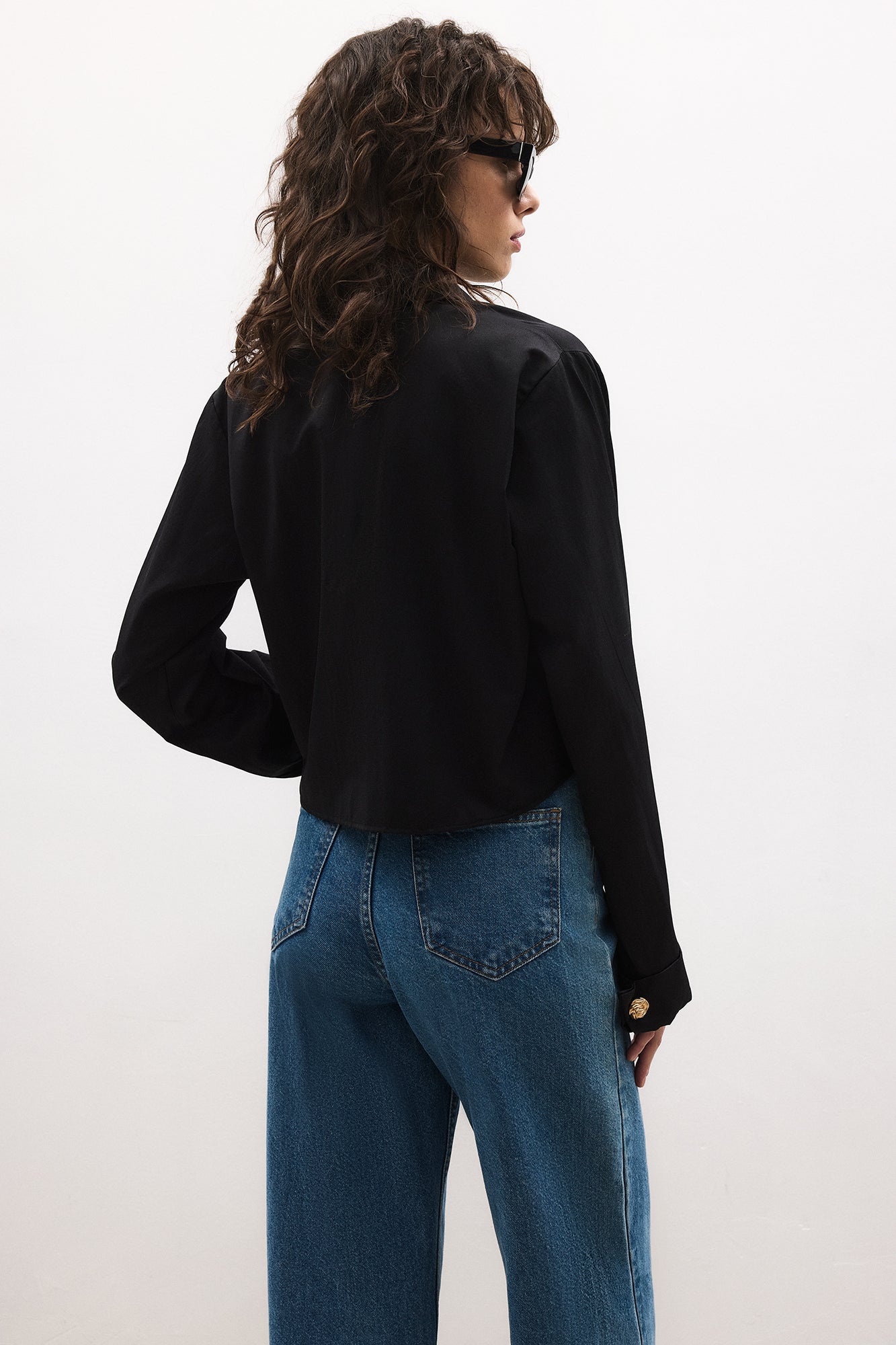 Gömlek yaka. Önde dekoratif gold düğme detaylı kapama. Uzun kol ve manşetli kol ucu.