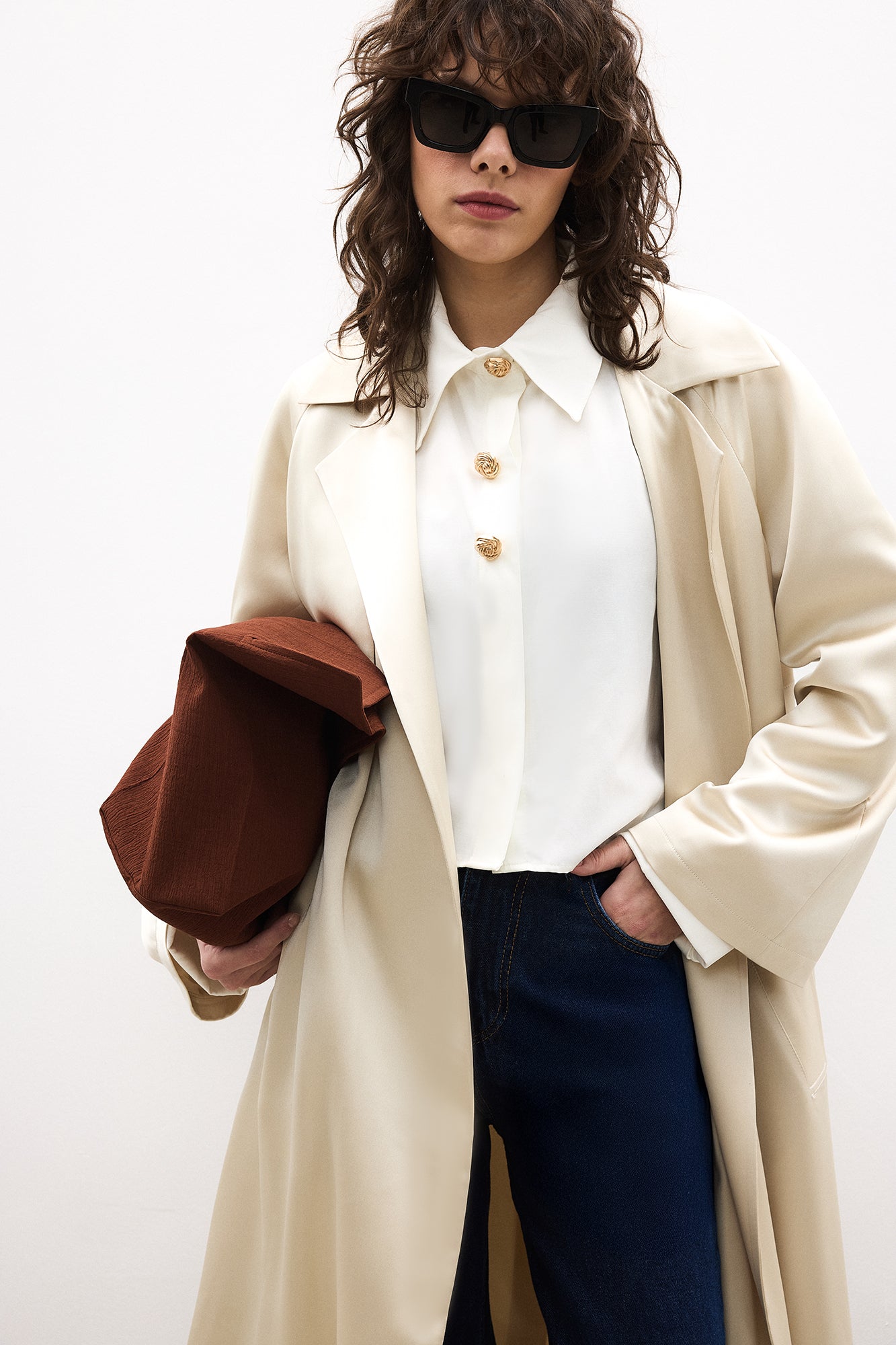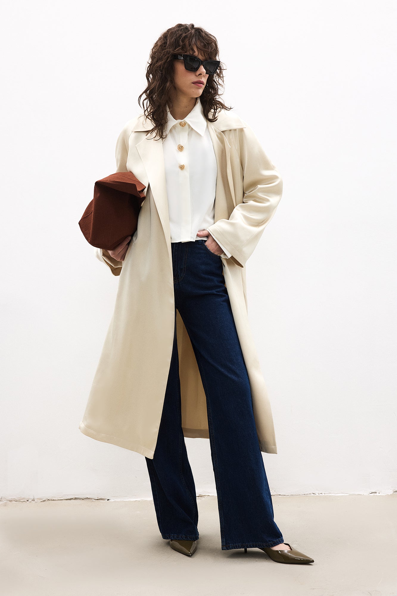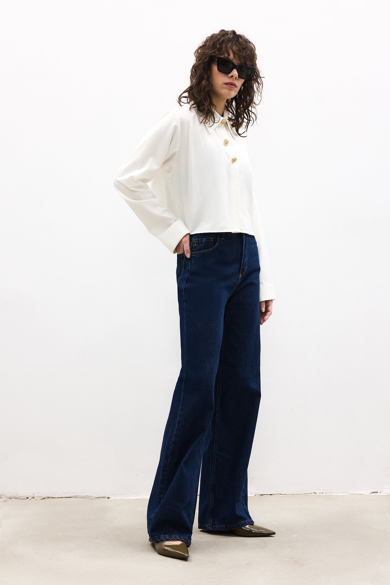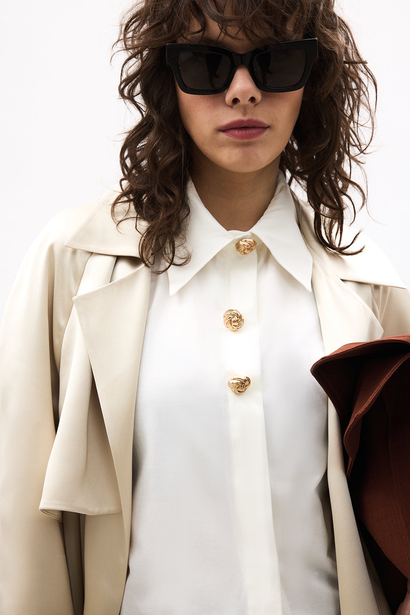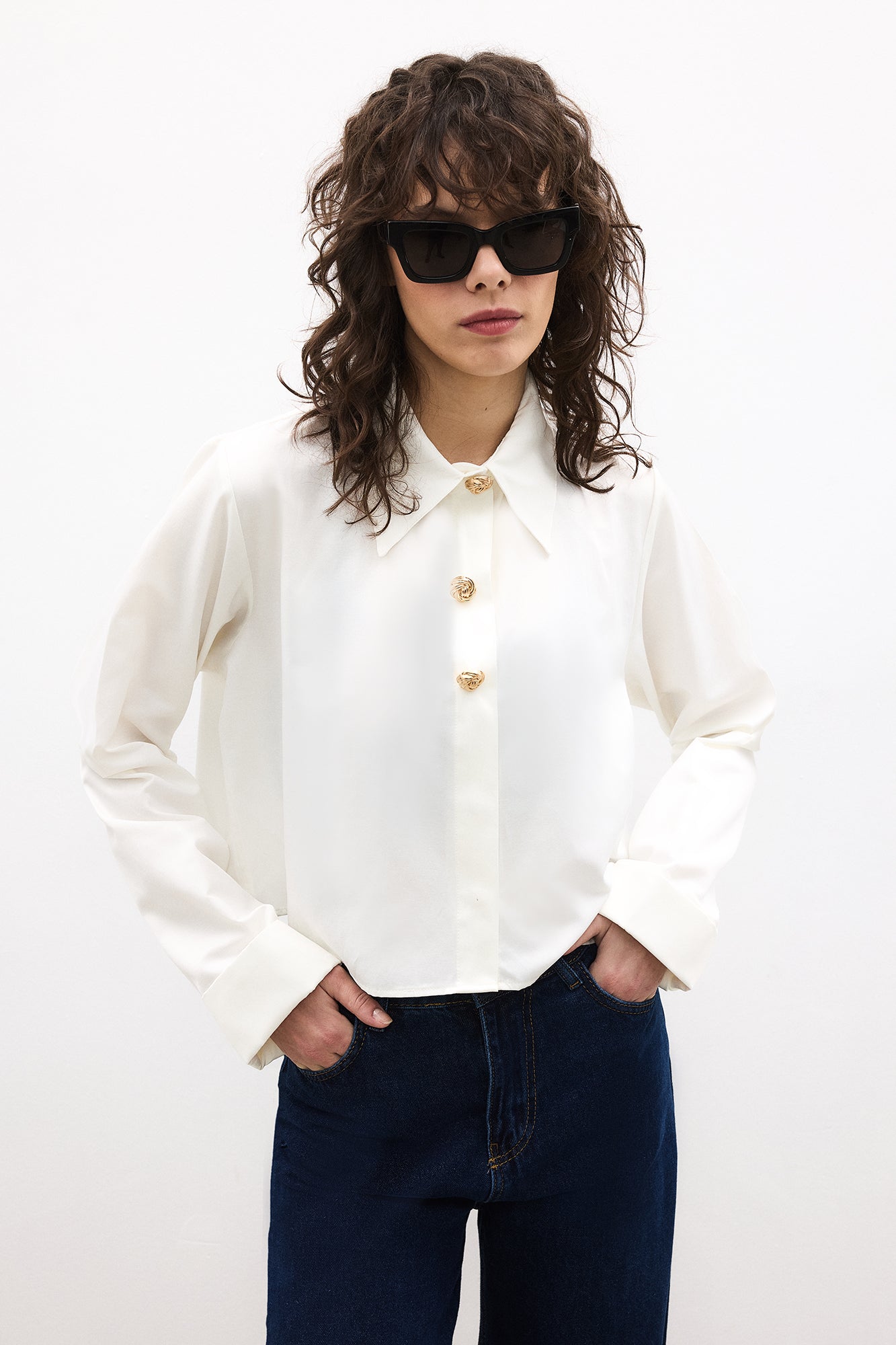 Gömlek yaka. Önde dekoratif gold düğme detaylı kapama. Uzun kol ve manşetli kol ucu.