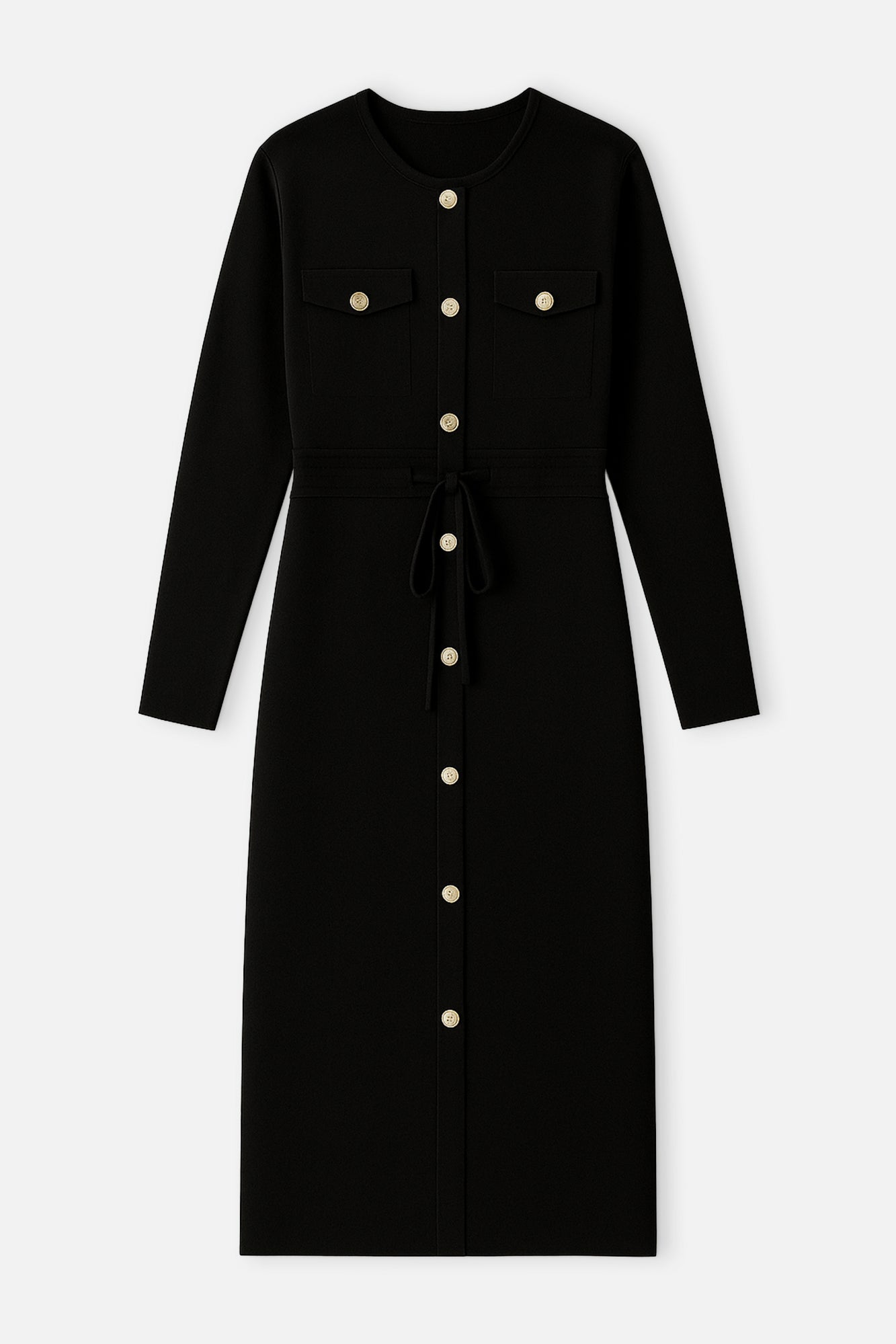 Bisiklet yaka. Uzun kollu. Gold düğme aksesuarlı. Belden bağlamalı.