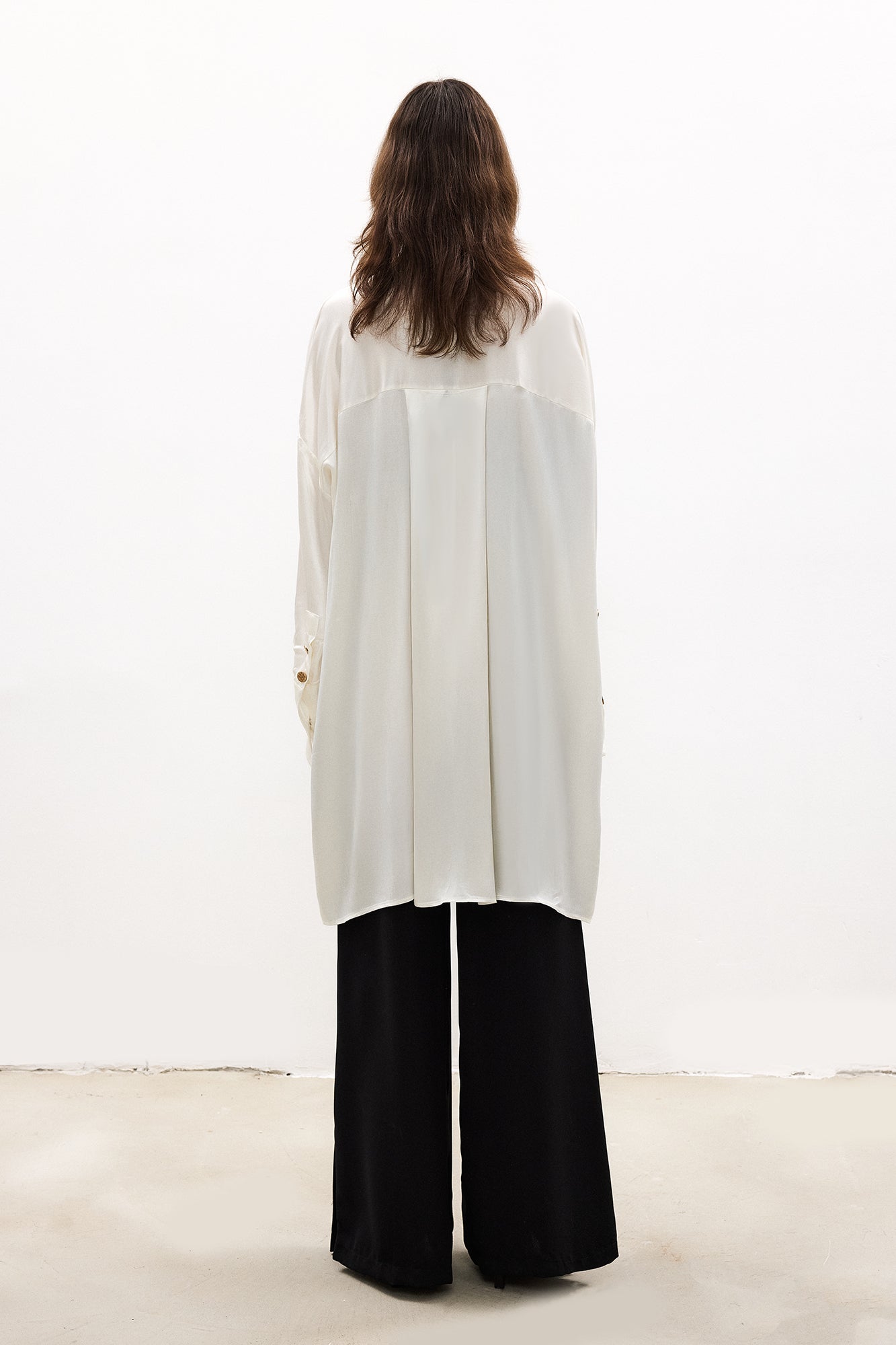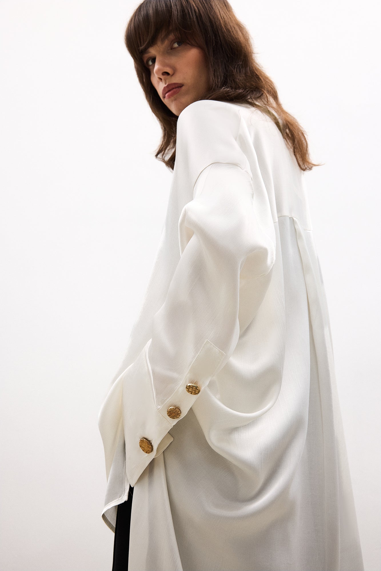 Gizli patlı, düğmeli ön kapama. Arka orta pile detayı. Gömlek yaka. Düşük omuzlu. Uzun kol. Manşetlerde gold düğme detaylı.