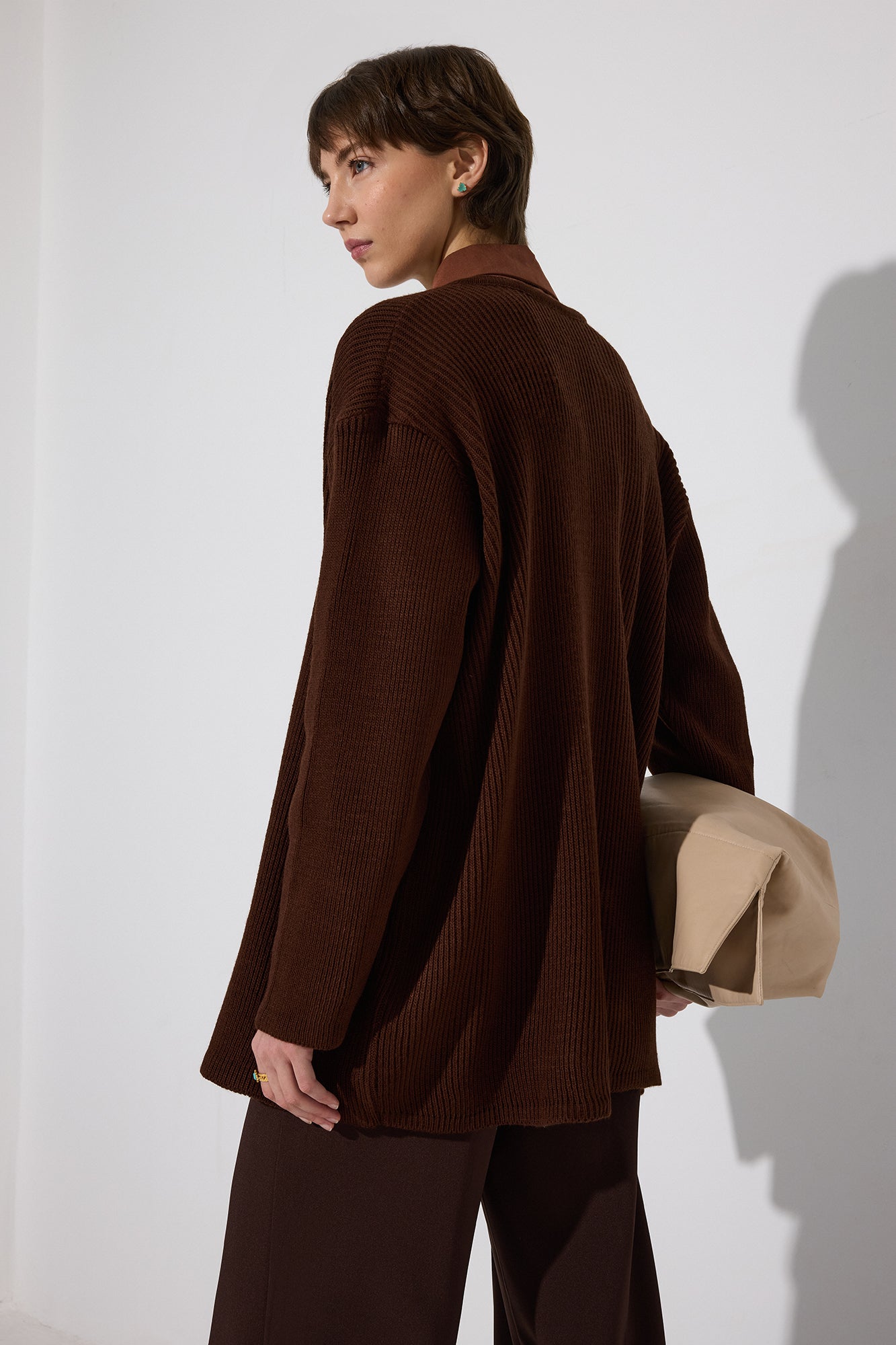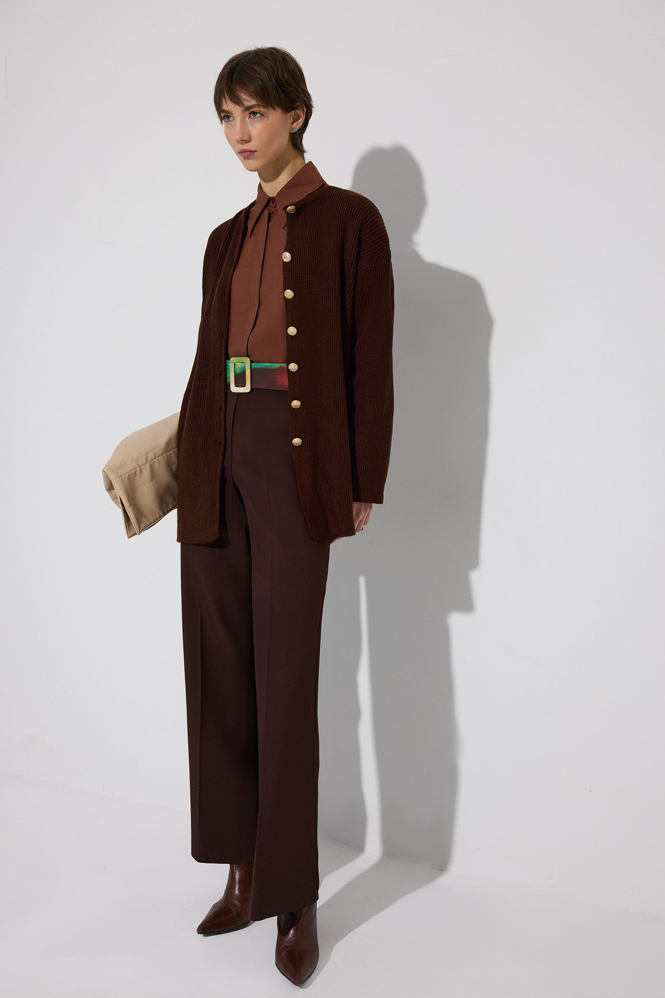 Bisiklet yaka. Düşük omuz. Önden düğme kapamalı. Gold düğme detaylı. Uzun boy.