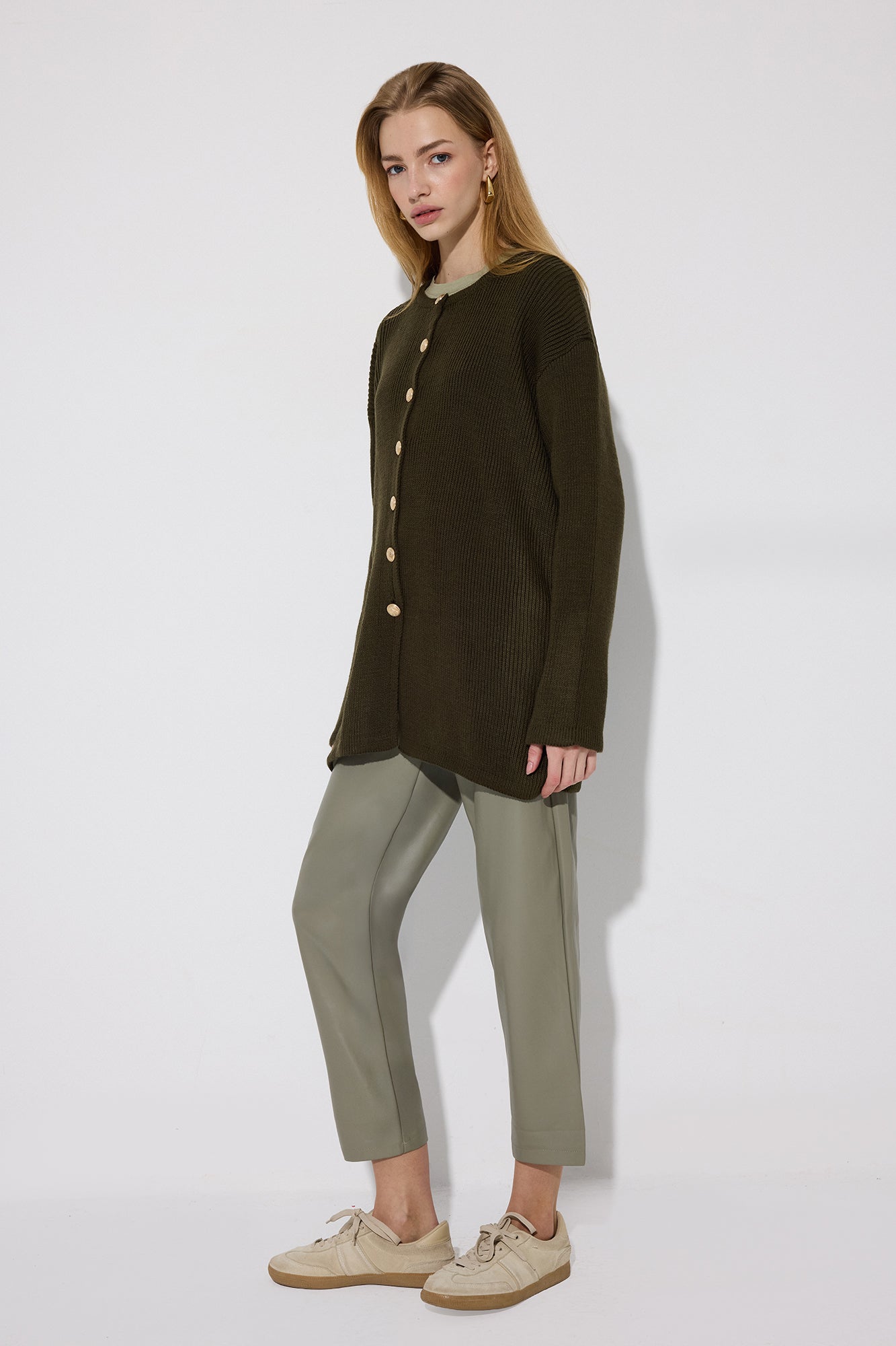 Bisiklet yaka. Düşük omuz. Önden düğme kapamalı. Gold düğme detaylı. Uzun boy.