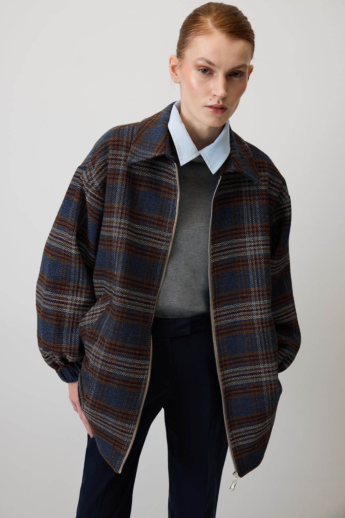 Ekose desenli fermuarlı. Yan cepli. Rahat kesim.