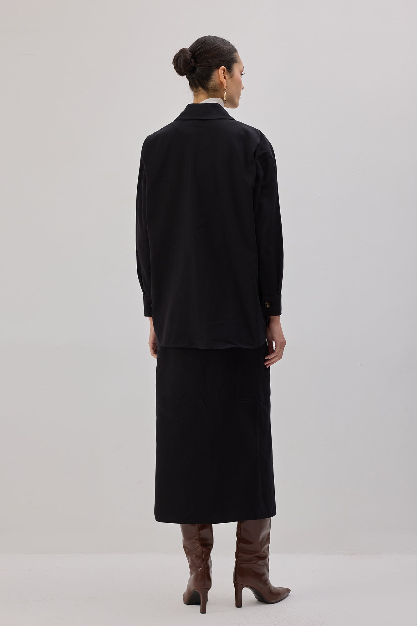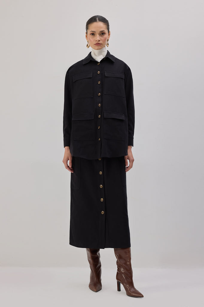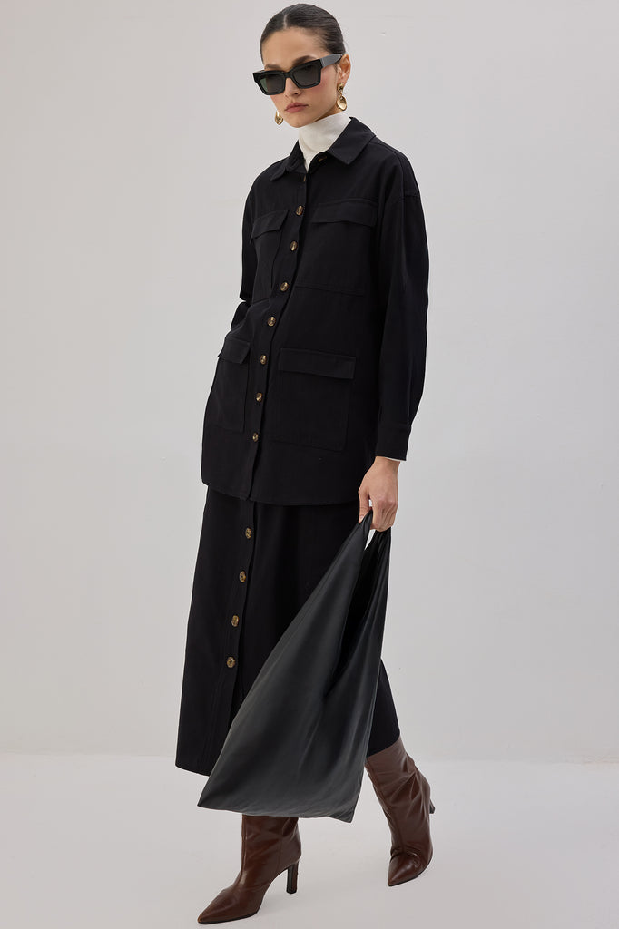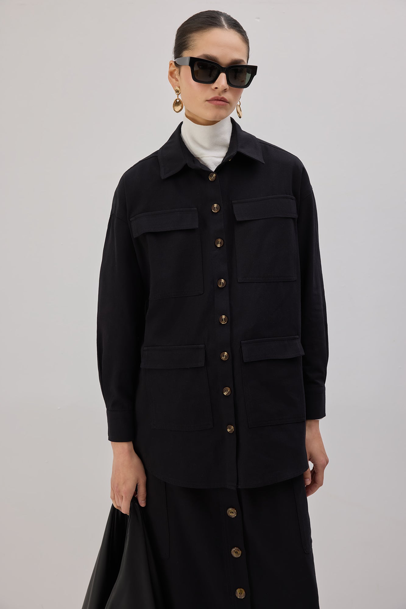 Gömlek yakalı. Önden düğme kapamalı. Cepli. Gabardin ceket.