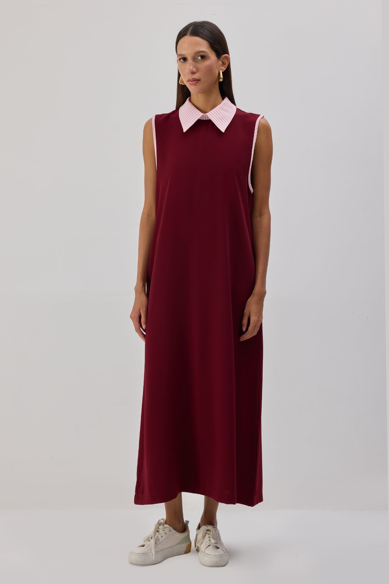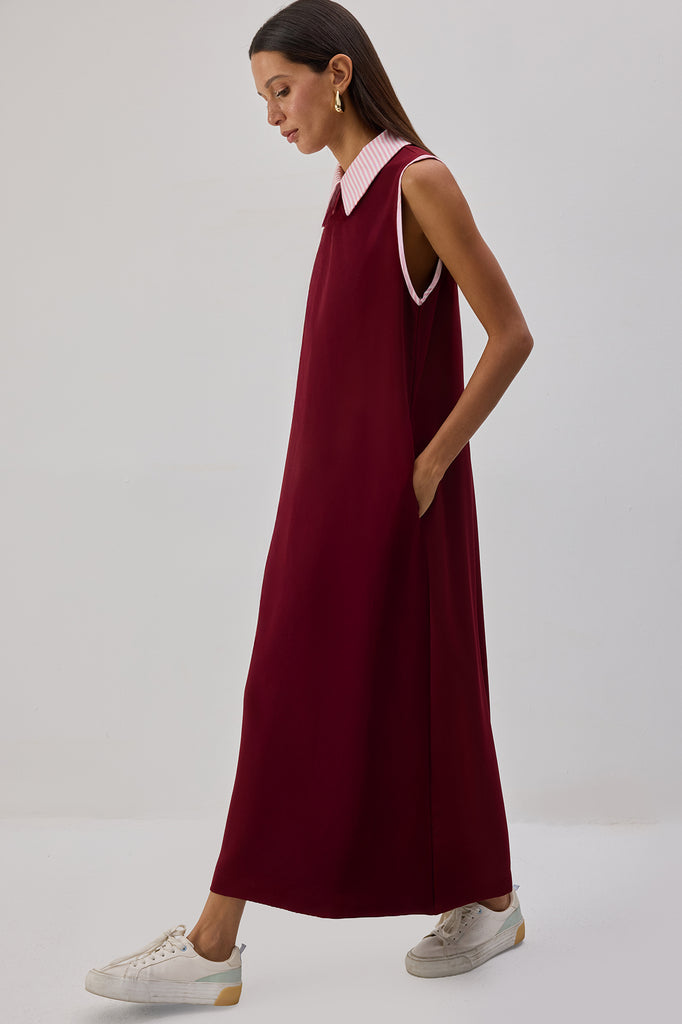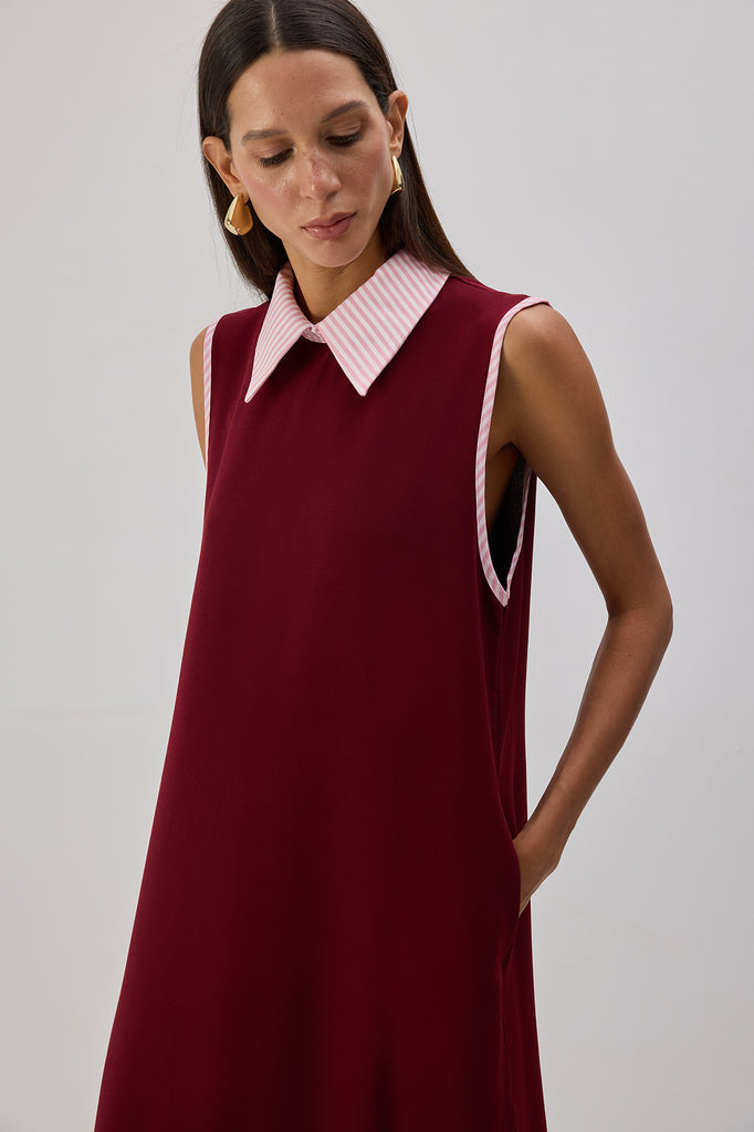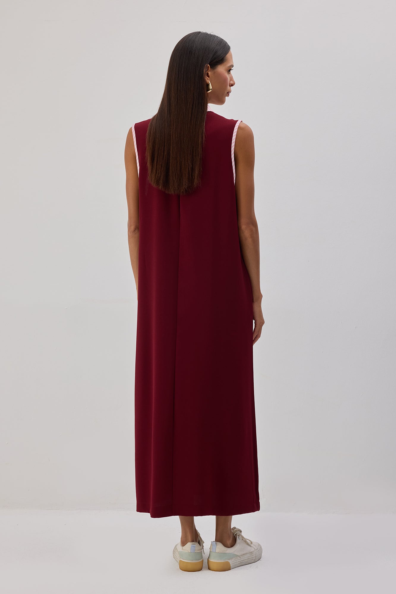 Kolsuz. Gömlek yaka. Yanlarda gizli cep. Arka fermuar kapamalı. Kol ve yaka çevresinde kontrast biye detaylı.