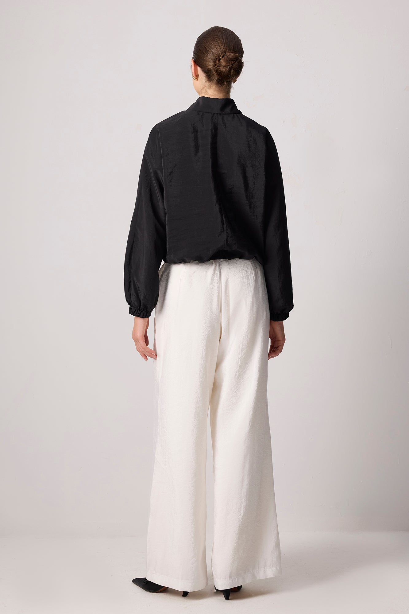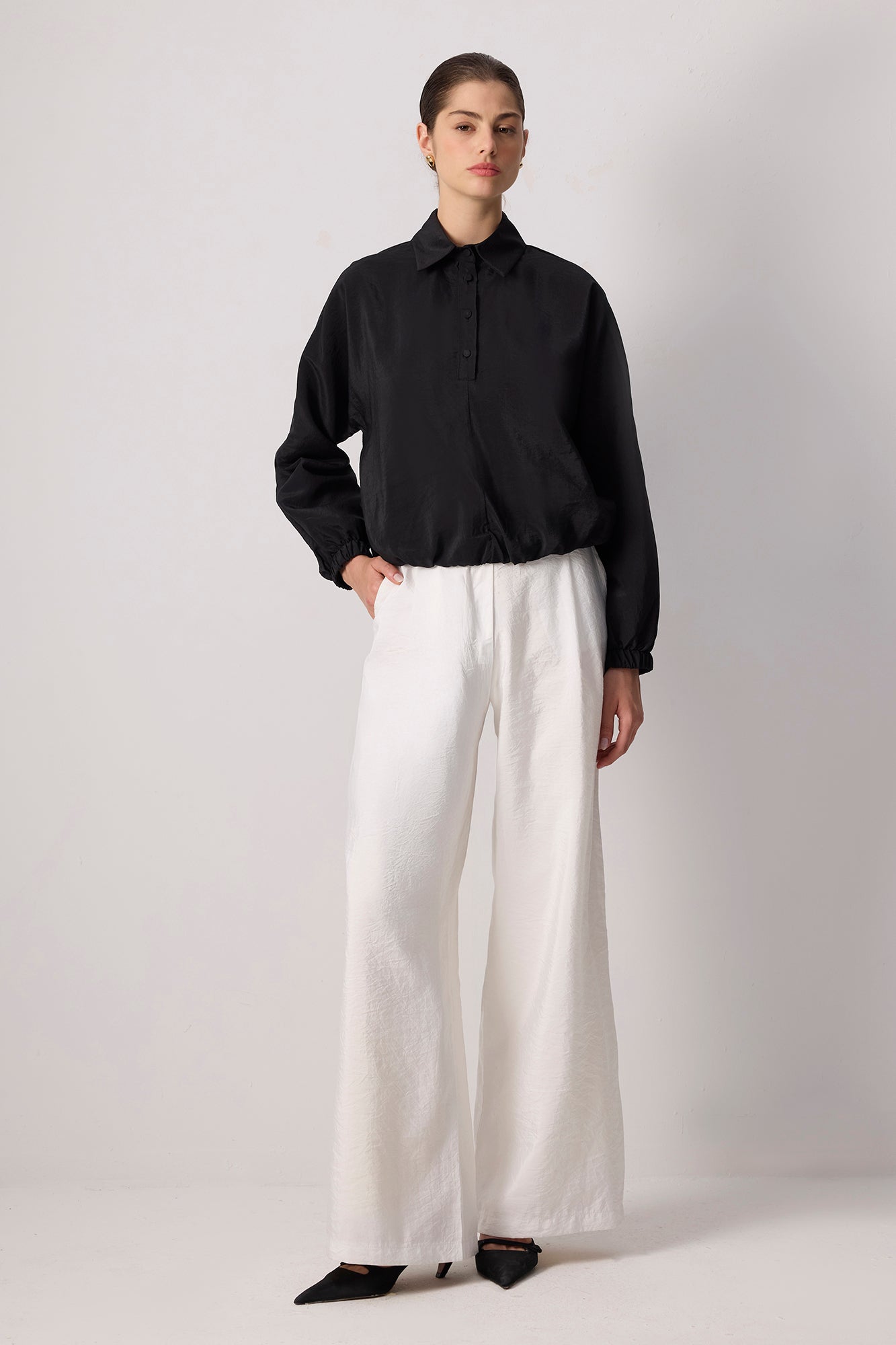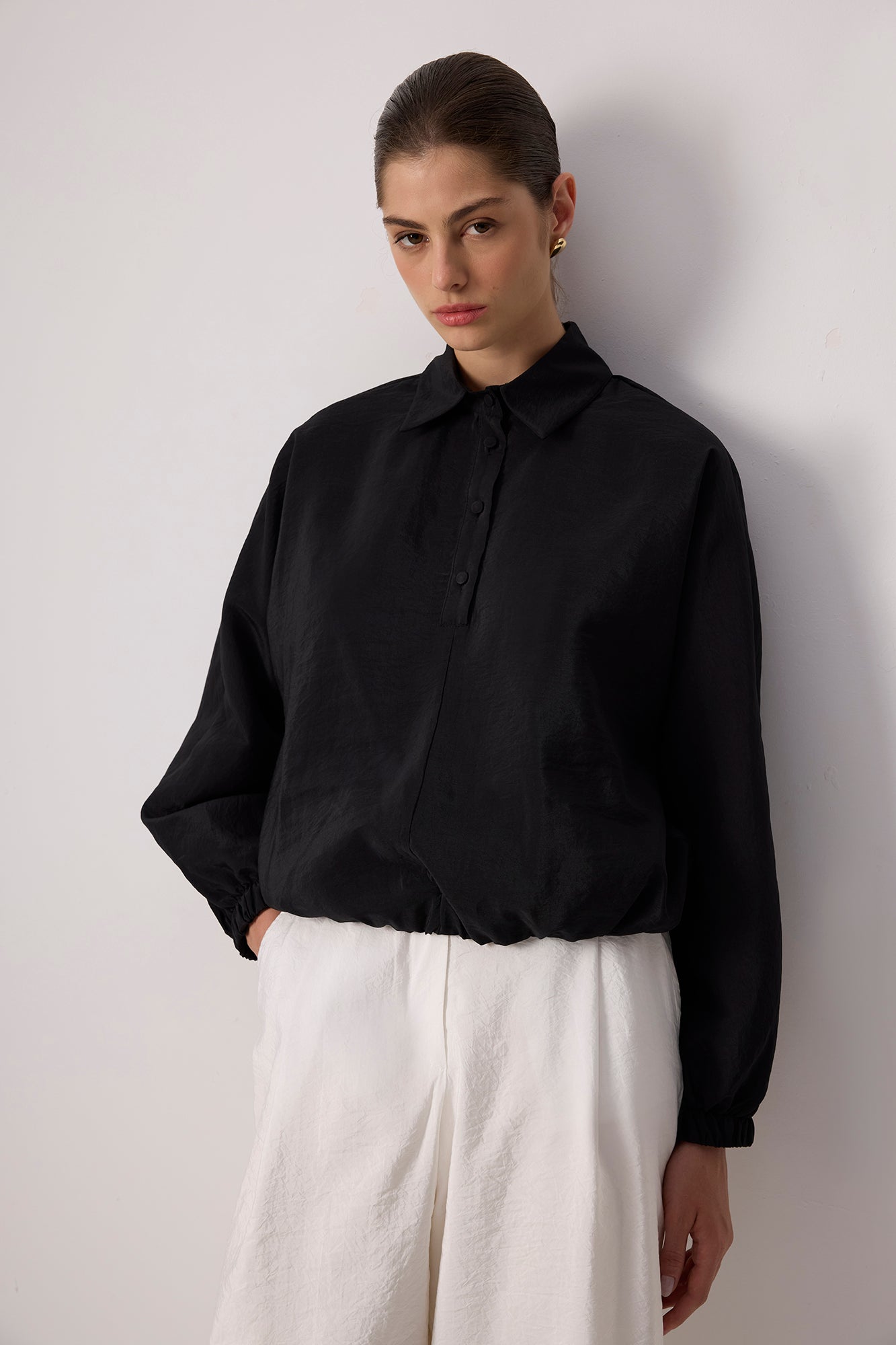 Kupra. Gömlek yaka. Düğme kapamalı. Elastik etek ucu ve manşet.