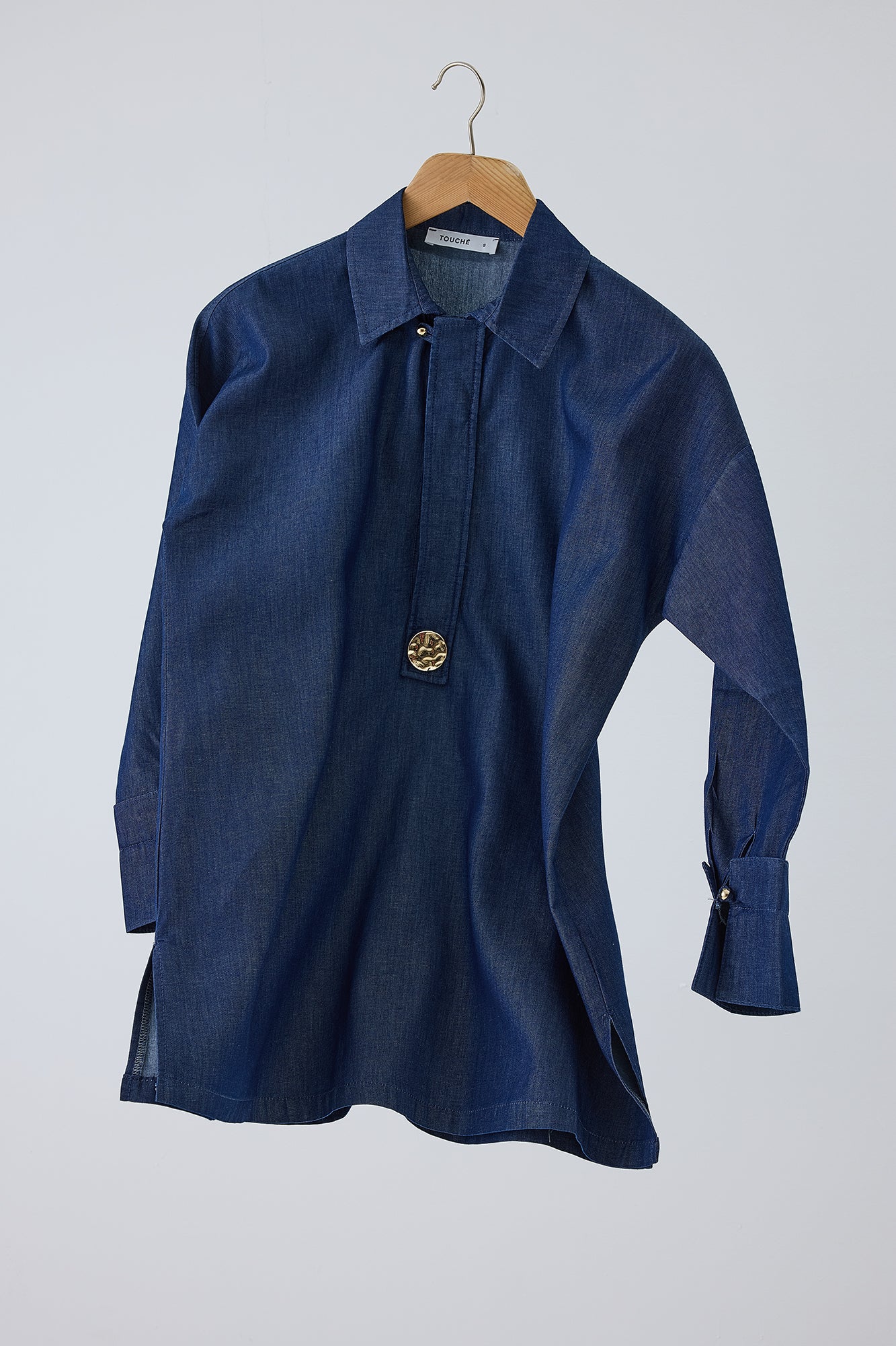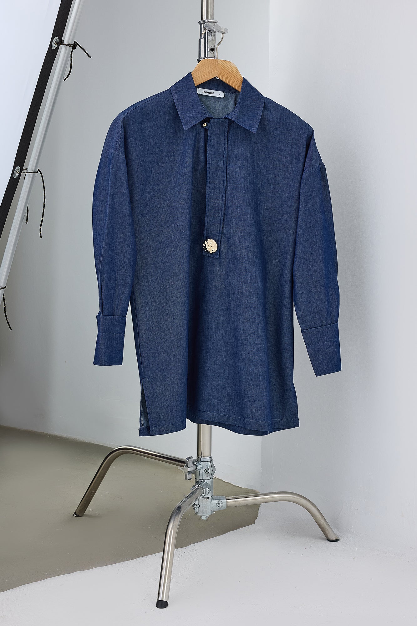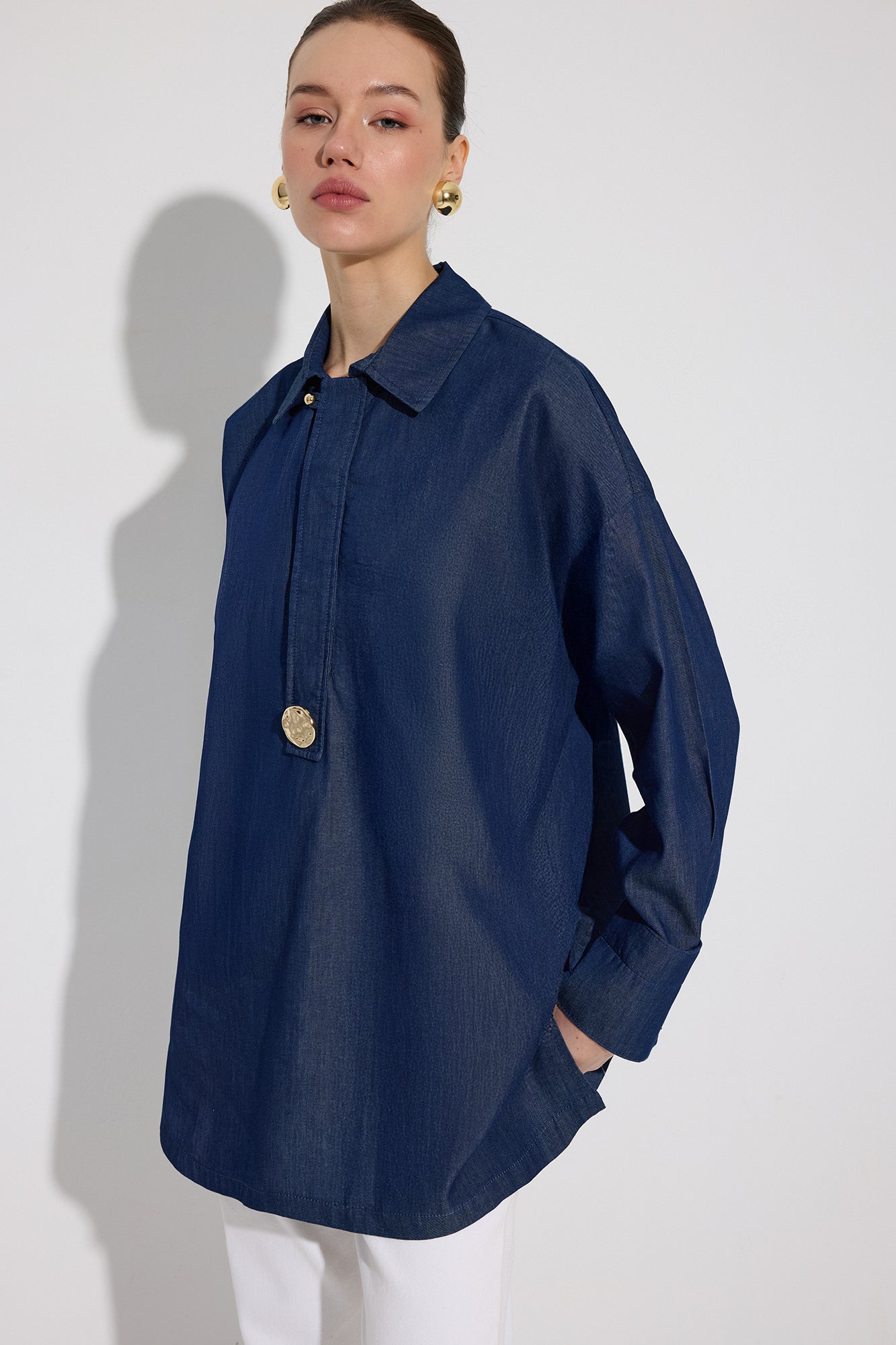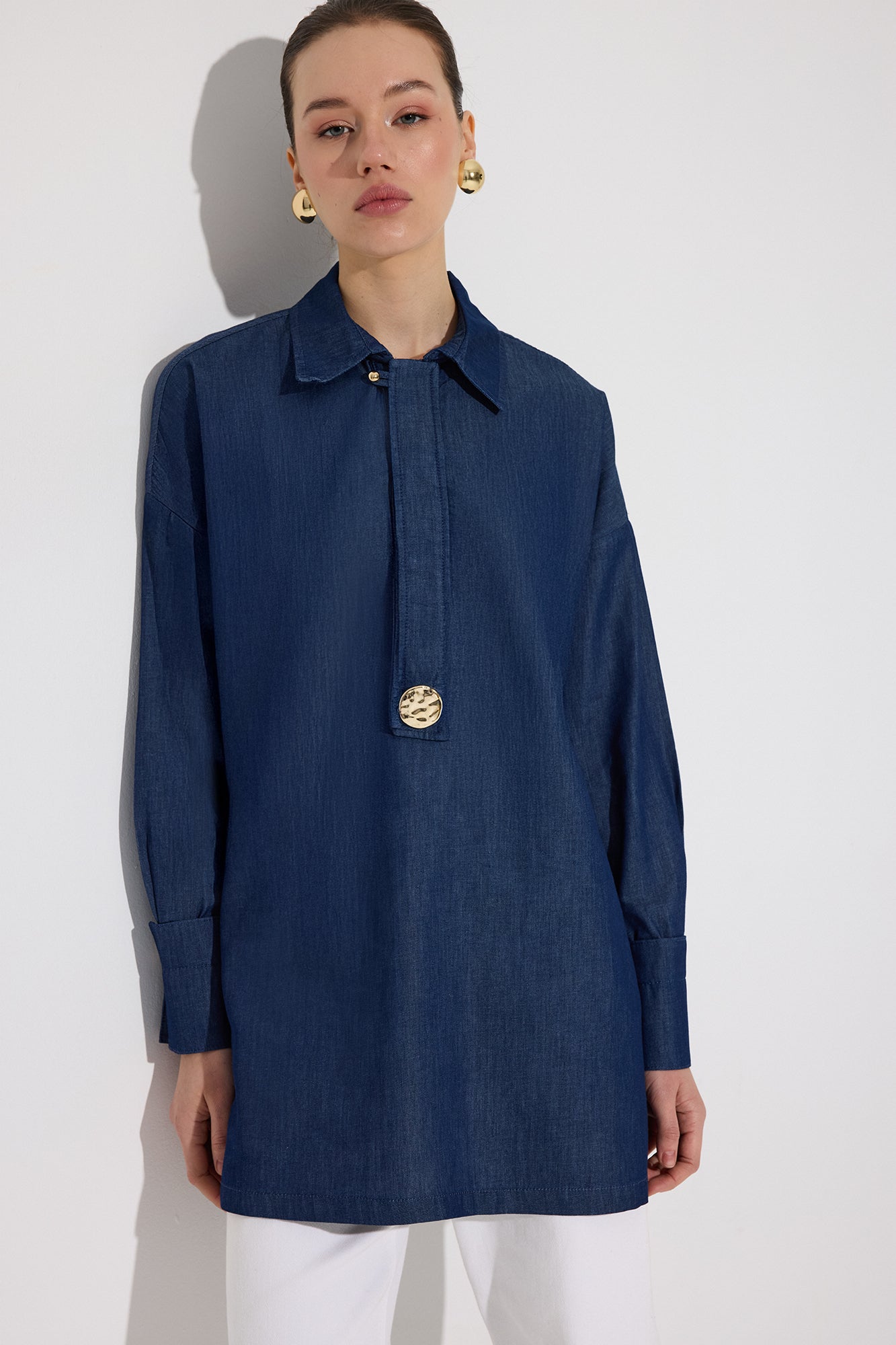 Gömlek yaka. Uzun kollu. Yarım patlı düğme kapama. Manşetli kol ucu.