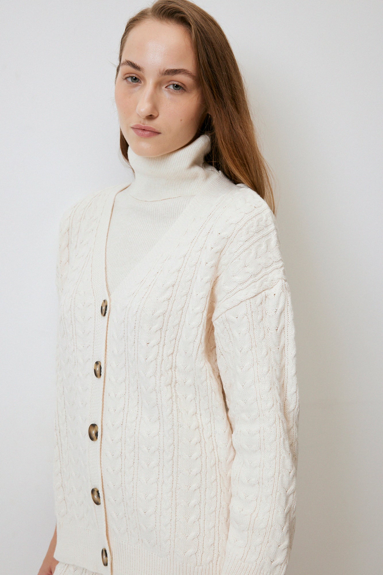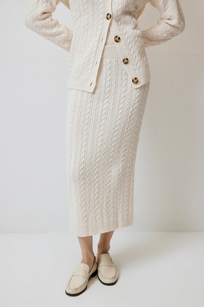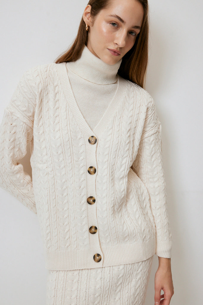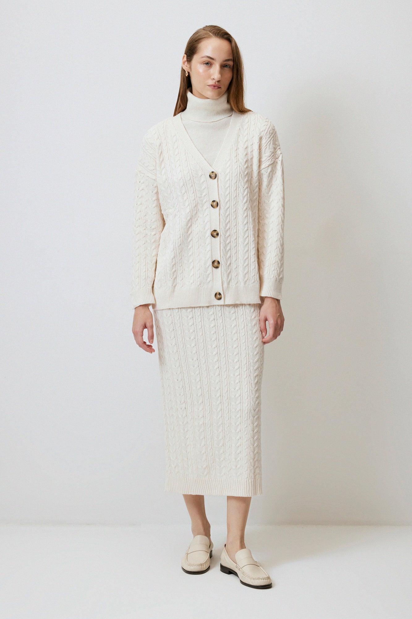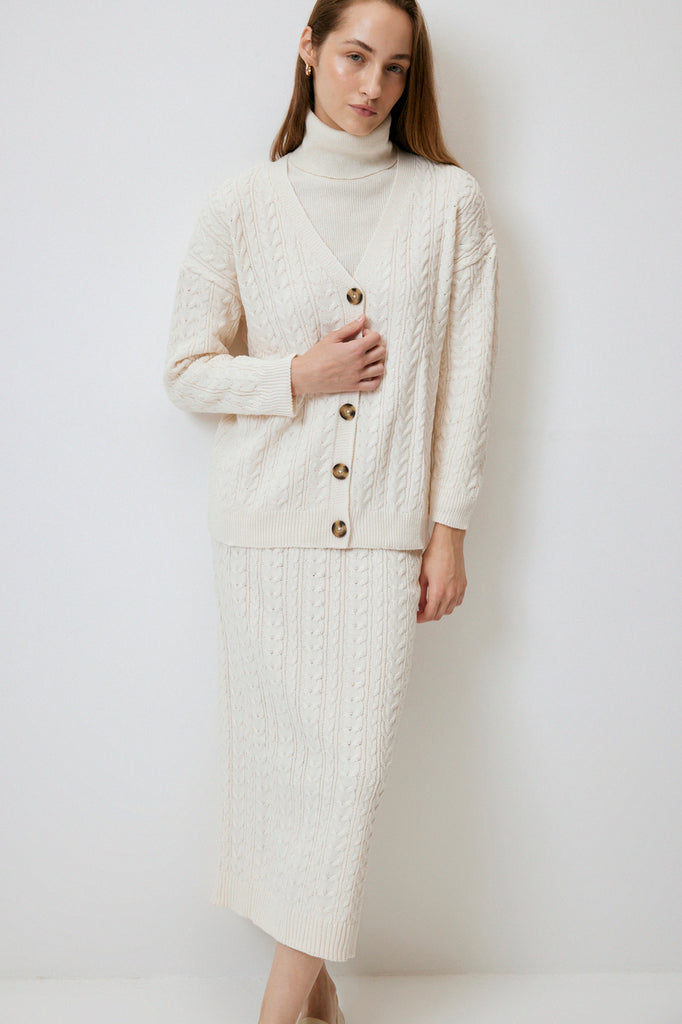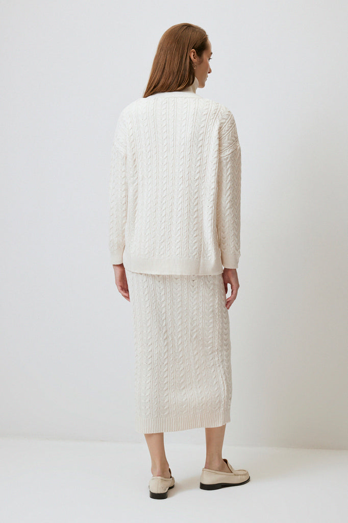 V yaka. Uzun kollu. Düşük omuzlu. Önden düğme kapamalı. Triko hırka. Uzun boy, Triko etek takım.