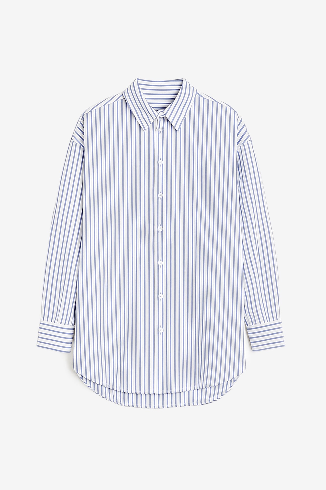 Gömlek yaka. Uzun kollu ve manşetleri düğme kapamalı. Çizgili. Oversize. Önden düğme kapamalı.