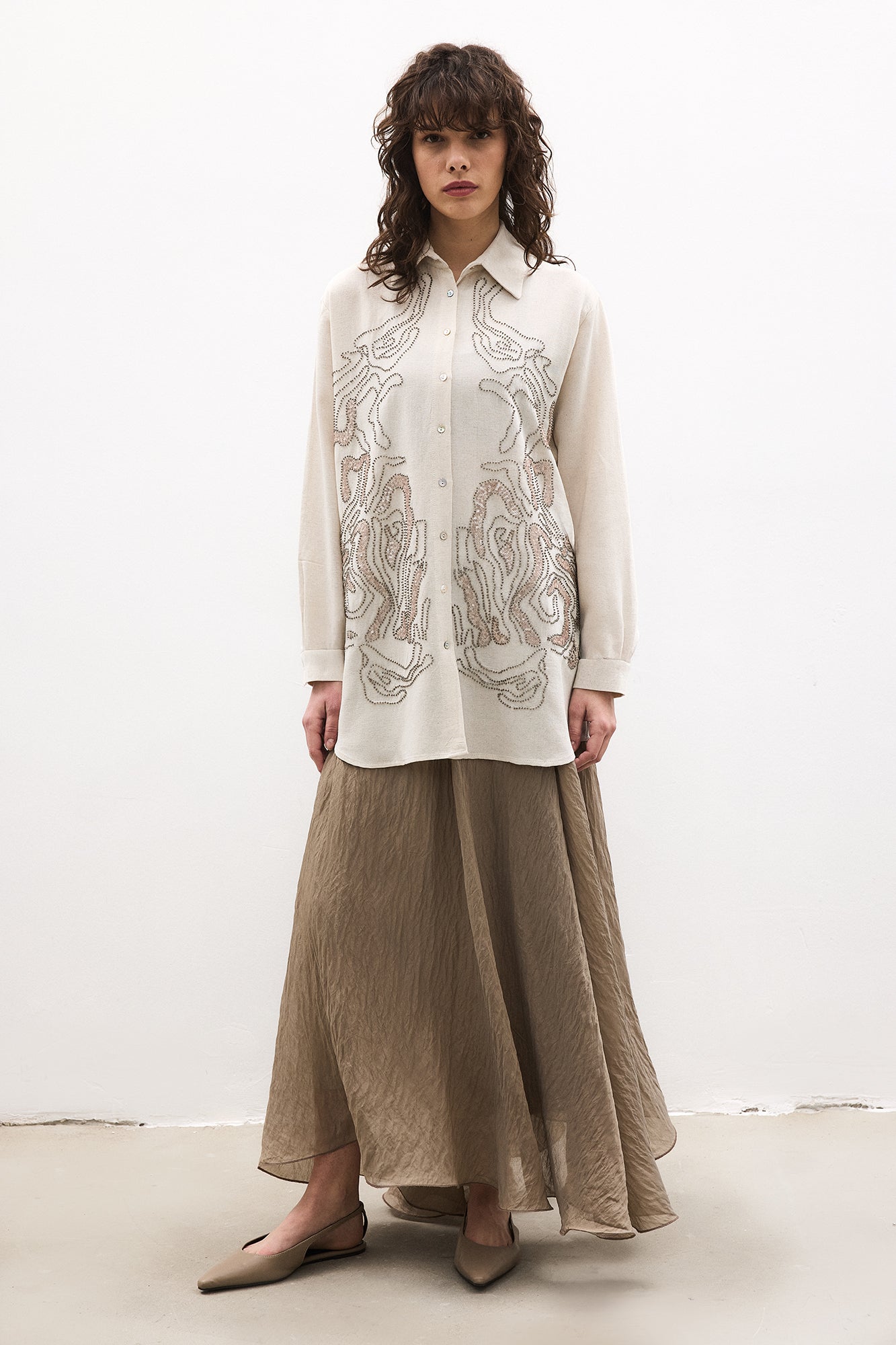 Gömlek yaka. Uzun kollu. Önü düğme kapamalı. Ön panelde boncuk işlemeli. Keten gömlek.