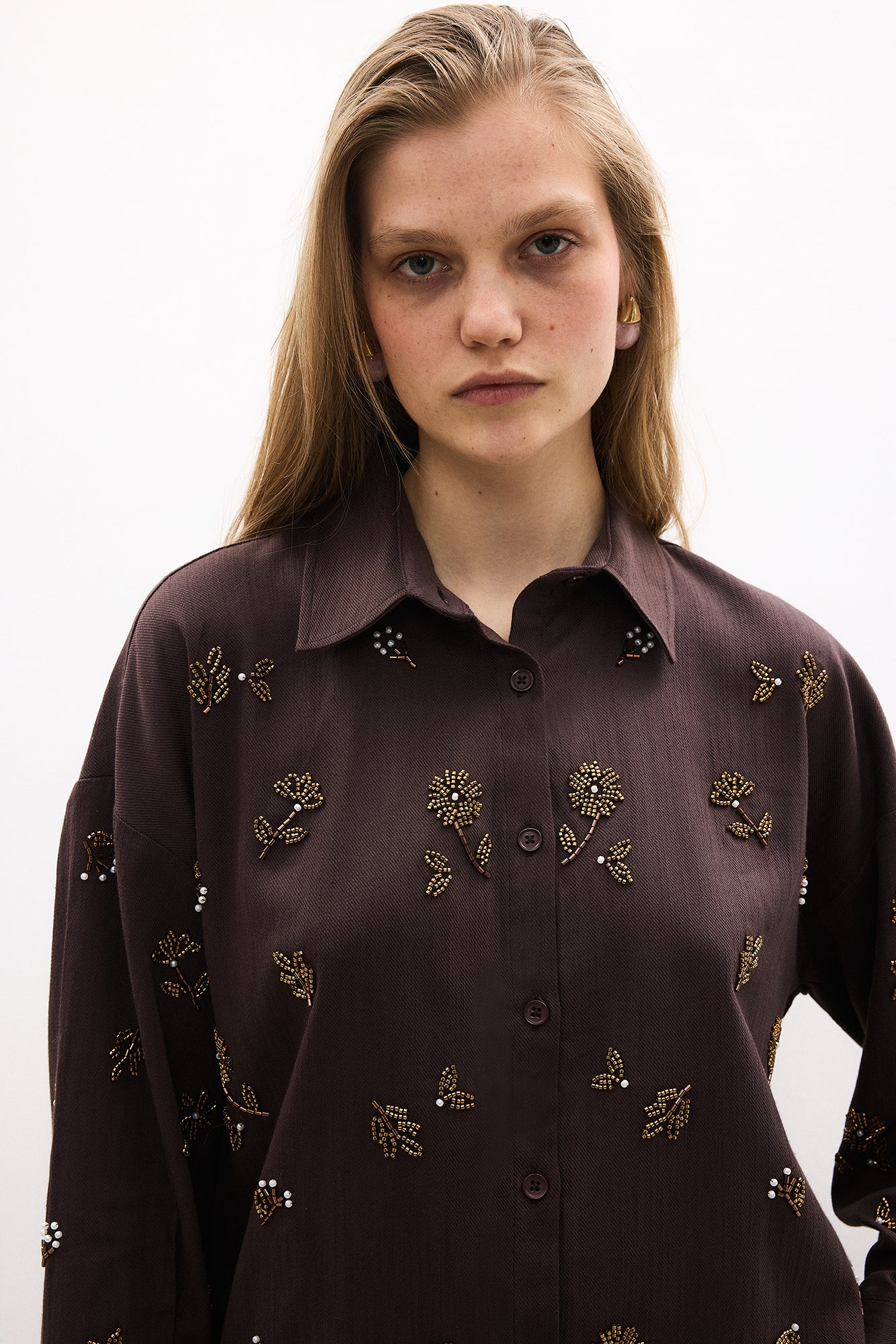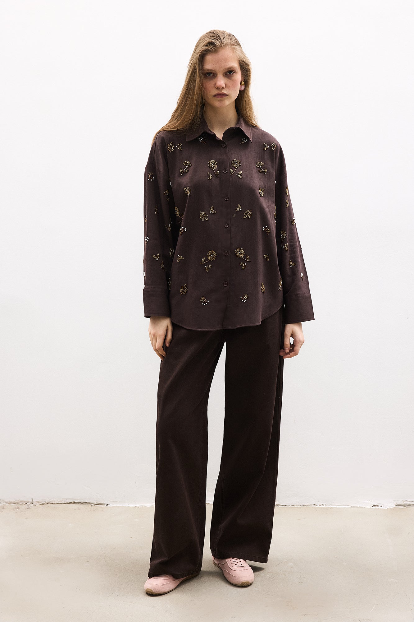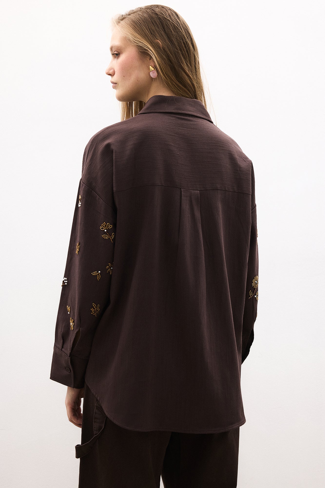 Gömlek yaka. Önden düğmeli kapama. Düşük omuz. Uzun kollu, manşetli. Boncuk işlemeli çiçek motifleri detaylı. Keten gömlek.