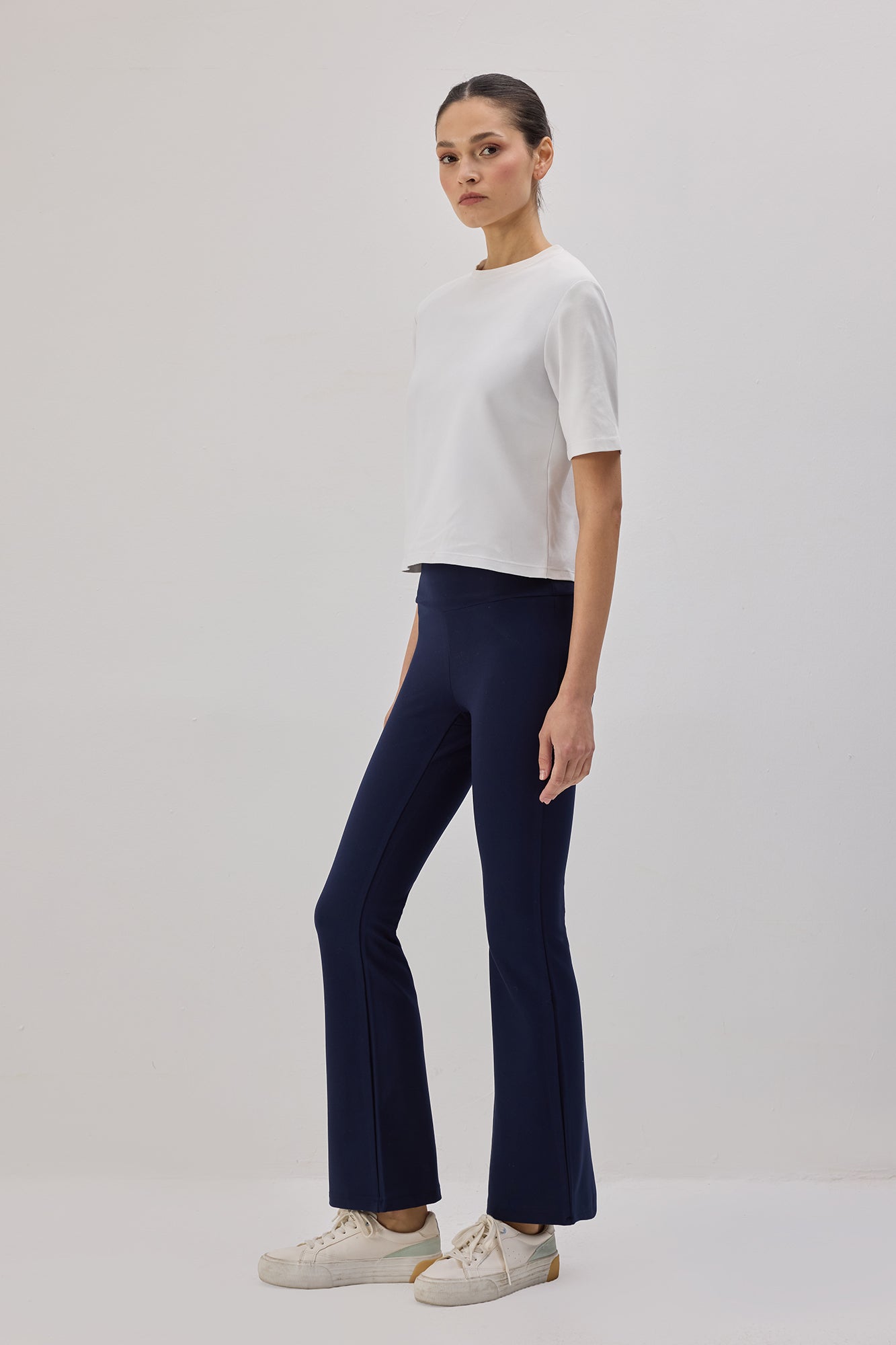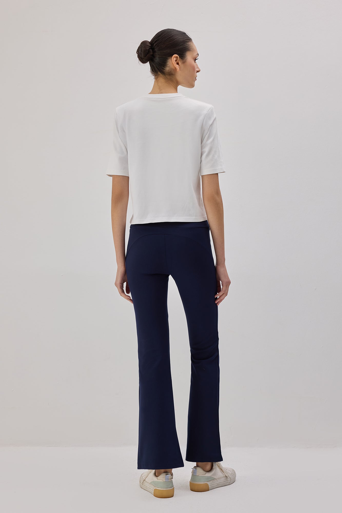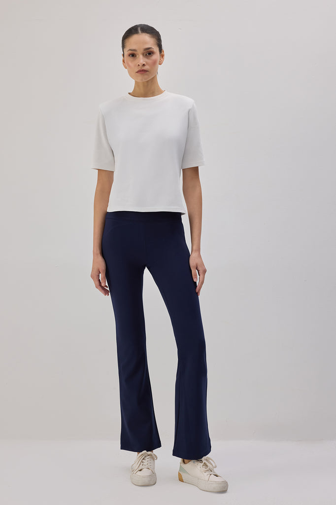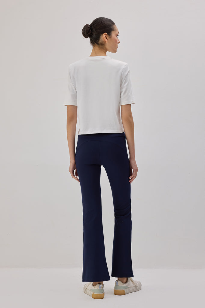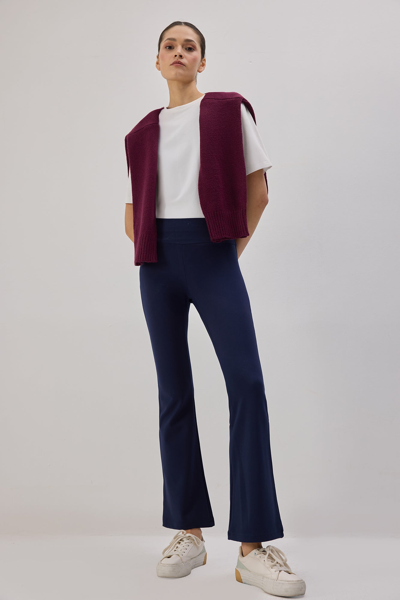 İspanyol paça. Geniş bantlı bel. Örme pantolon.