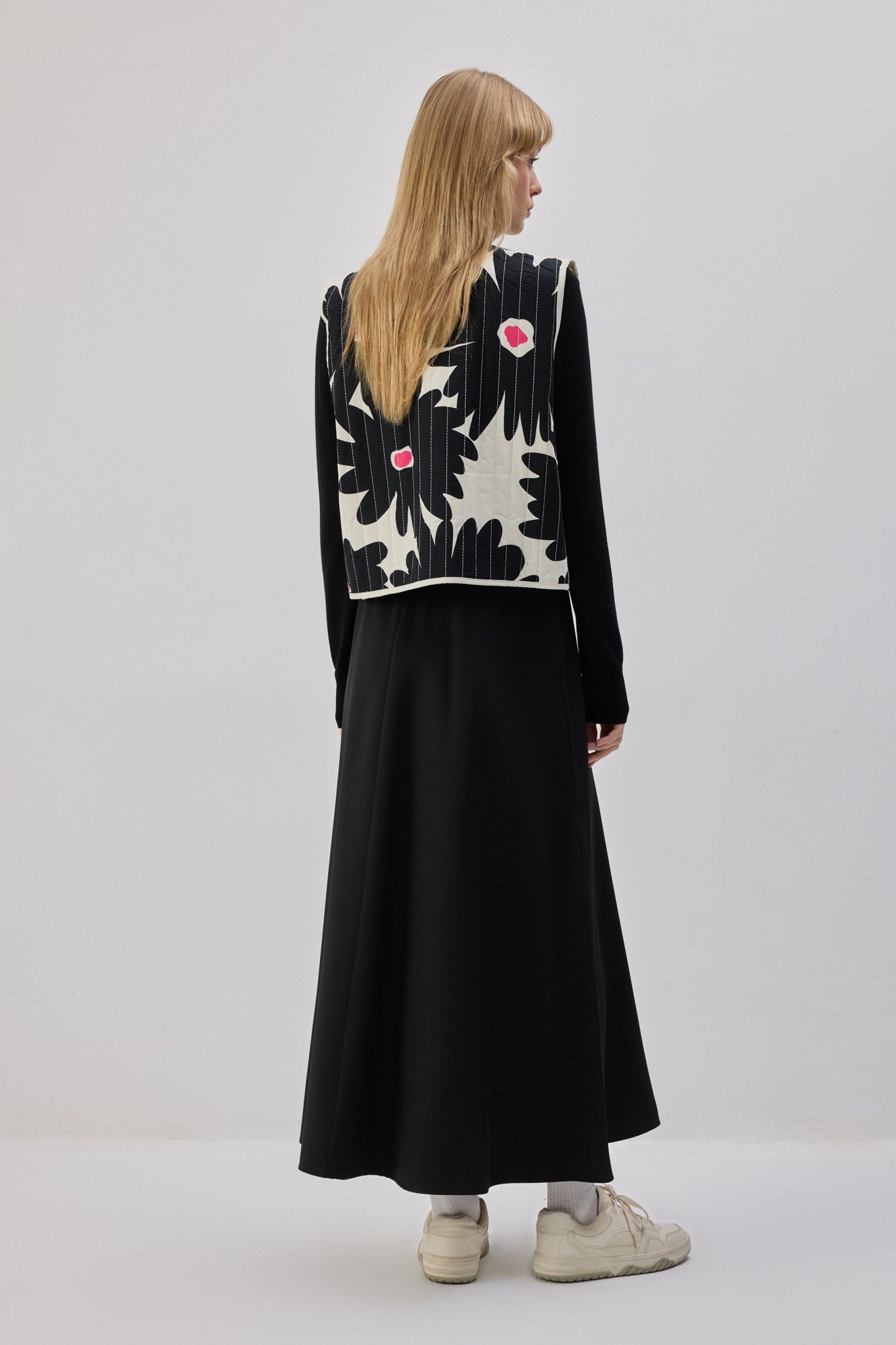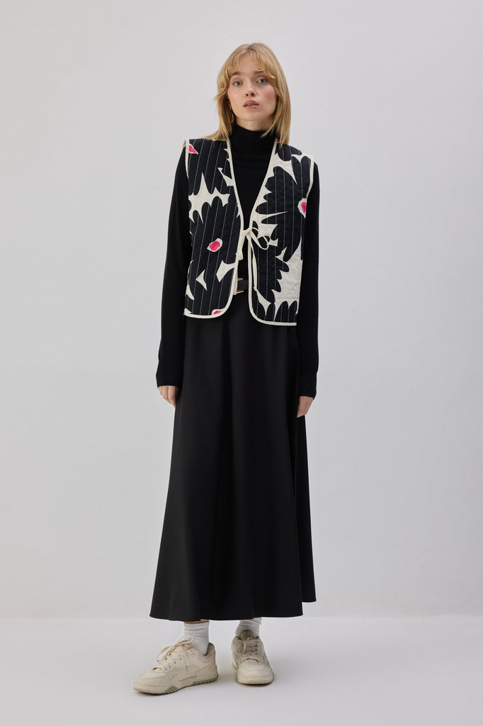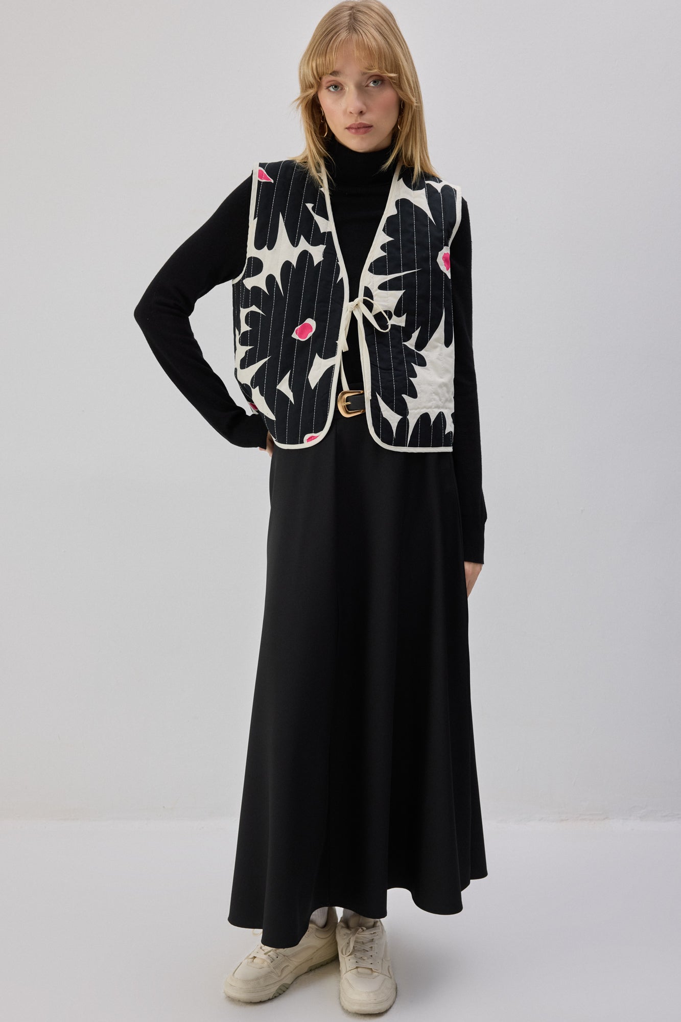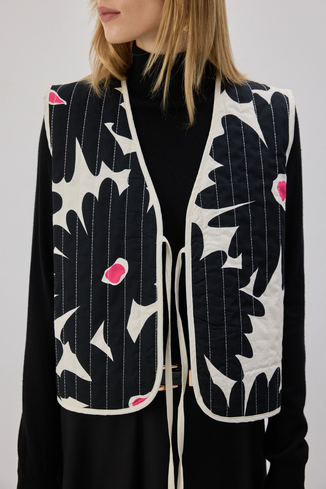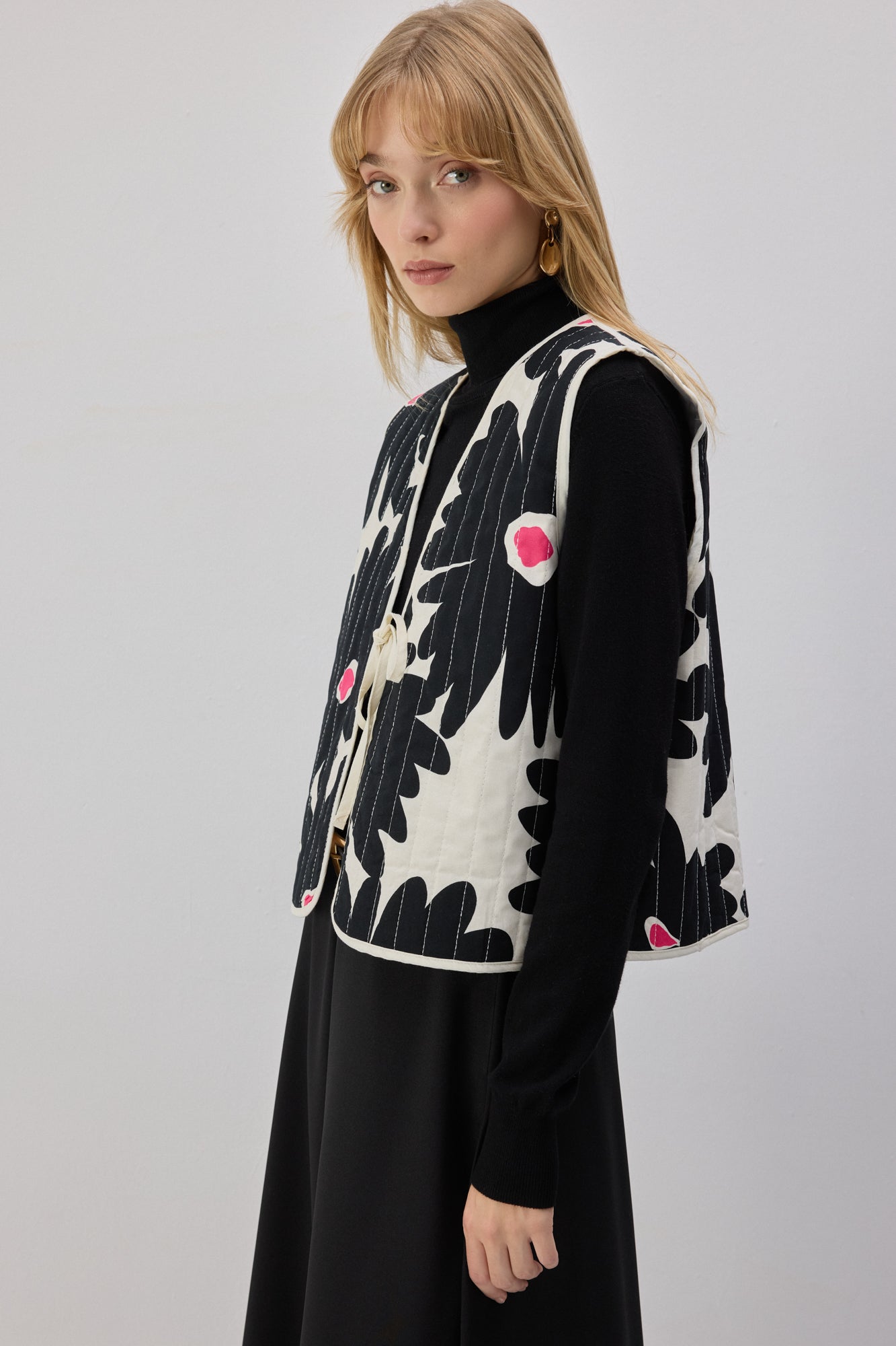 Bağcık kapamalı. Kolsuz. Desenli. Kapitone yelek.