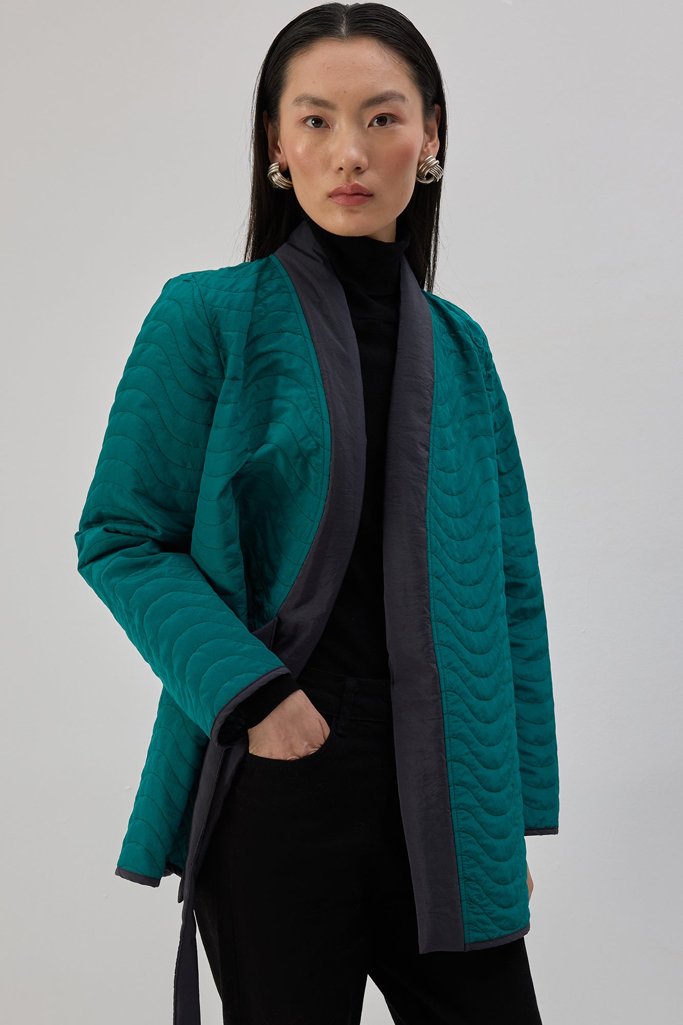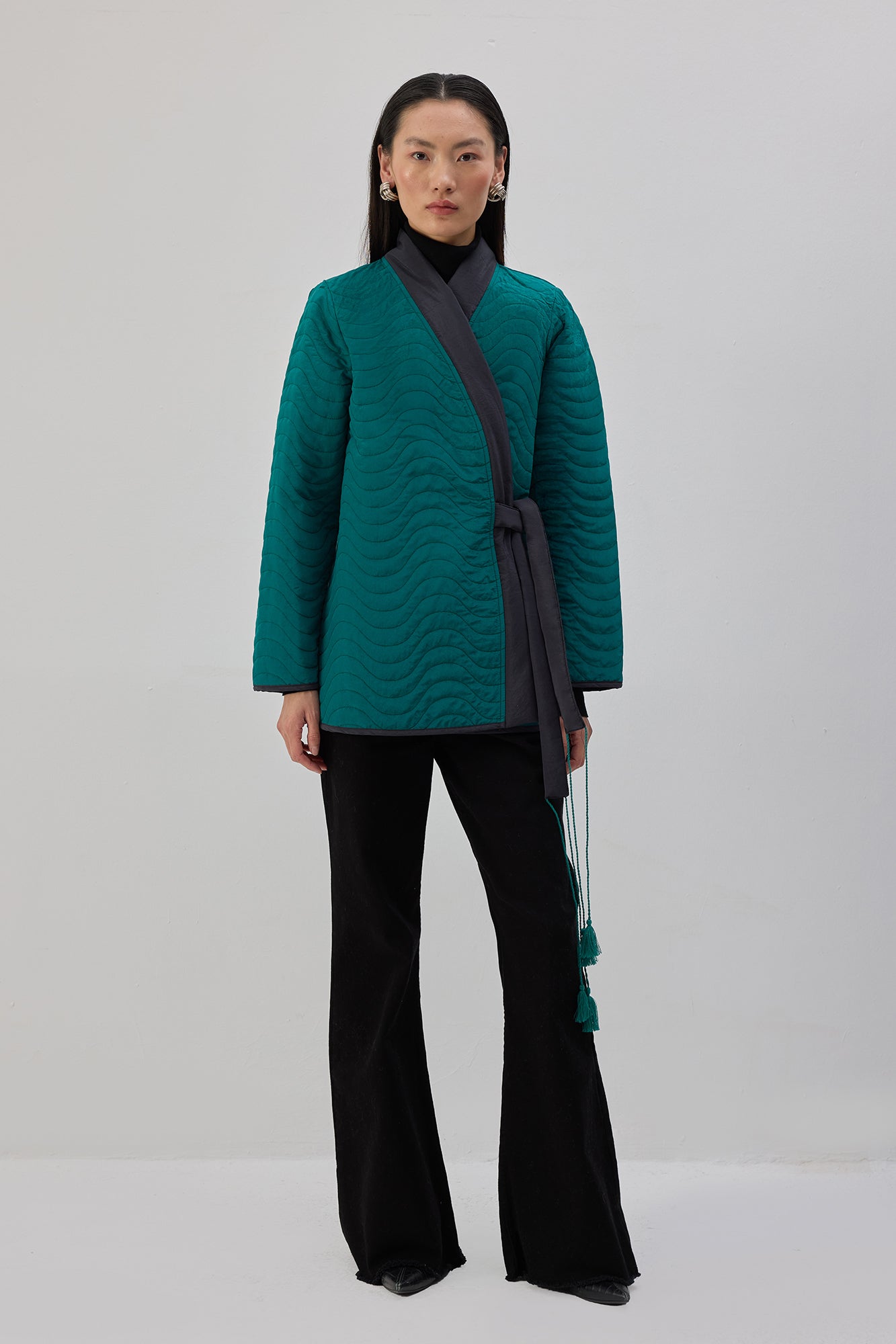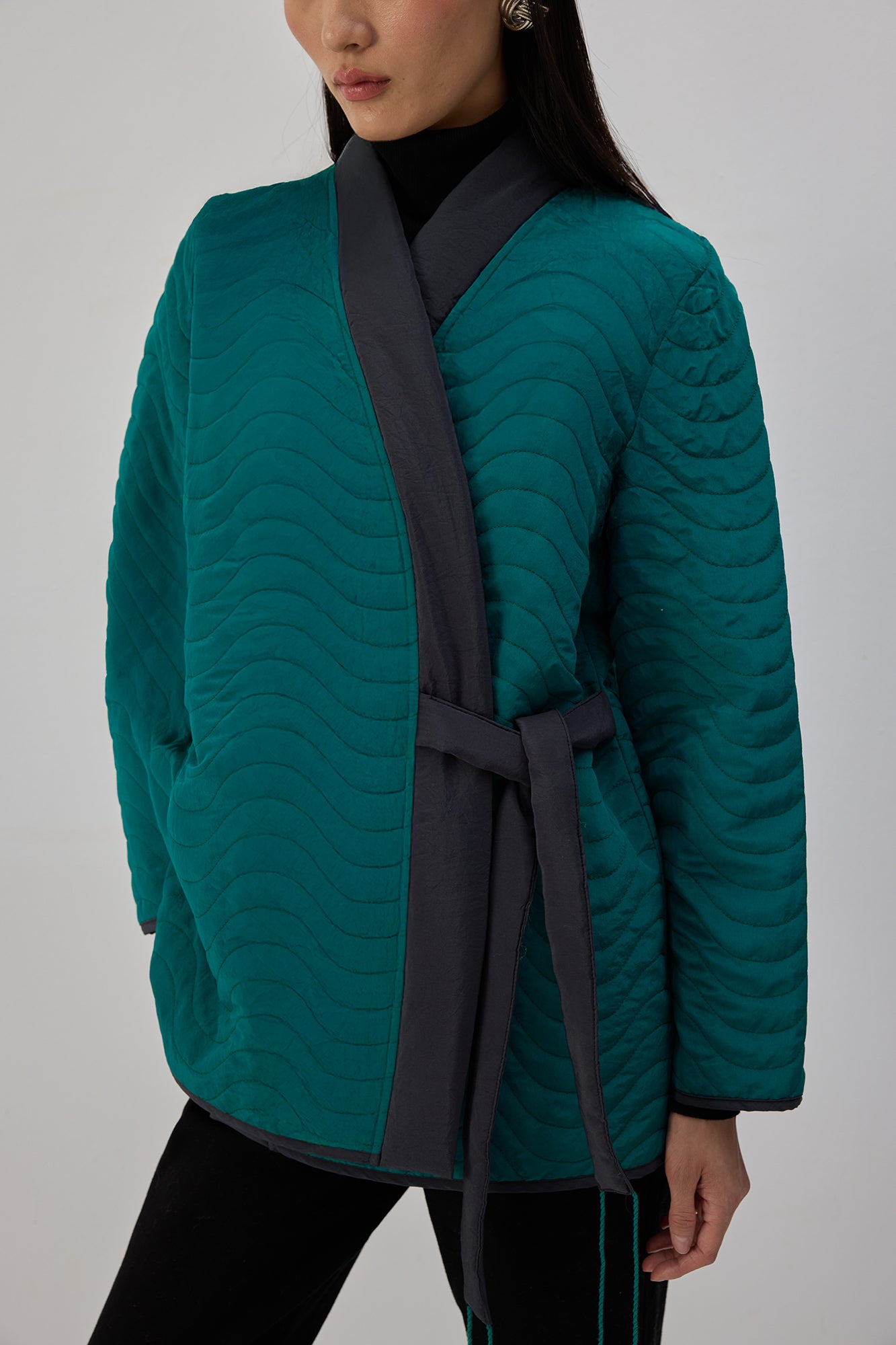 Kapitone dokulu. Uzun kollu. Bağlama detaylı ceket.