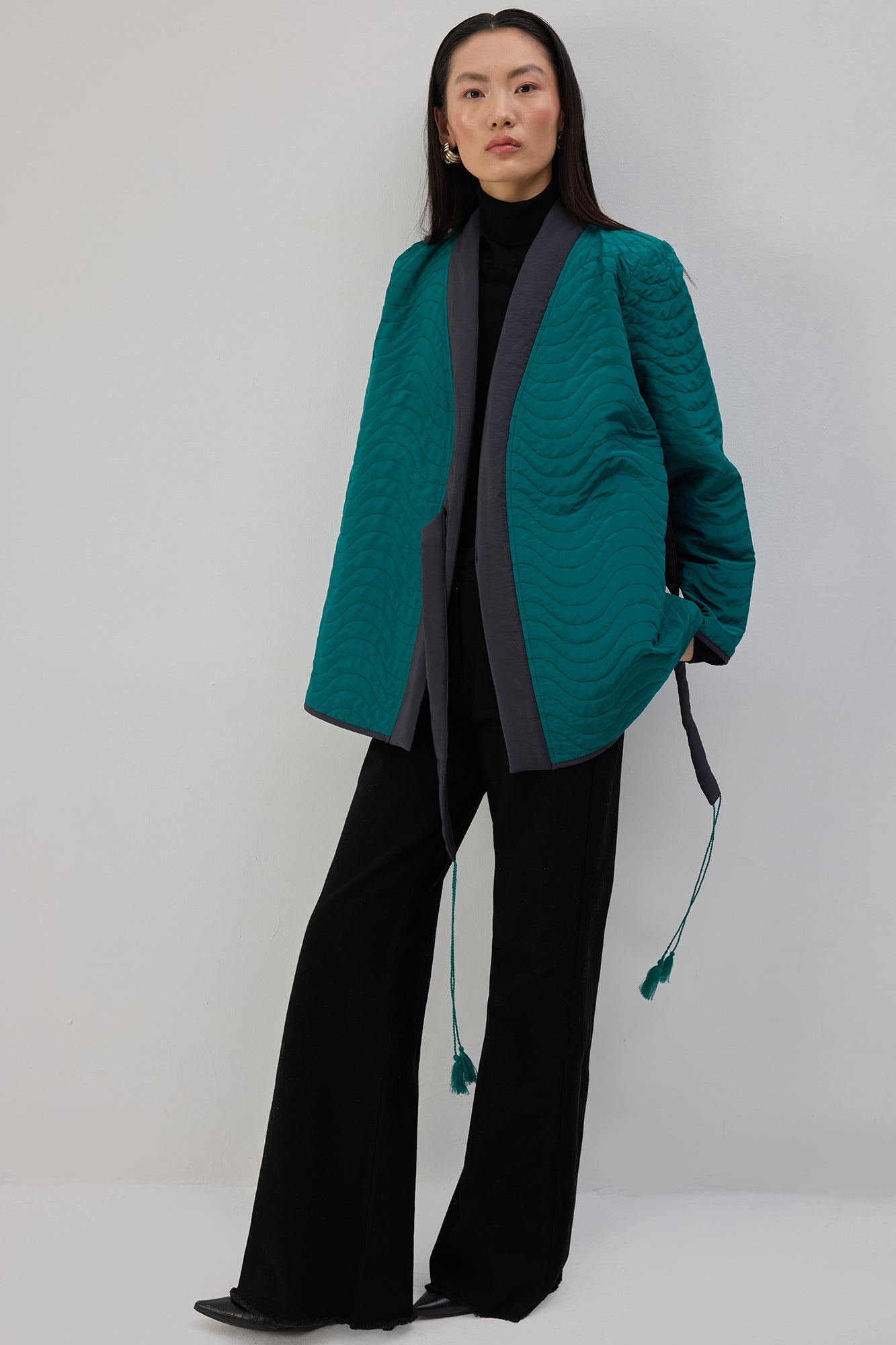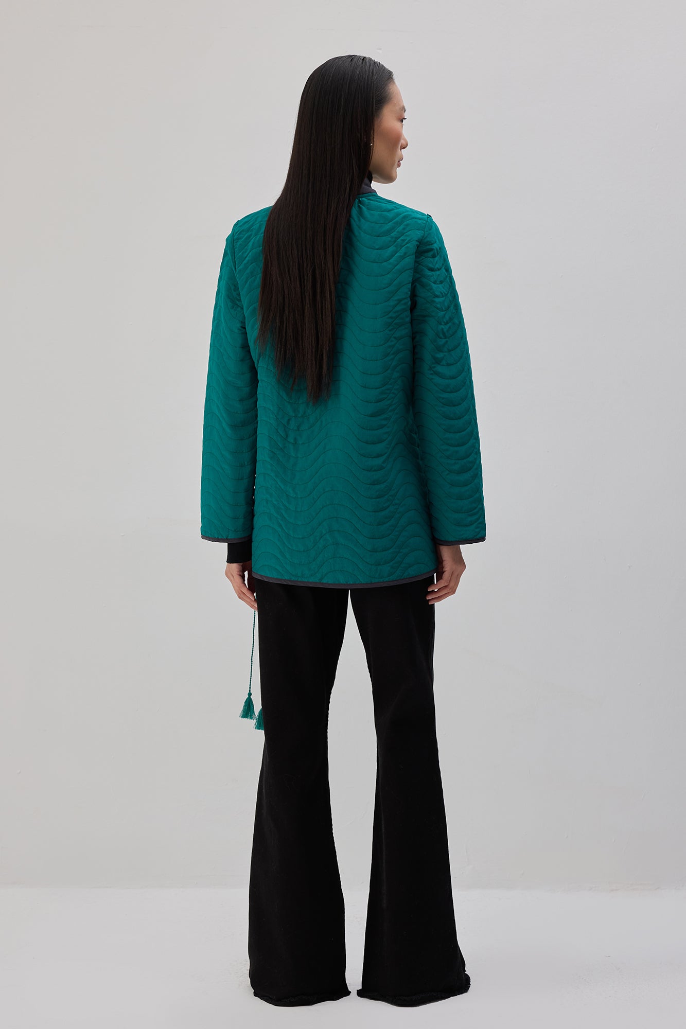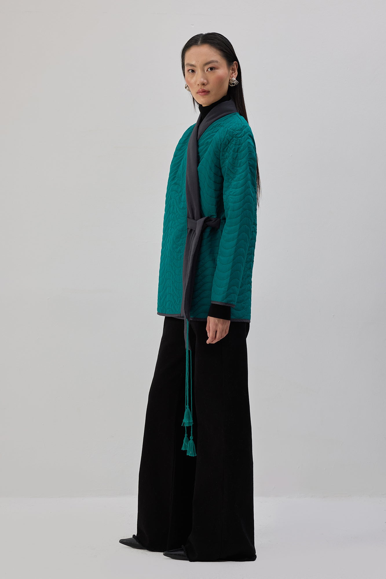 Kapitone dokulu. Uzun kollu. Bağlama detaylı ceket.
