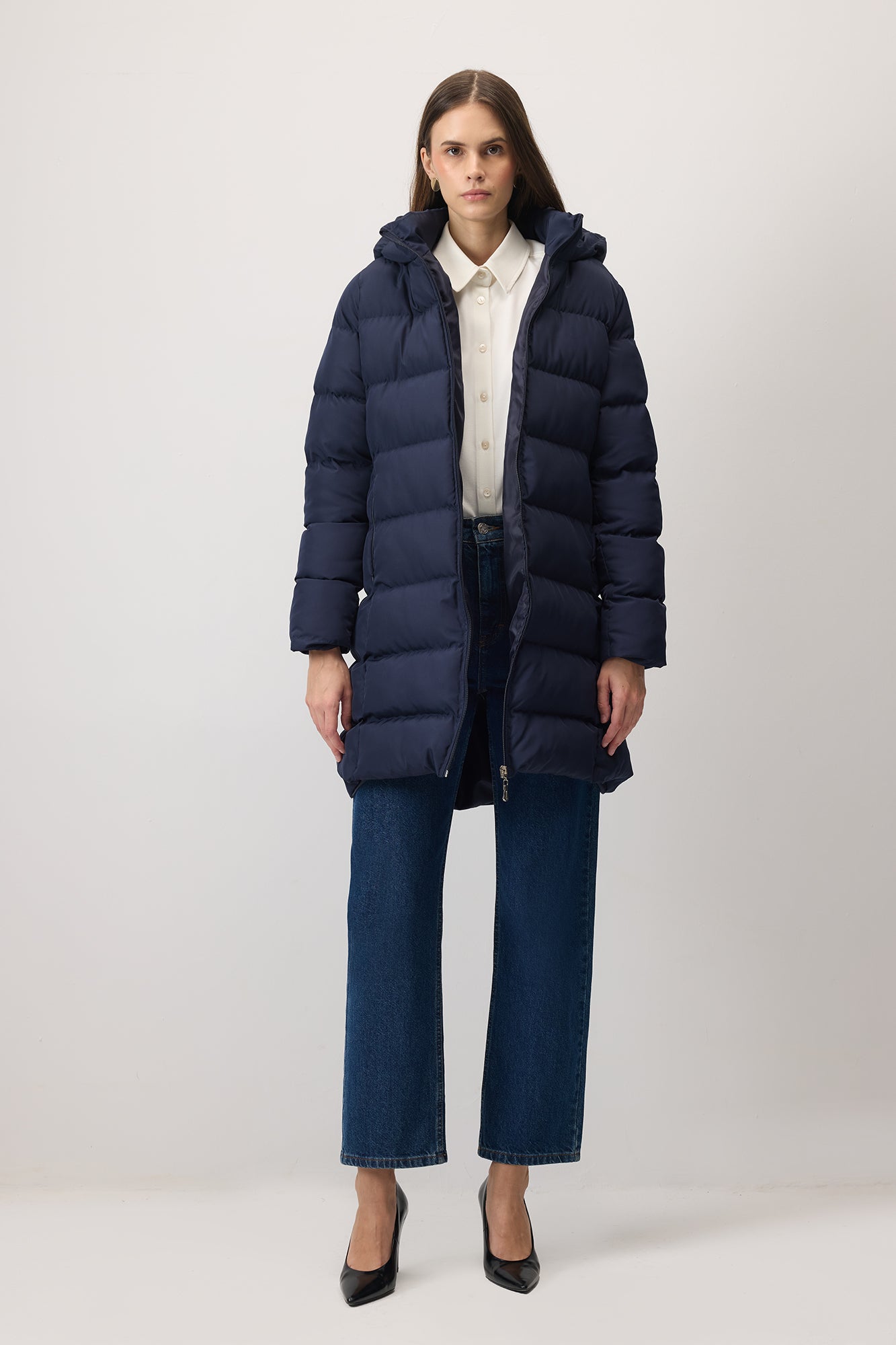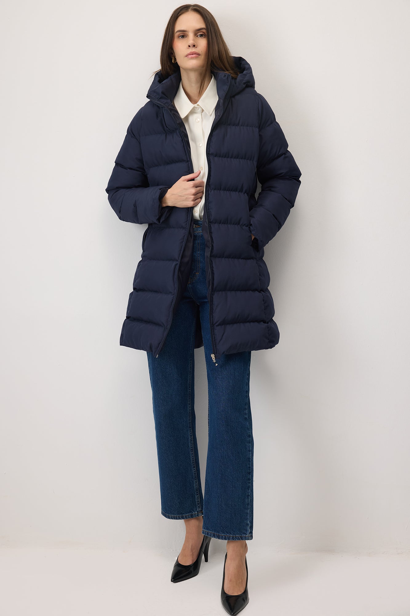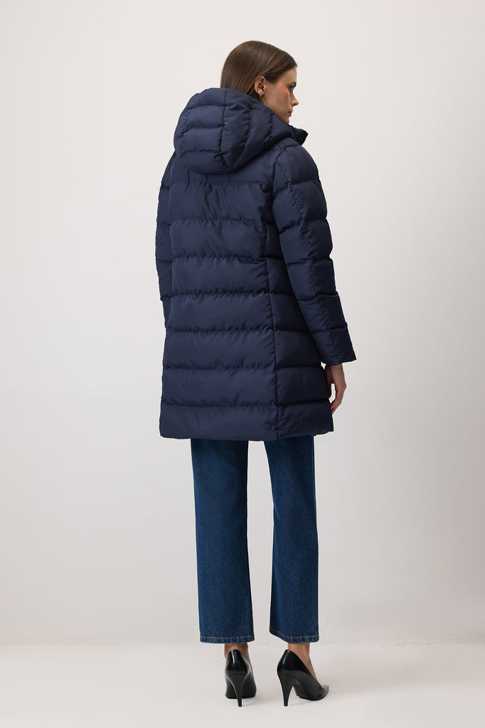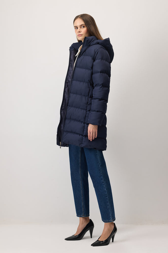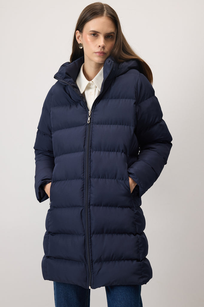 Kapüşonlu ultra hafif mont. Fermuarlı kapama. Yan cepli.