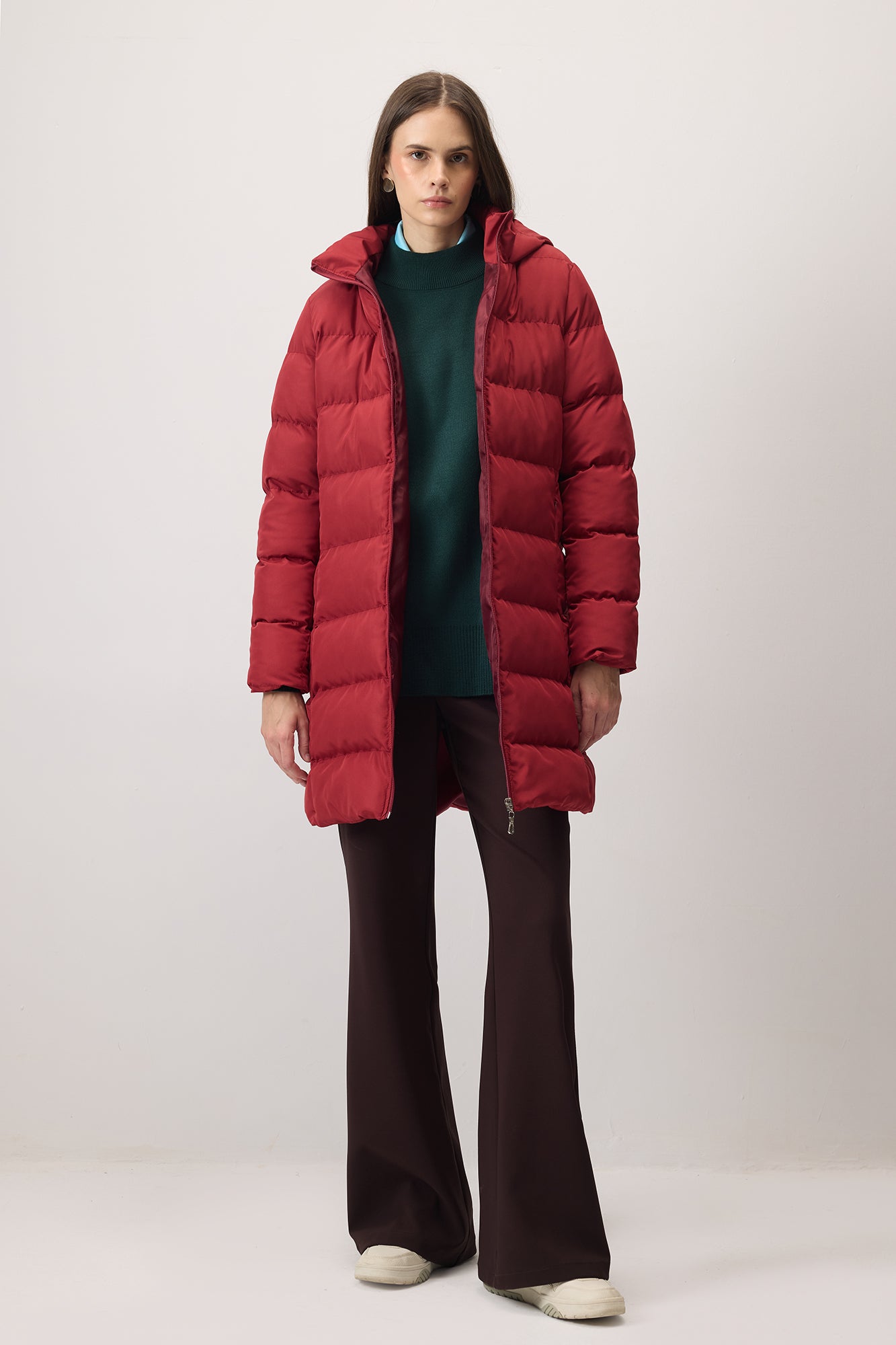 Kapüşonlu ultra hafif mont. Fermuarlı kapama. Yan cepli.