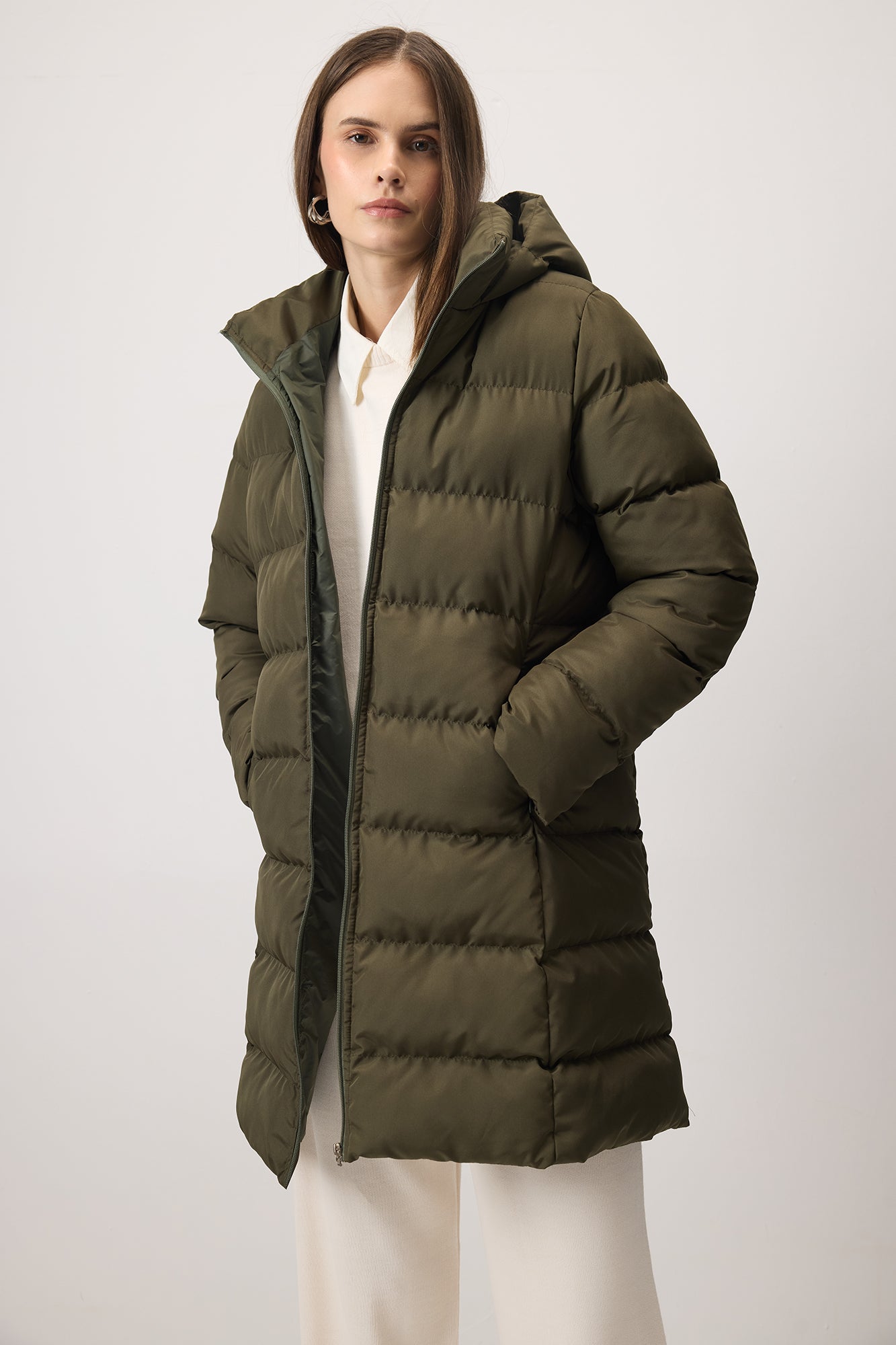 Kapüşonlu ultra hafif mont. Fermuarlı kapama. Yan cepli.
