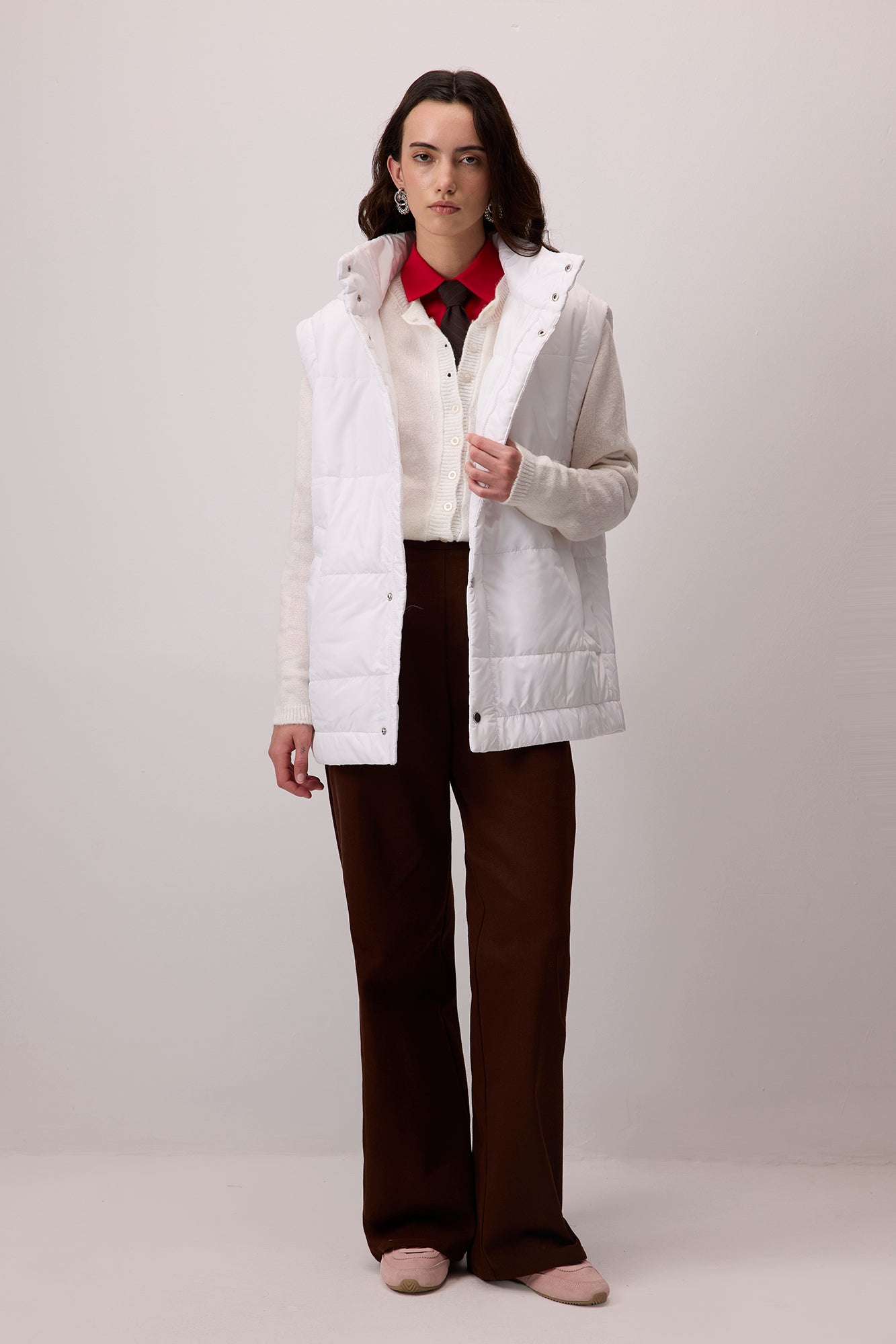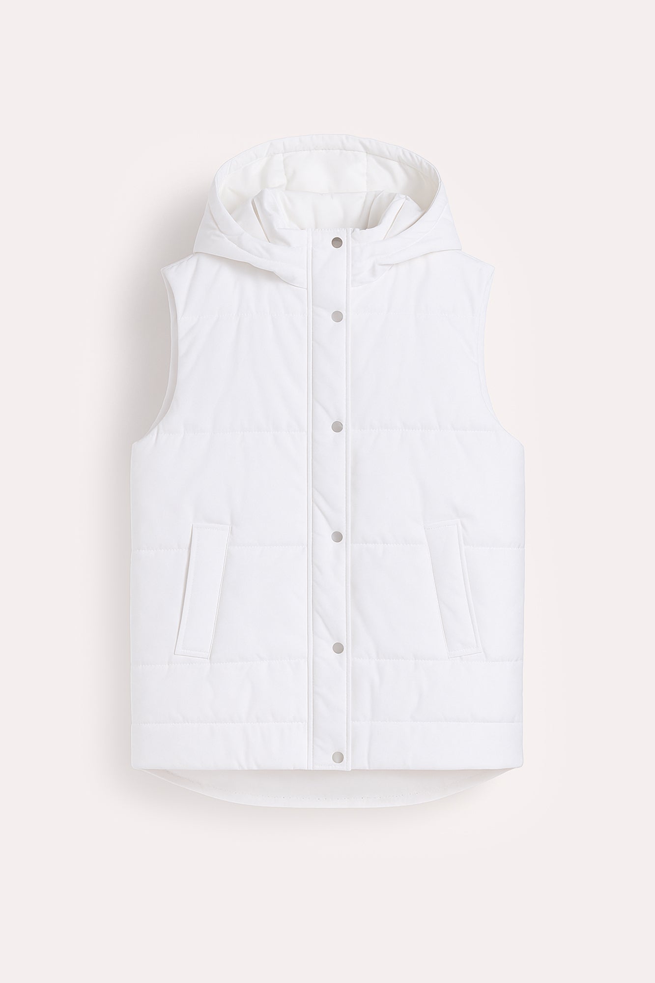 Dik yaka. Kapüşonlu. Kolsuz. Çift cepli. Fermuar ve çıt çıt kapama.