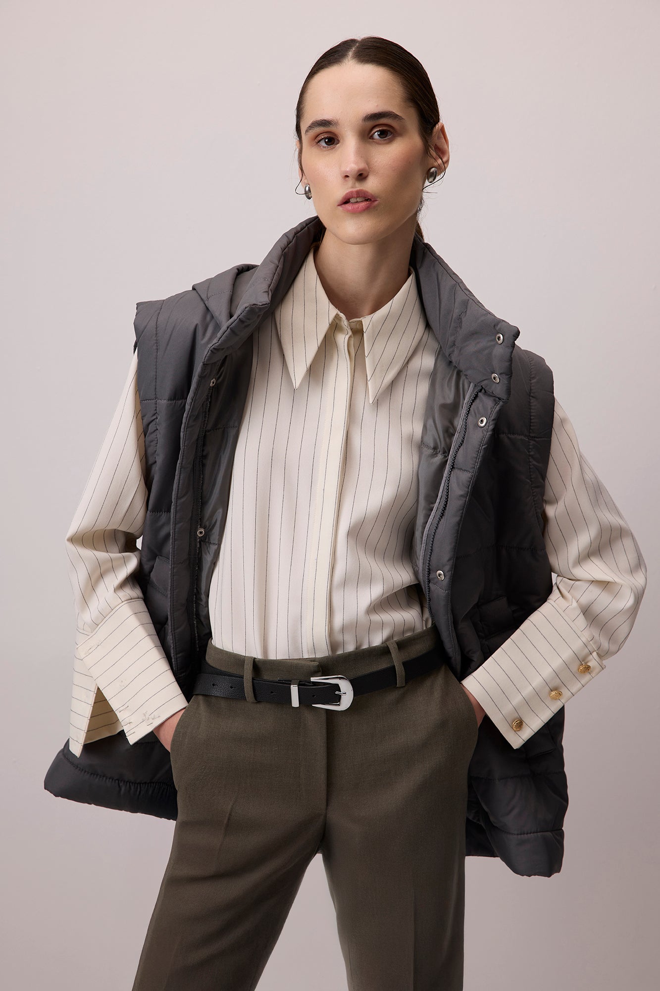 Dik yaka. Kapüşonlu. Kolsuz. Çift cepli. Fermuar ve çıt çıt kapama.
