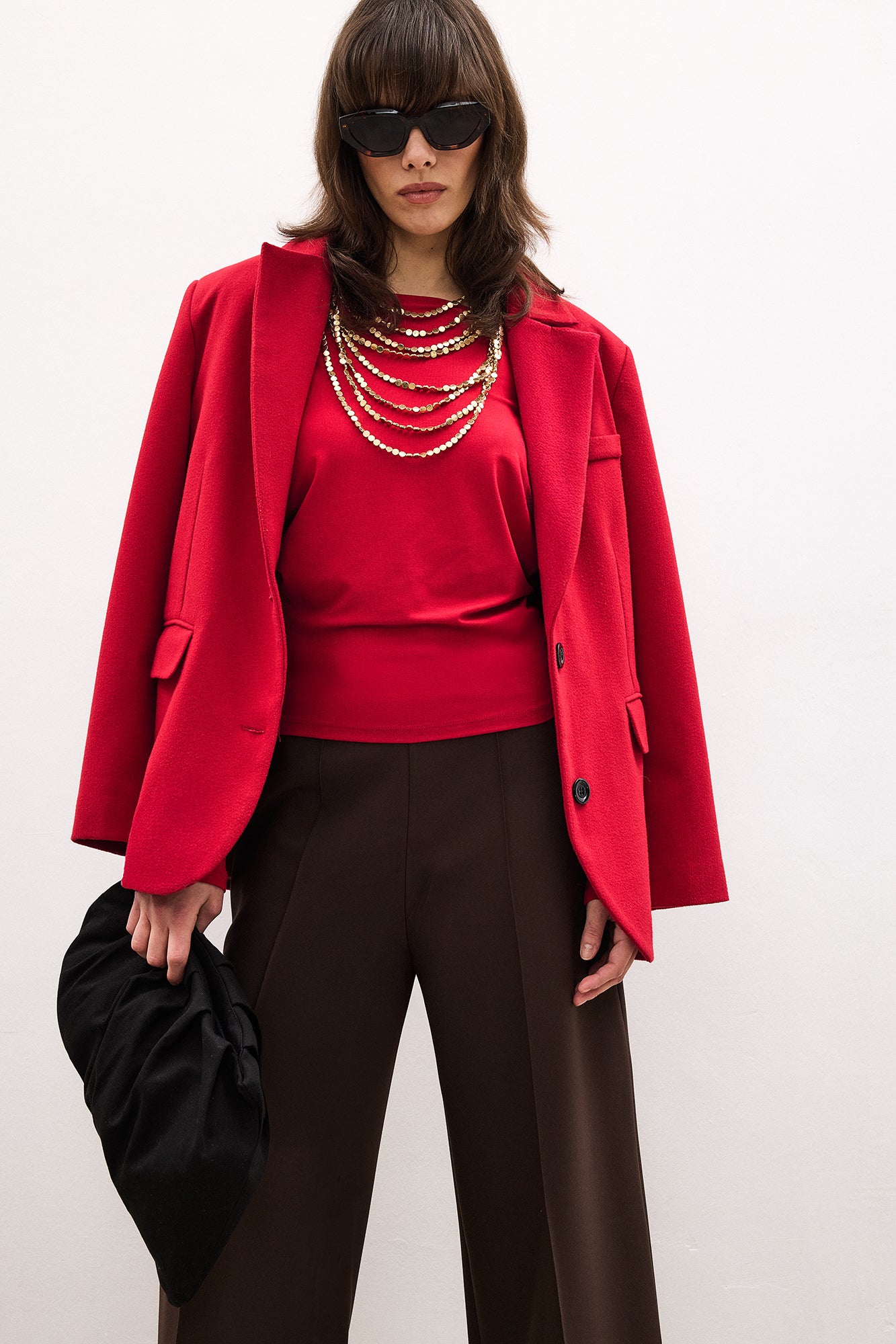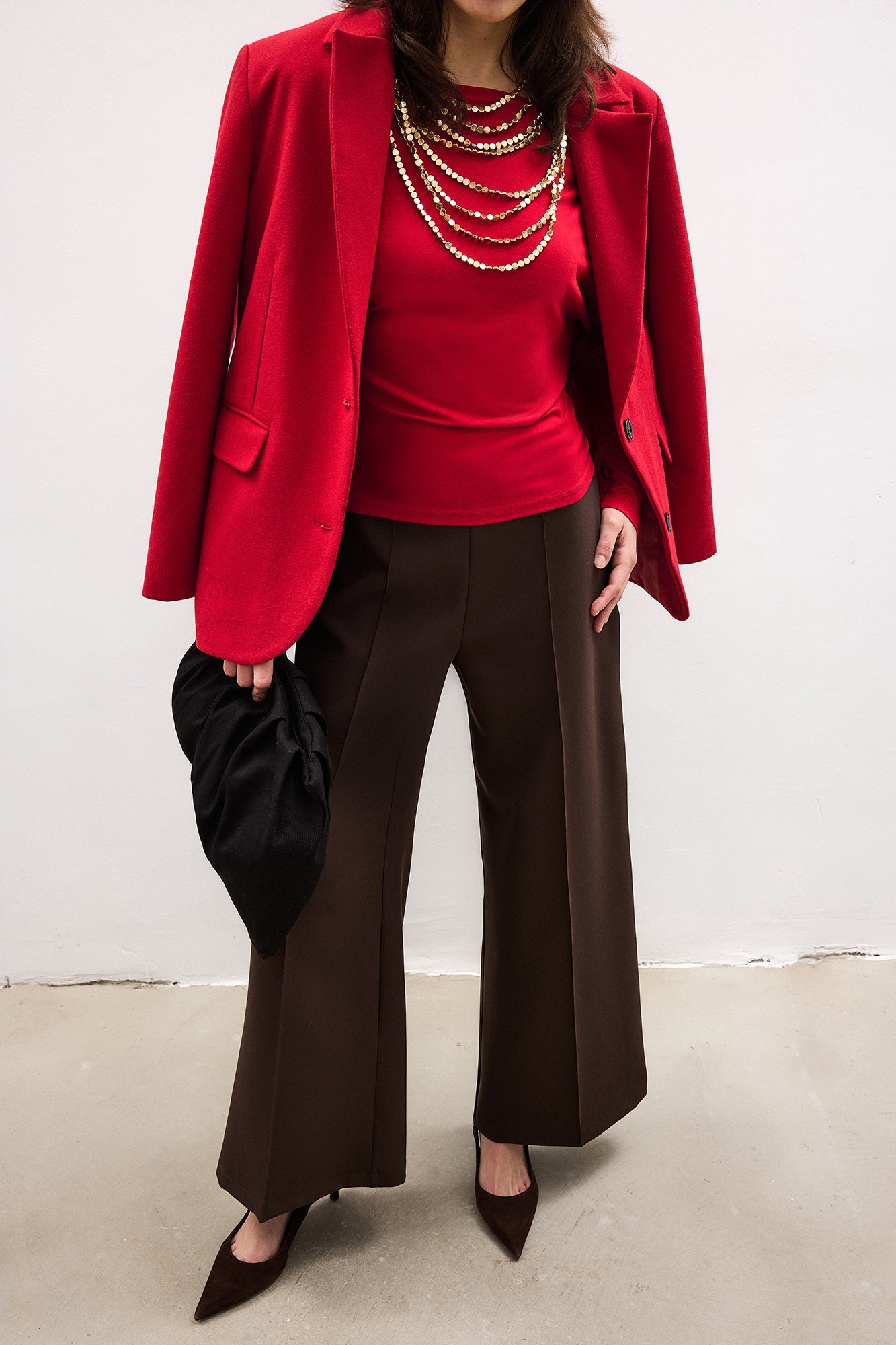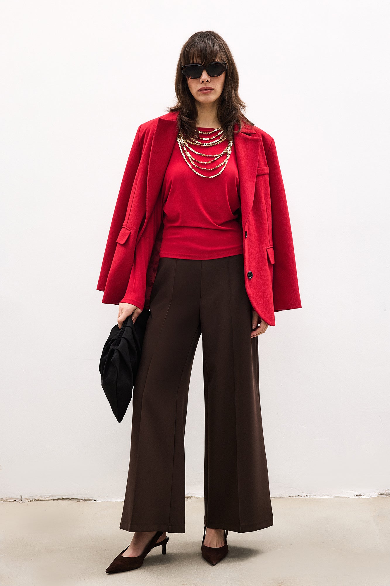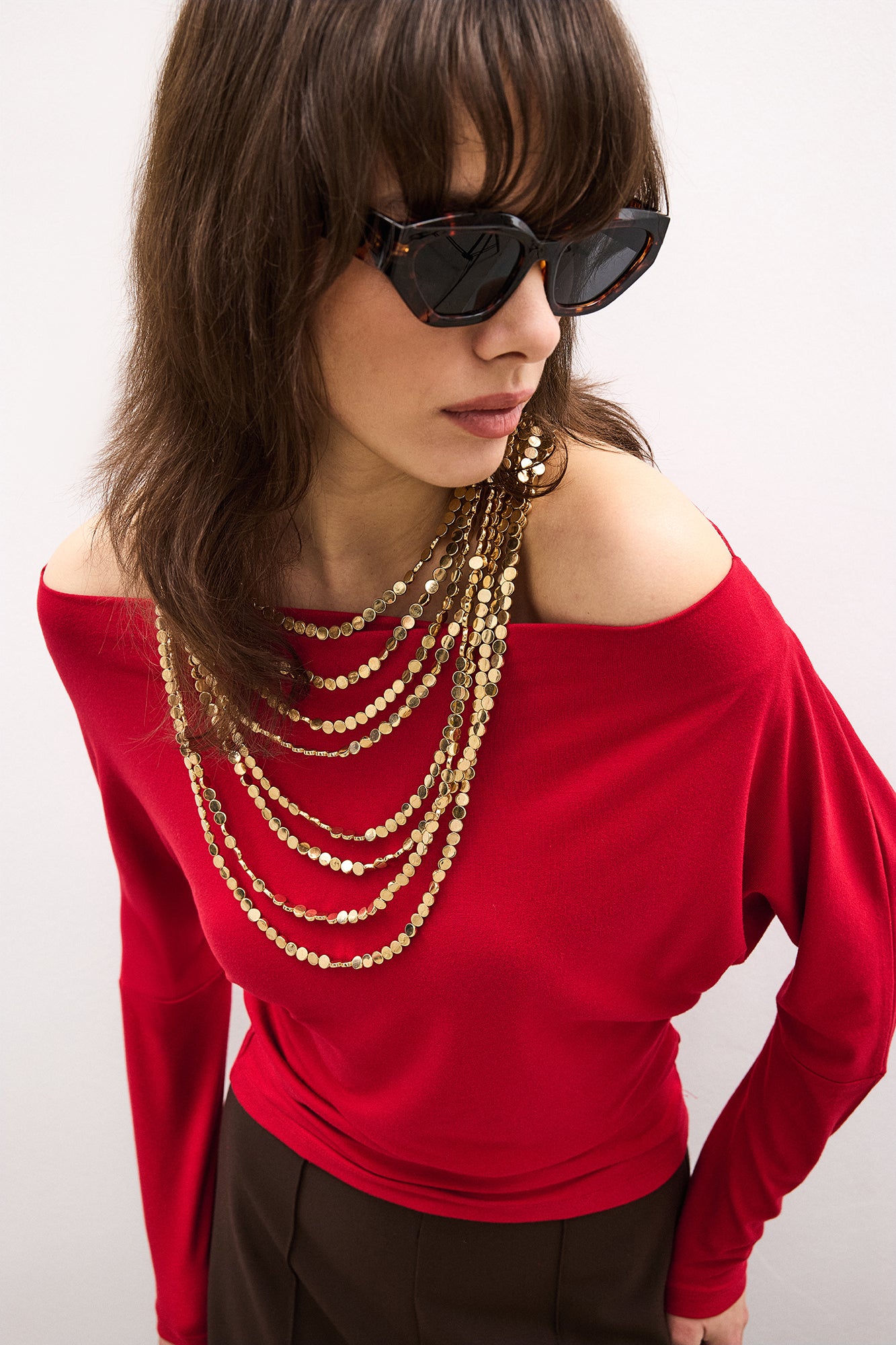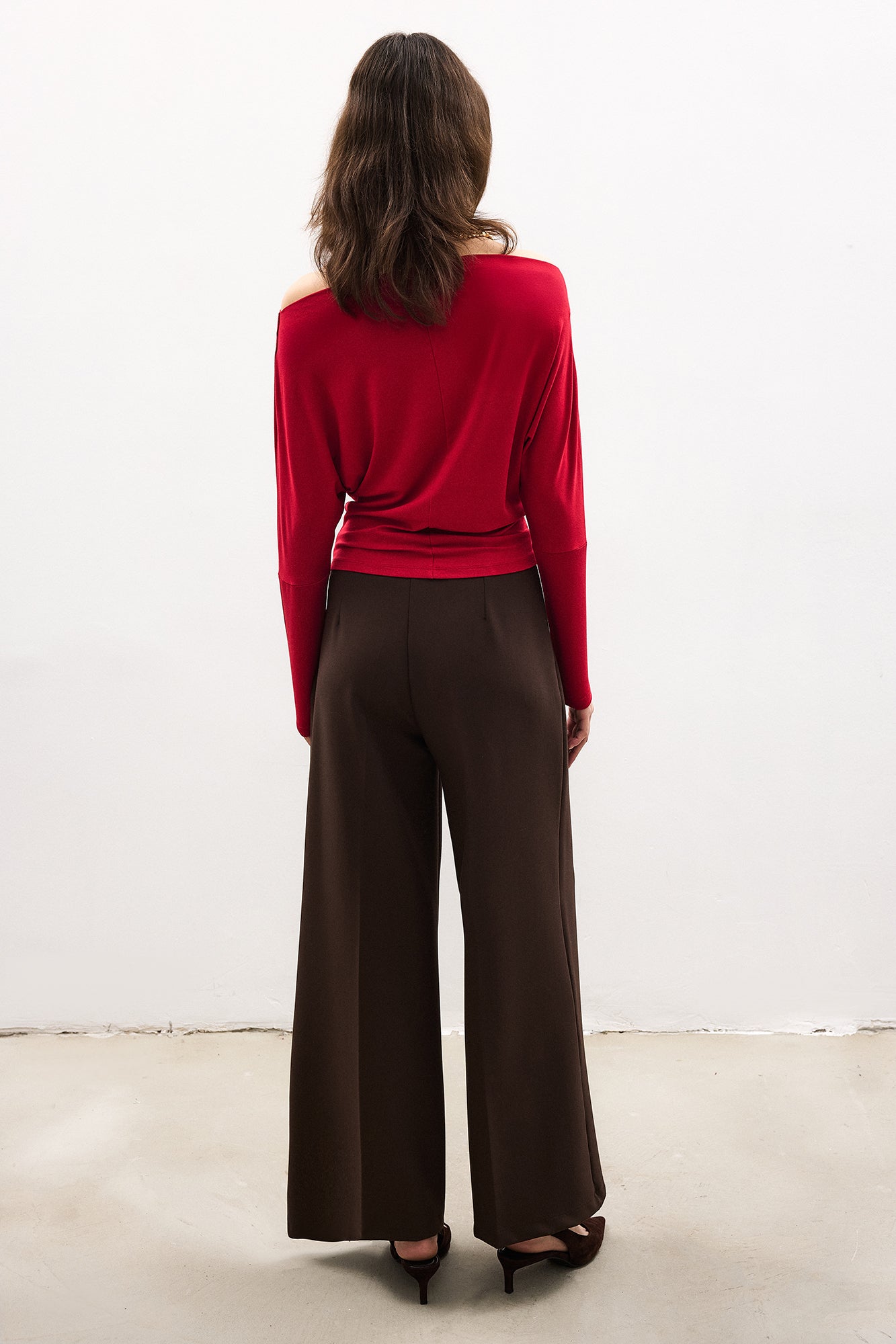 Kayık (omuz açık) yaka tasarım. Yumuşak ve akışkan dokulu kumaş. Hafif likralı, esnek yapı. Düşük omuz. Uzun kol.