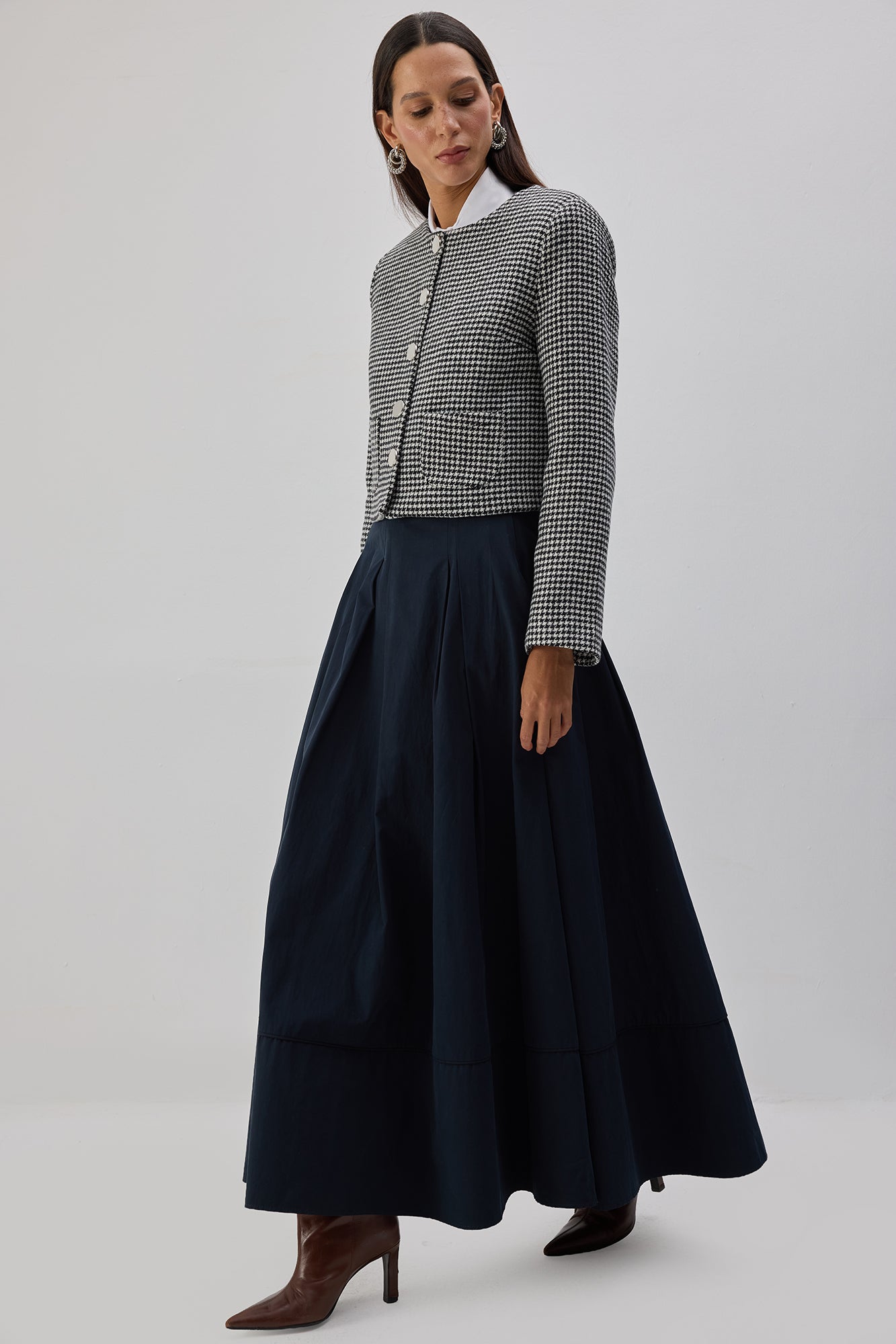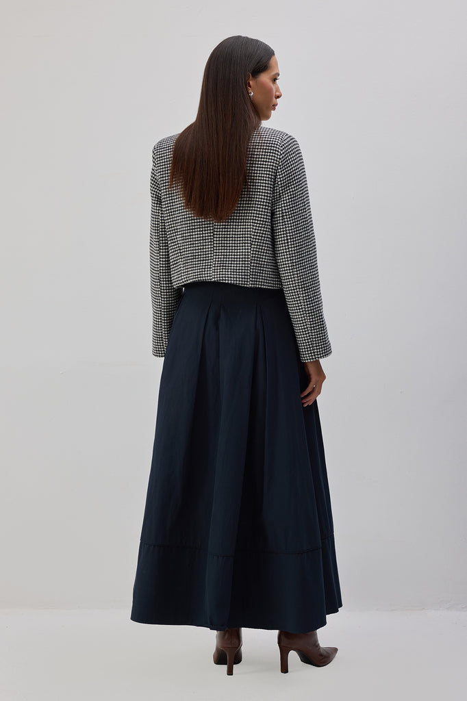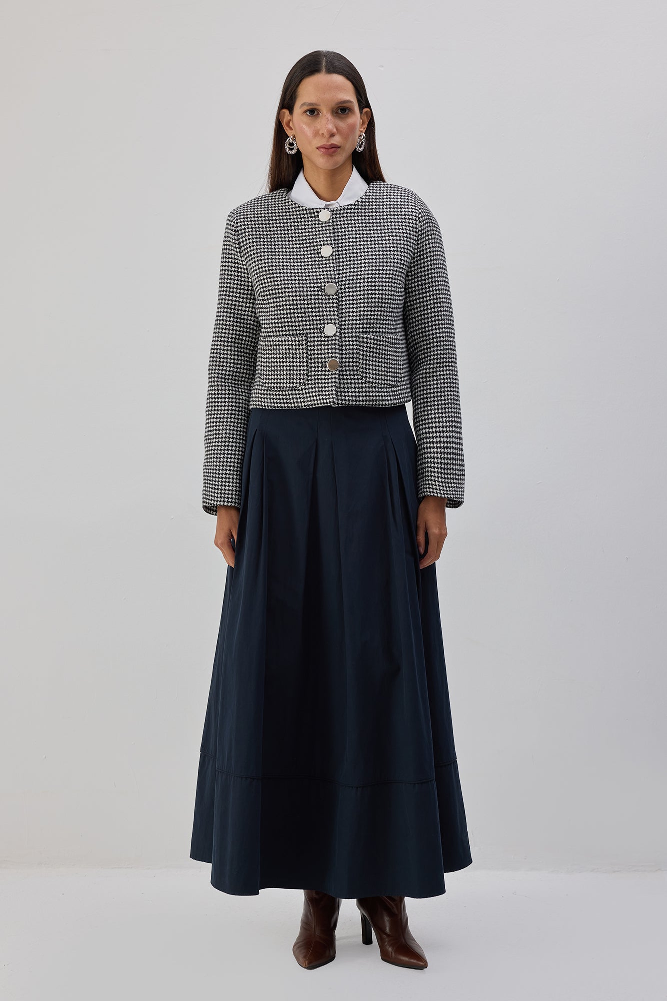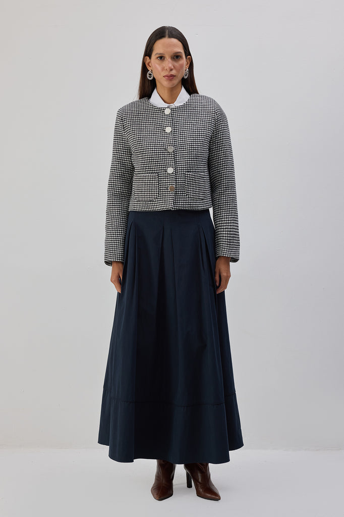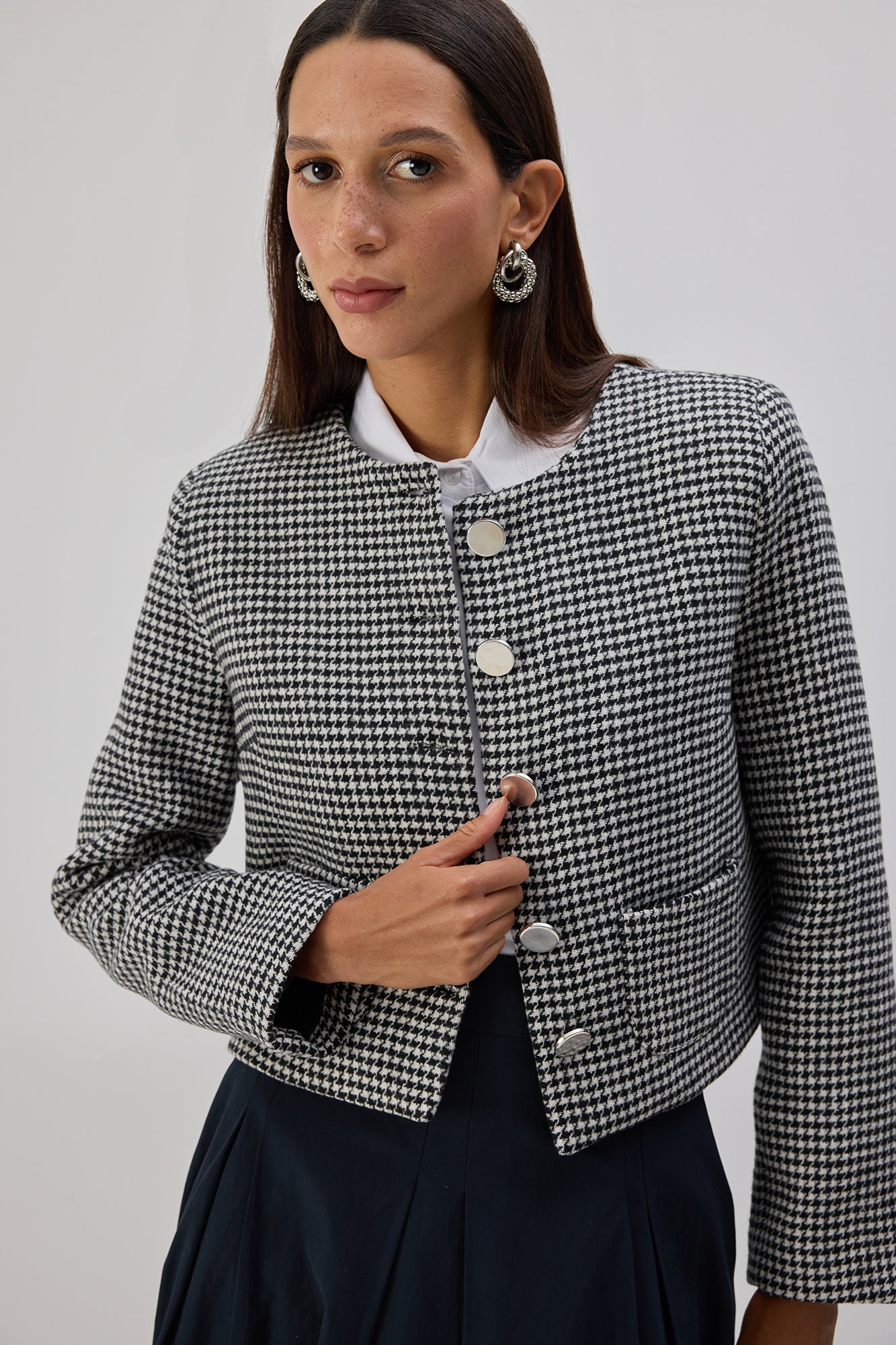 Kazayağı desenli. Önde metal düğme kapama. Çift cep detaylı. Vatkalı kısa kaban.