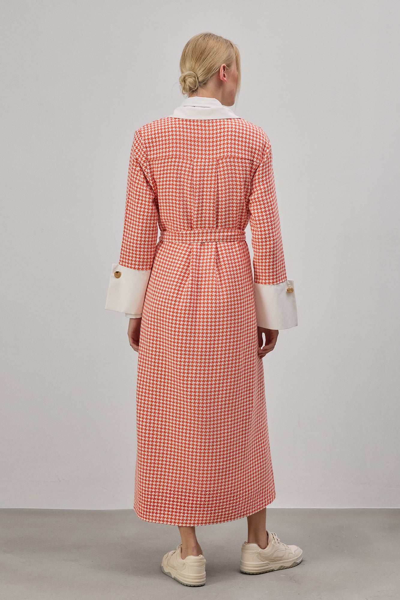 Kazayağı desenli. Uzun kollu. Kontrast beyaz yaka ve manşet detaylı. Önden düğmeli kapama. Çıkarılabilir kuşak kemer. Diz altı midi boy. Tüvit elbise.