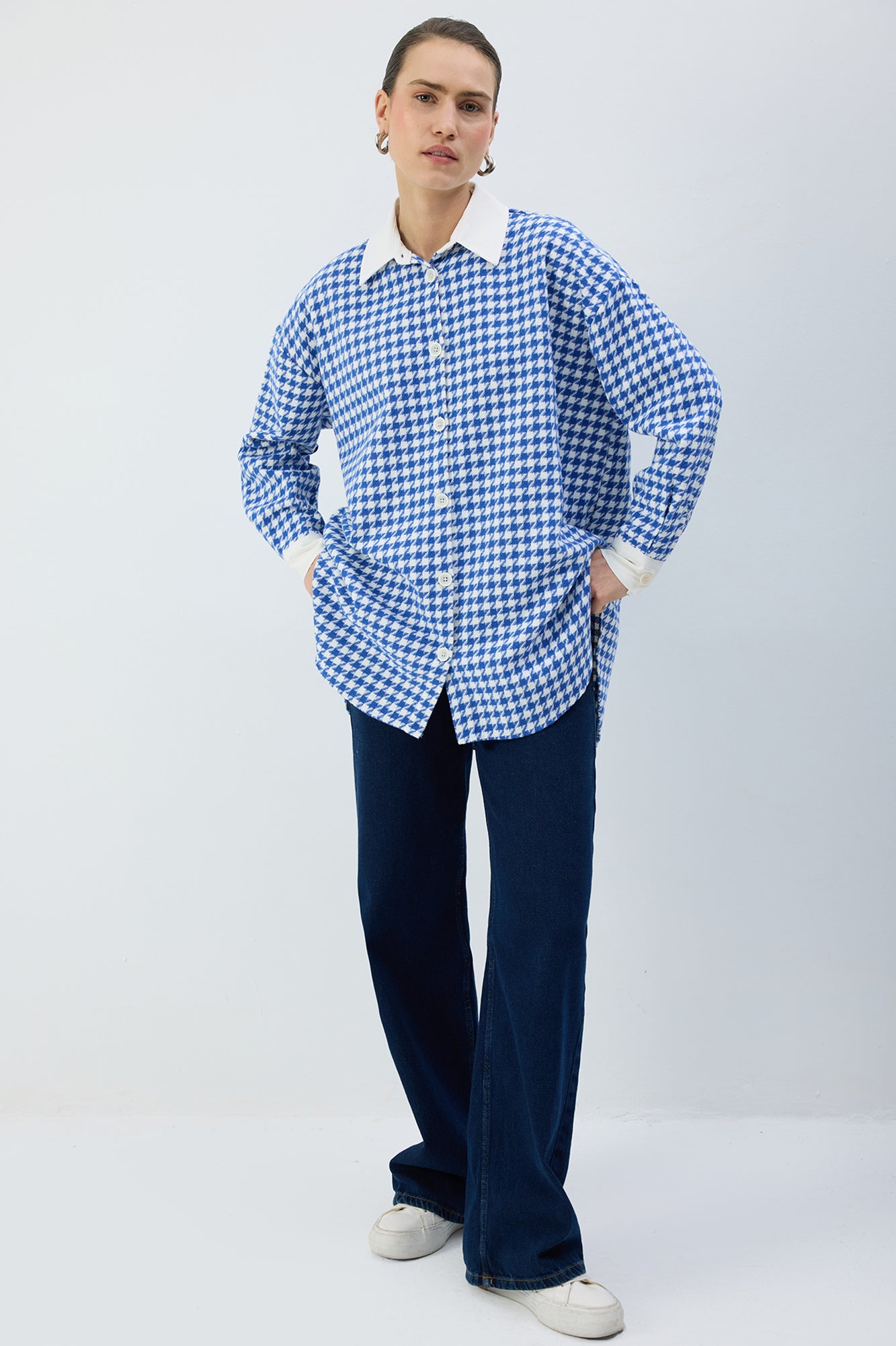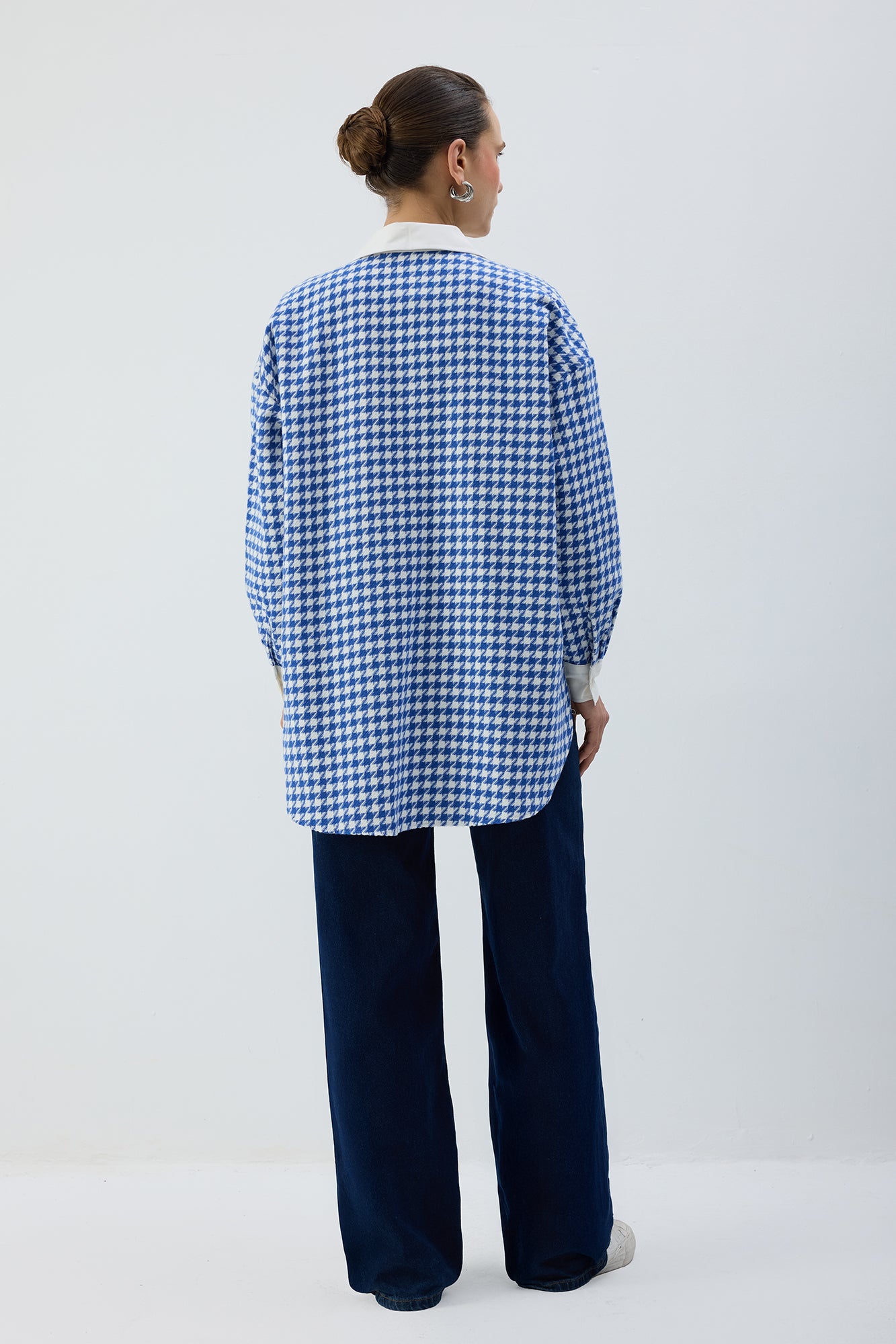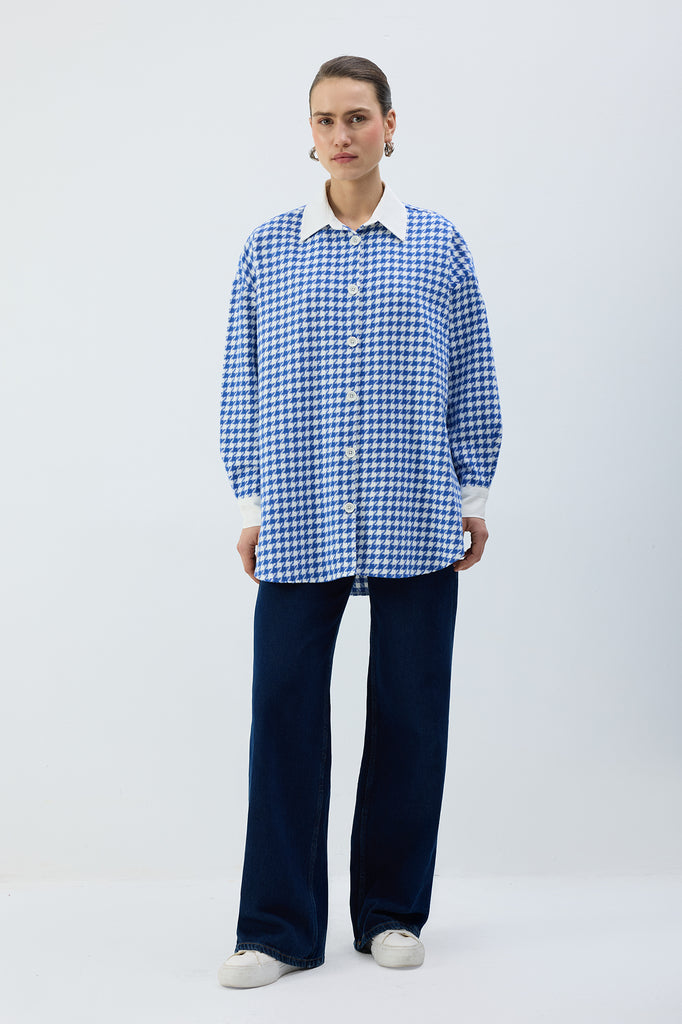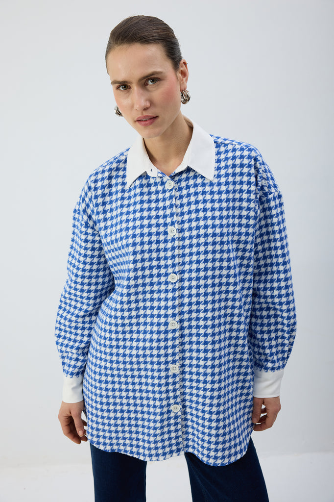 Kontrast yakalı, kazayağı desenli, uzun kollu gömlek. Düğme kapamalı, rahat kesim.