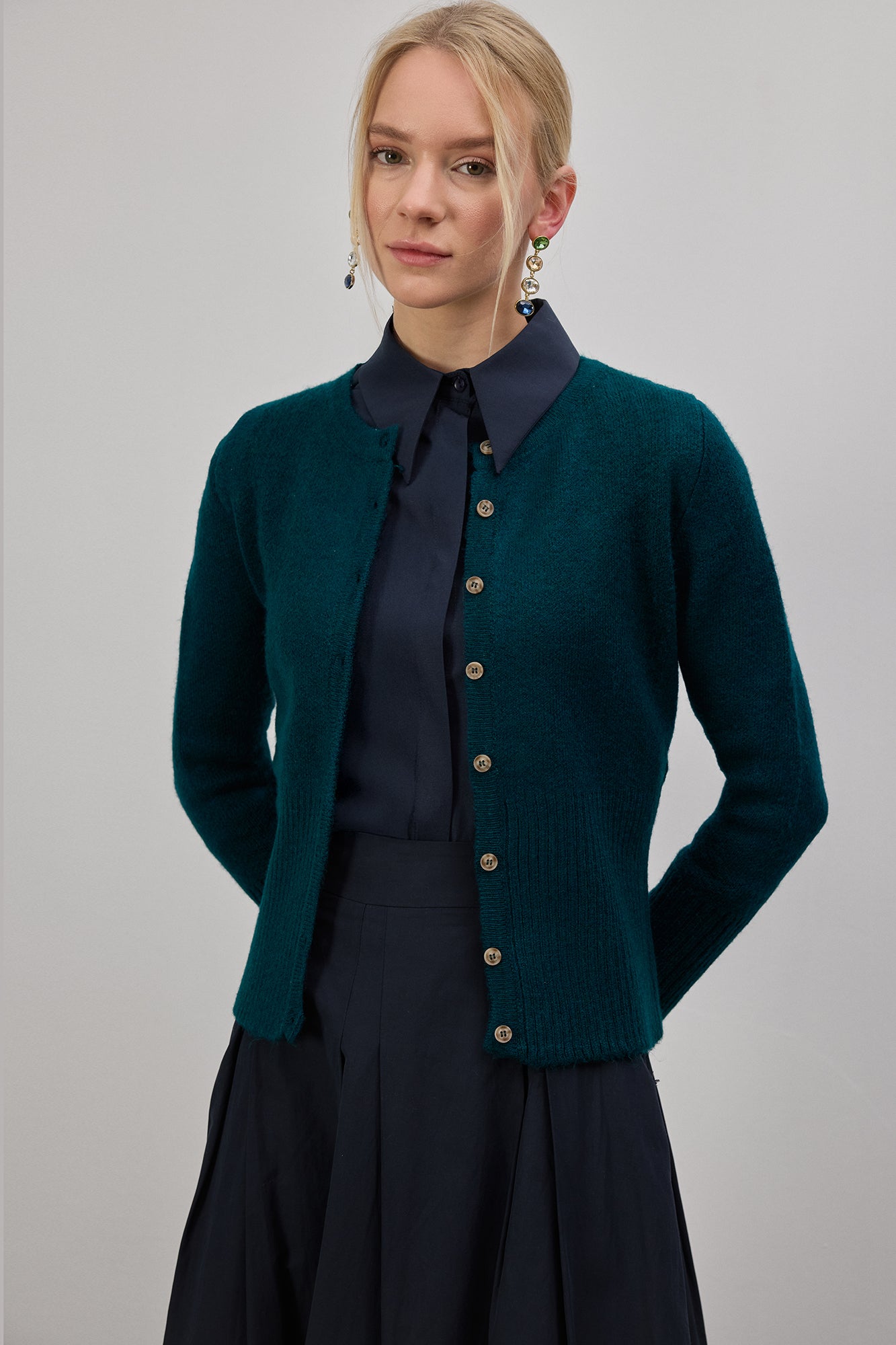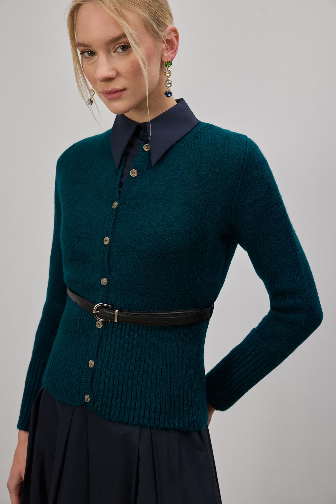 Kemer detaylı, önü düğmeli triko hırka; vücuda oturan formu ve yumuşak dokusuyla günlük ve ofis kombinleri için şık bir tamamlayıcıdır. Yumuşak triko dokusu gün boyu konfor sağlarken, önü düğmeli yapısı sayesinde tek başına ya da katmanlı kombinlerde rahatlıkla kullanılabilir.