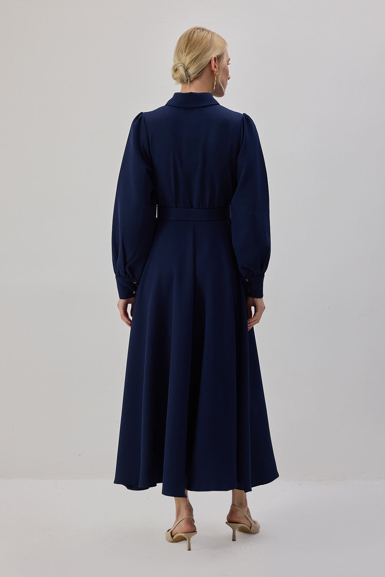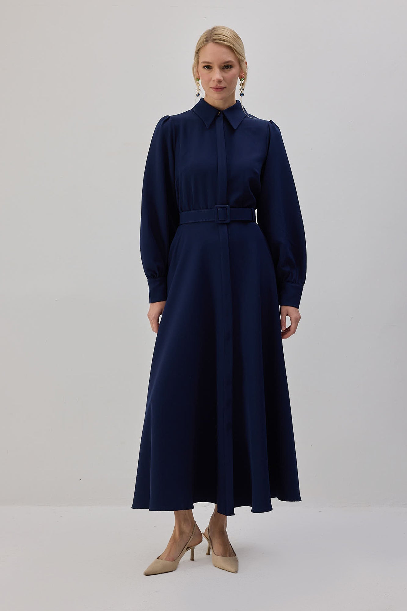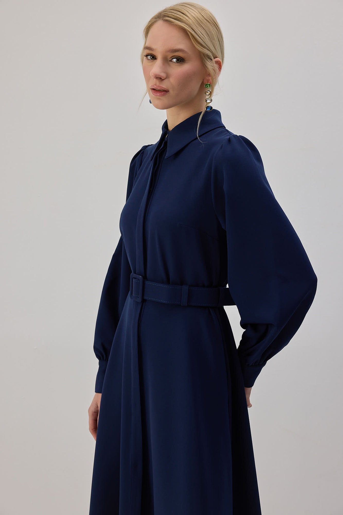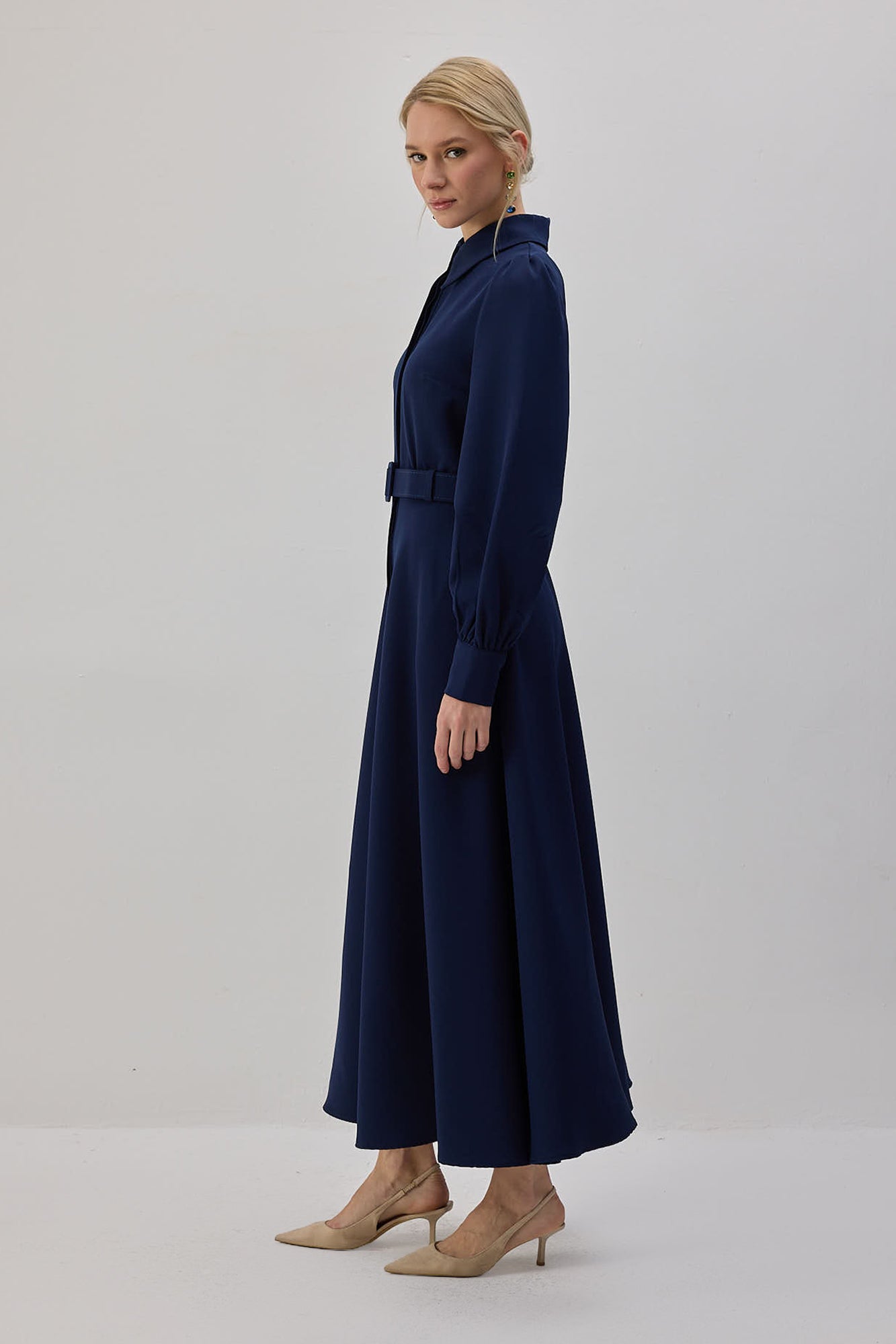 Gömlek yaka. Uzun kollu. İki yan cep. Önden düğmeli kapama. Ayarlanabilir kemer detaylı.