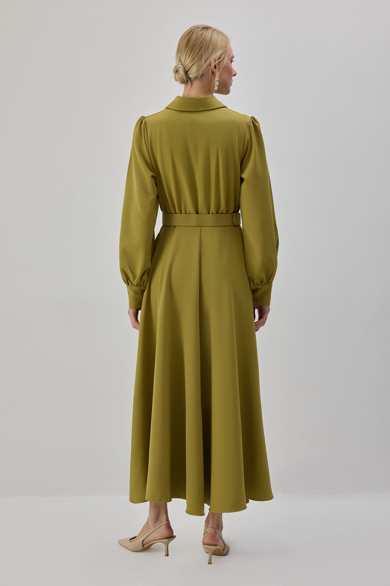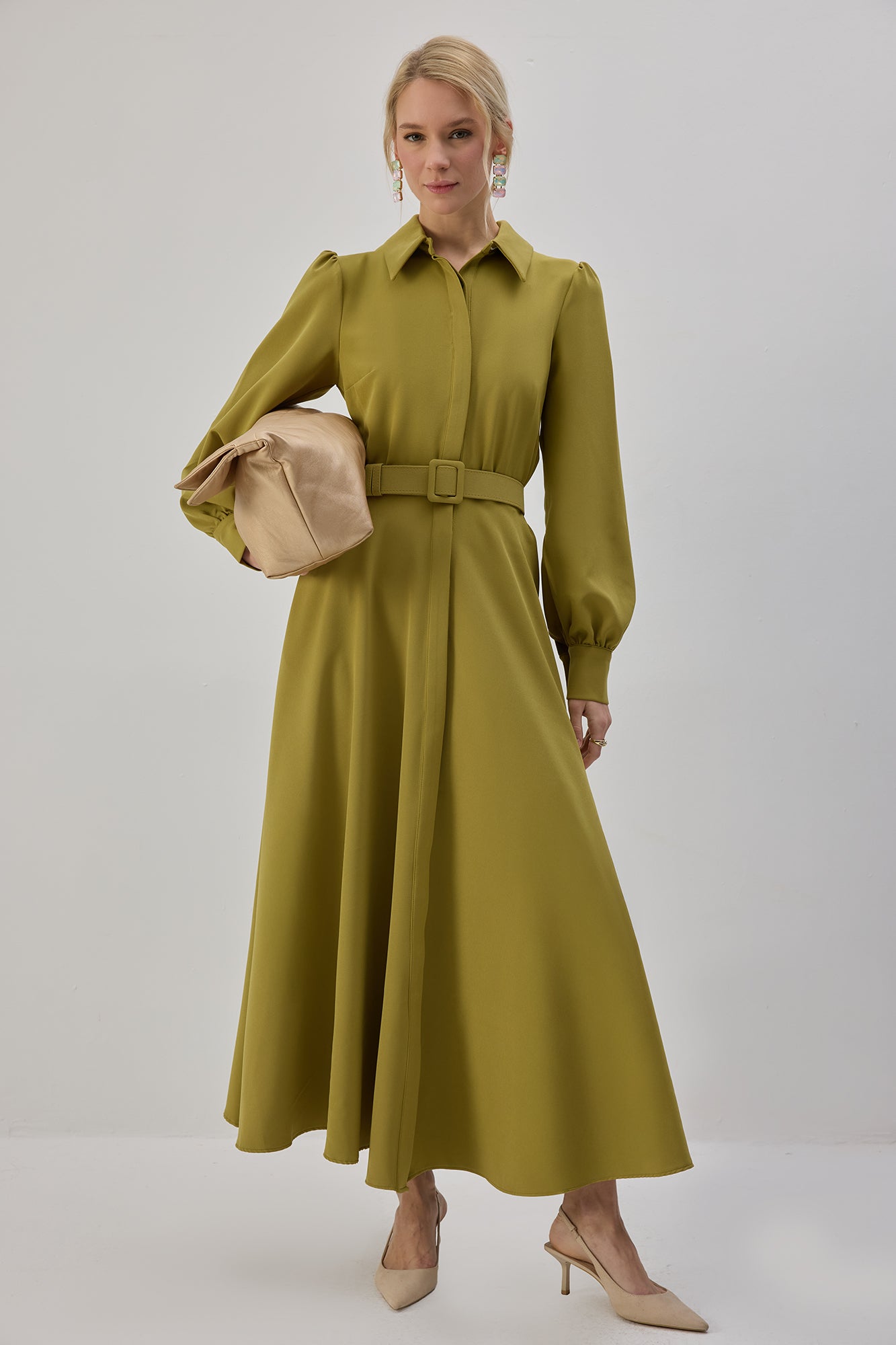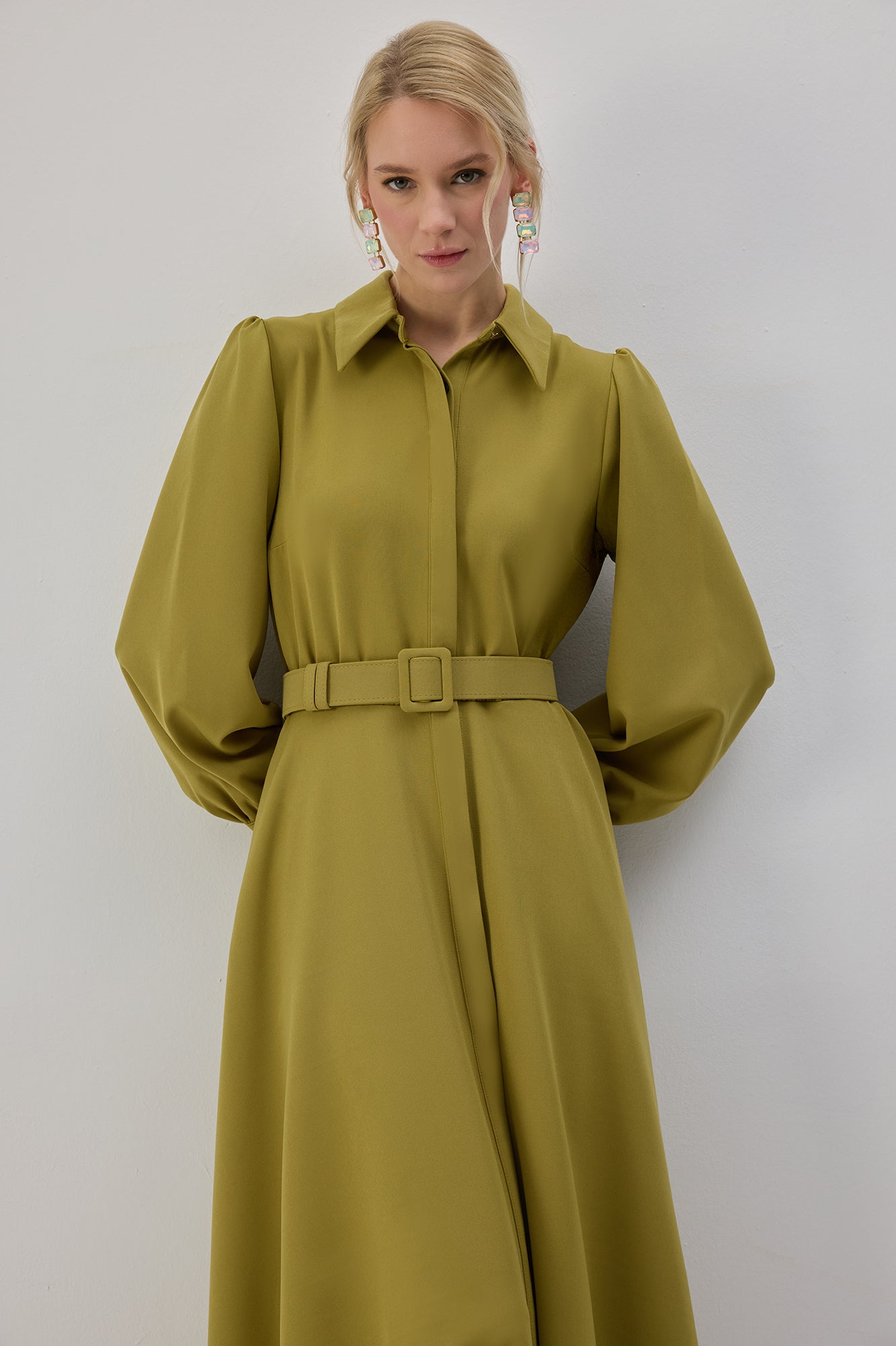 Gömlek yaka. Uzun kollu. İki yan cep. Önden düğmeli kapama. Ayarlanabilir kemer detaylı.