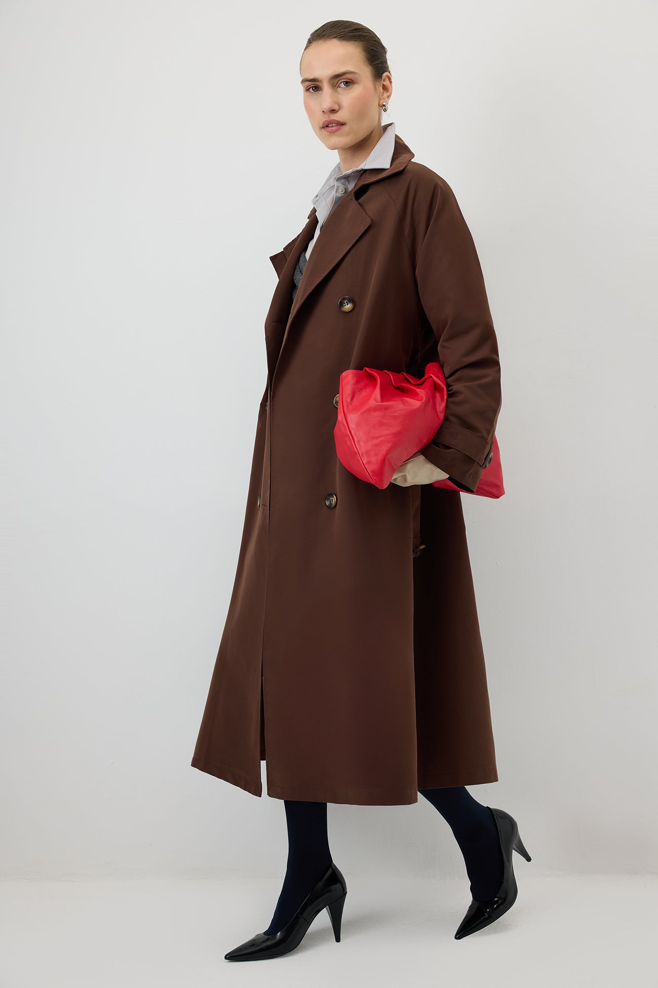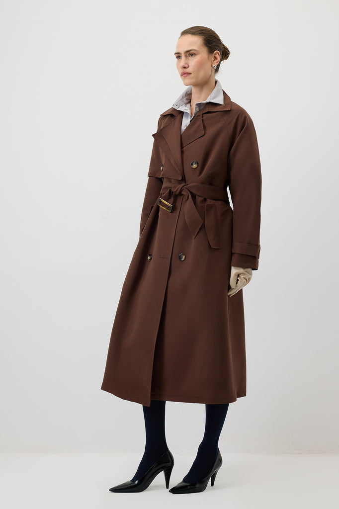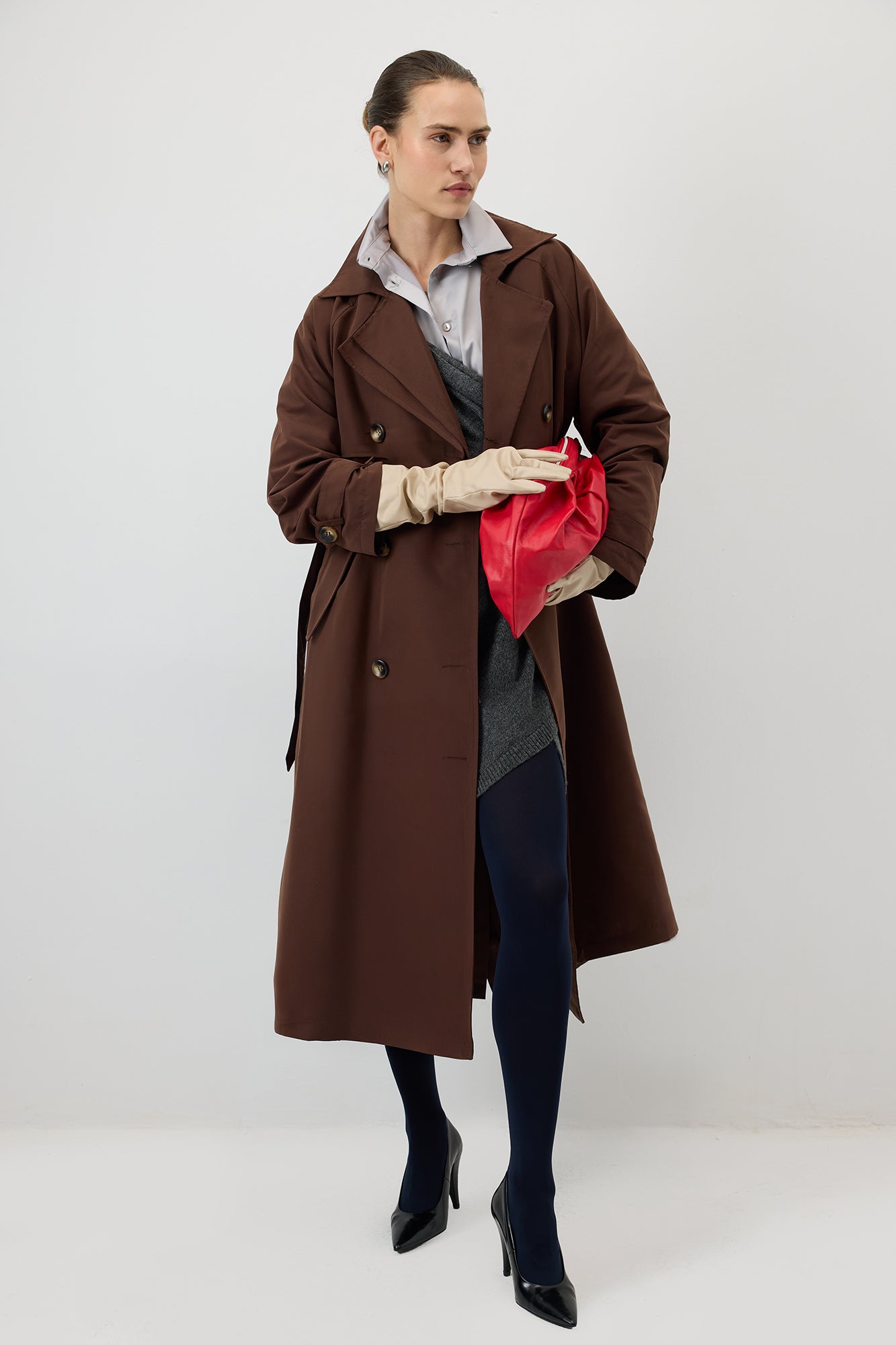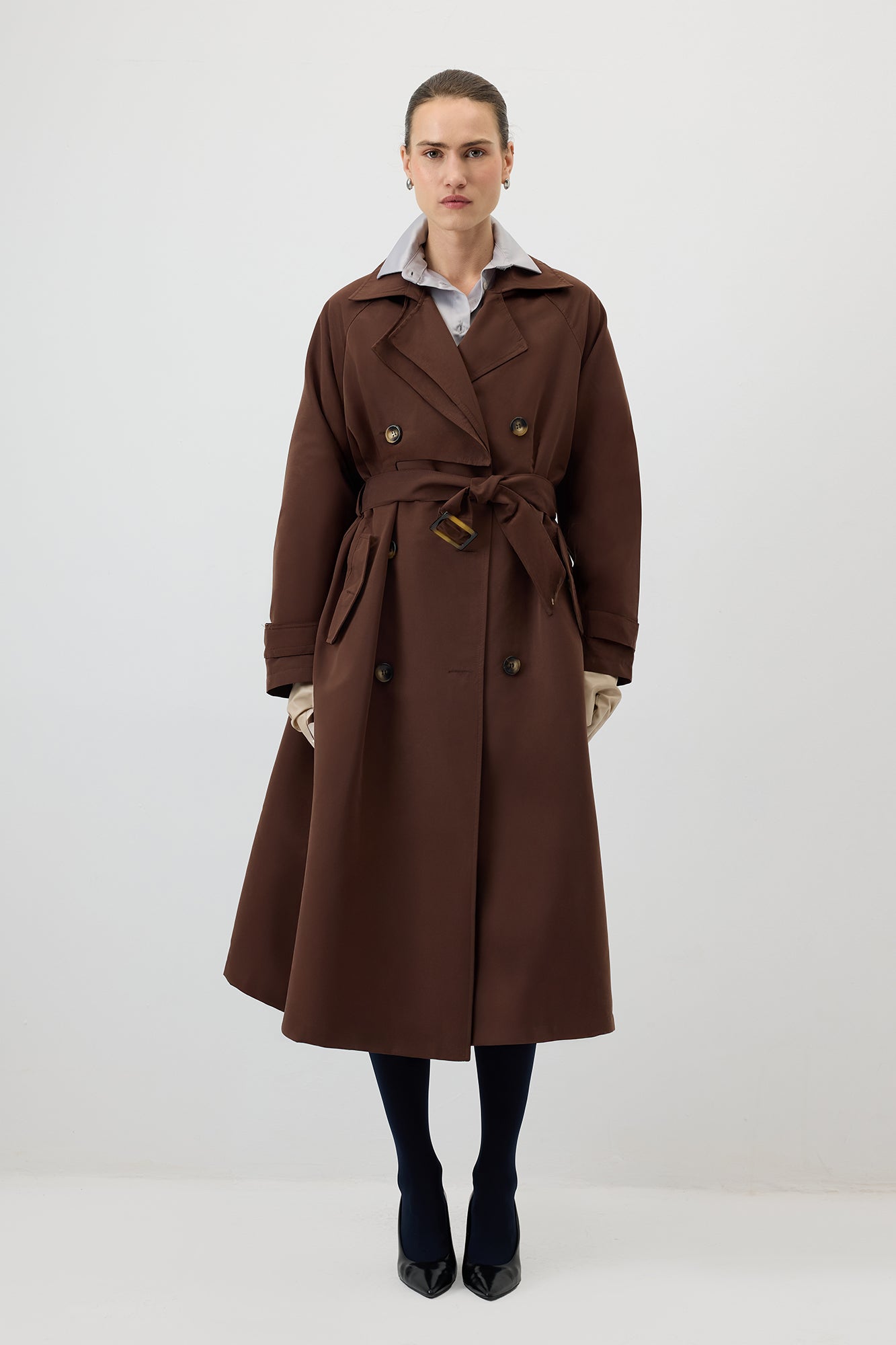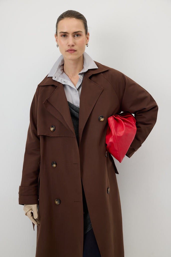 Kemerli trençkot. Çift düğmeli. Geniş yaka. Yan cepli. Uzun boy.