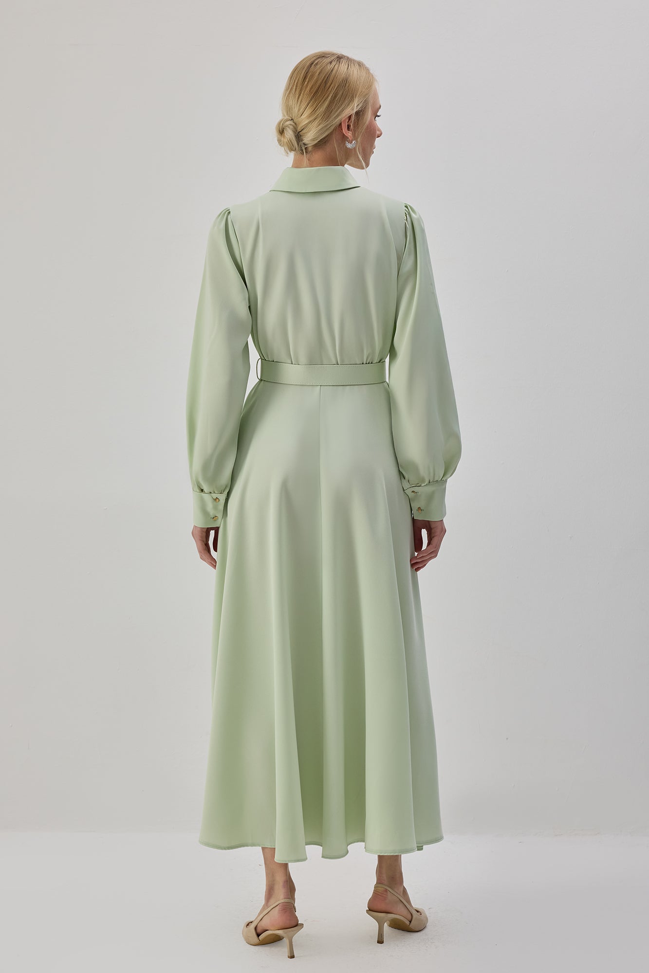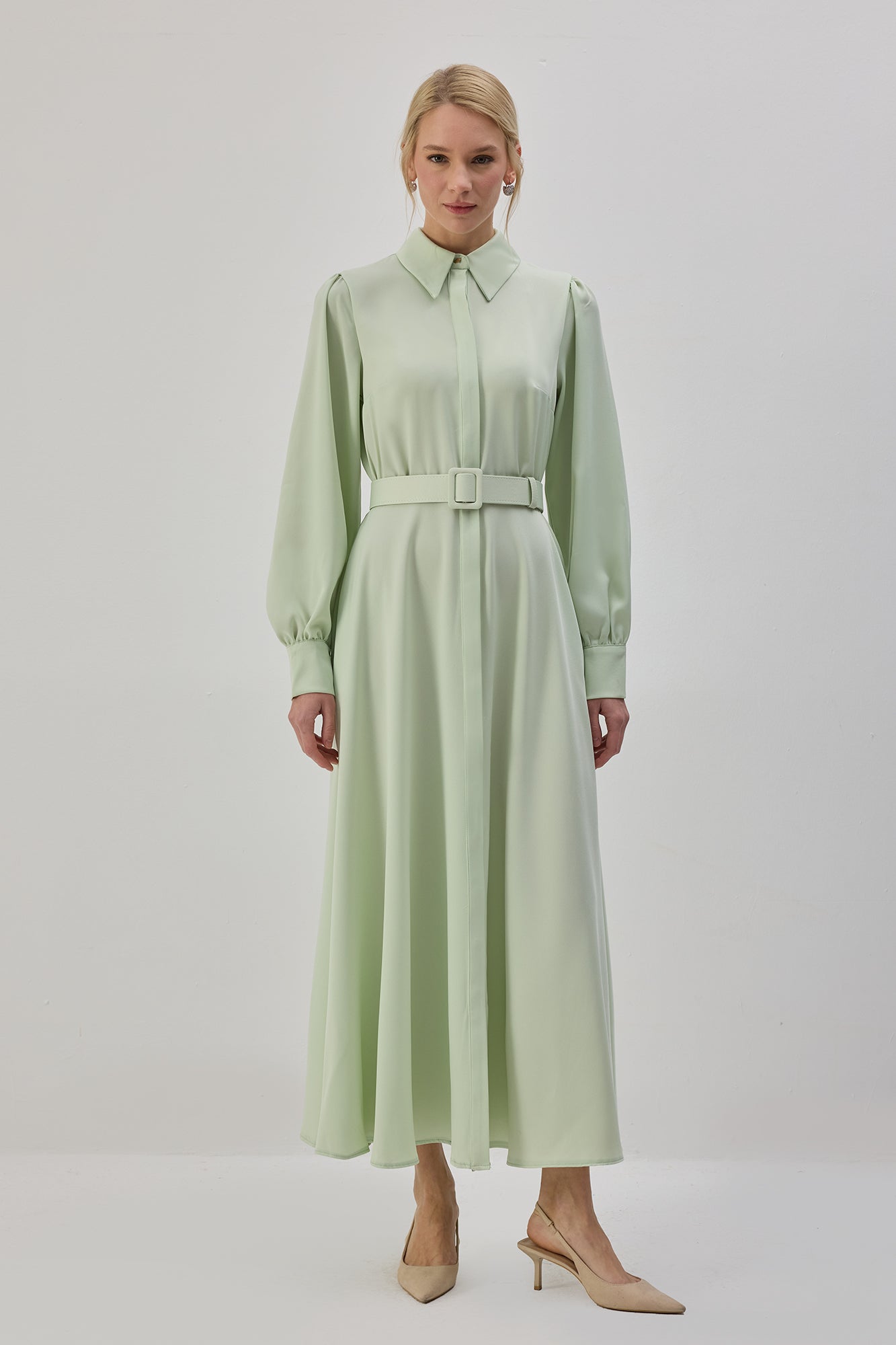 Gömlek yaka. Uzun kollu. İki yan cep. Önden düğmeli kapama. Ayarlanabilir kemer detaylı. Saten elbise.