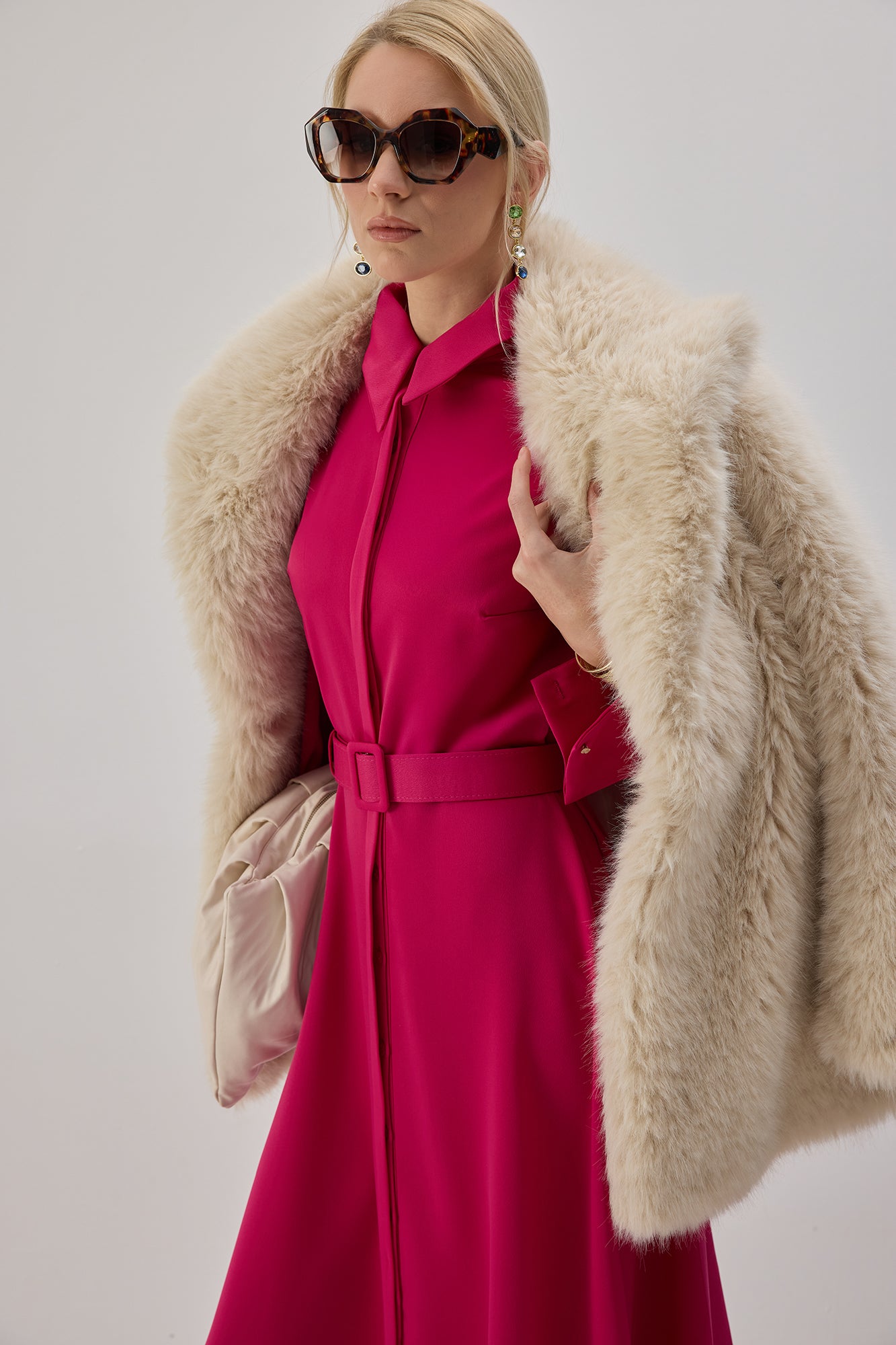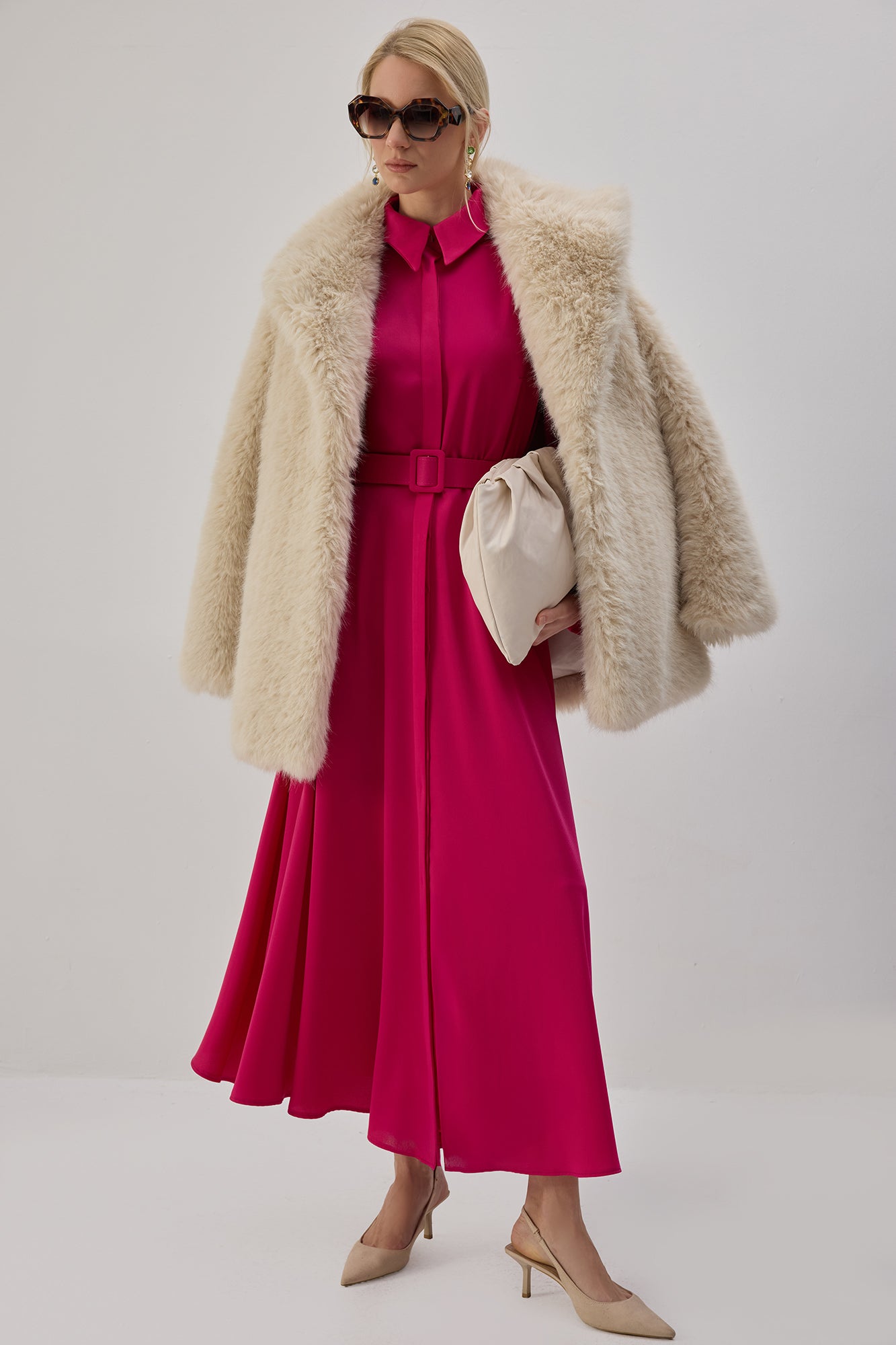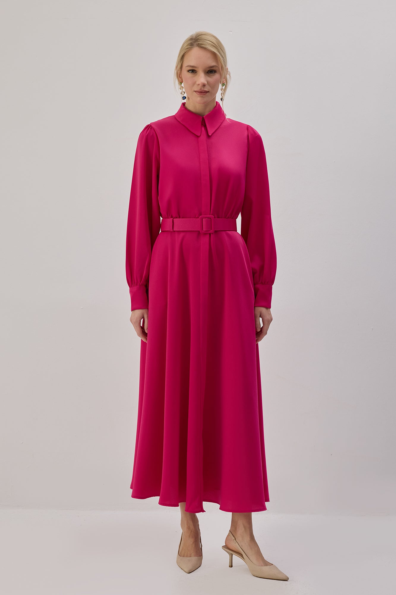 Gömlek yaka. Uzun kollu. İki yan cep. Önden düğmeli kapama. Ayarlanabilir kemer detaylı. Saten elbise.
