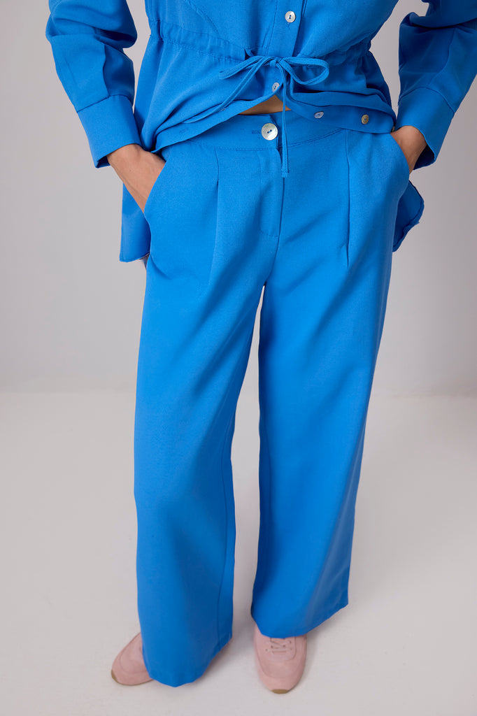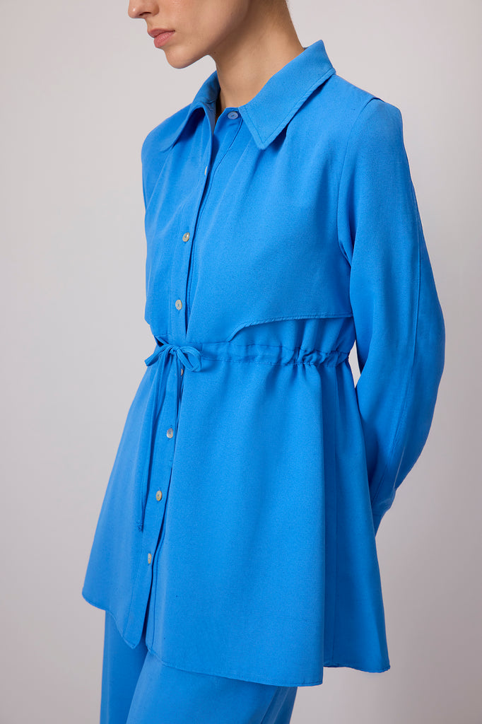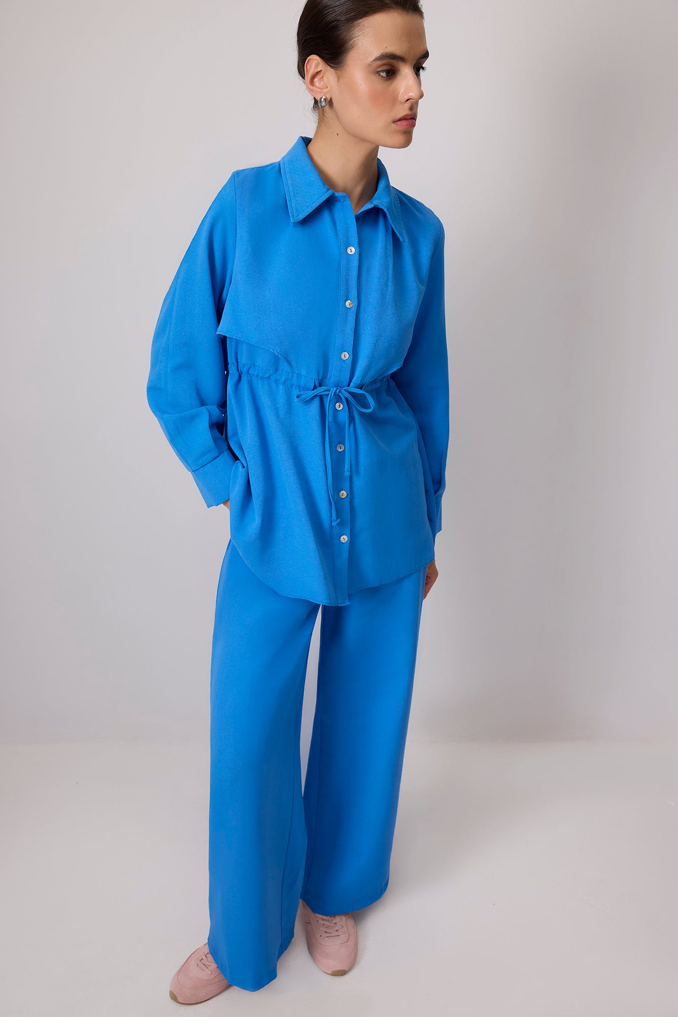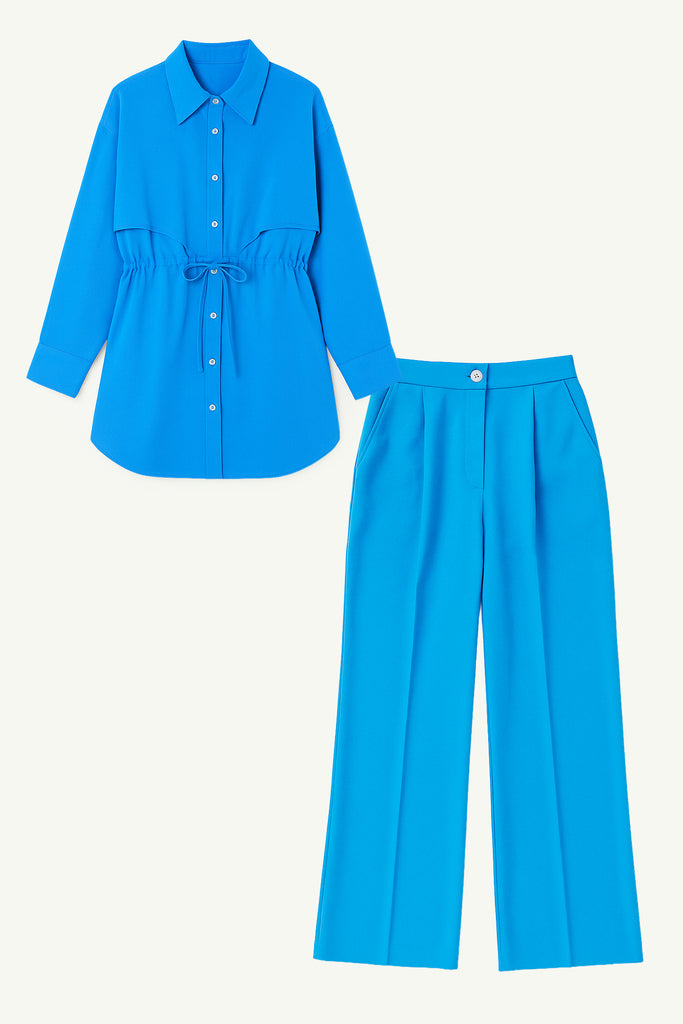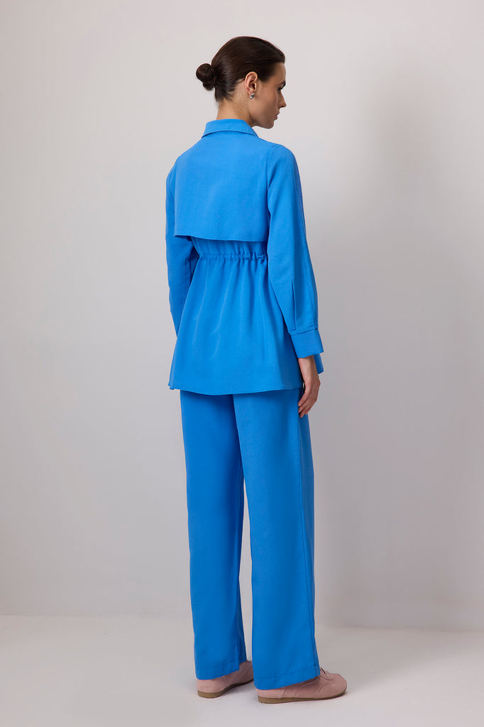 Klasik yaka. Uzun kollu ve manşetleri düğmeli. Önden düğme kapamalı. Uzun boy. Arka elastik bel. İki yan cep. Fermuar ve düğme kapamalı. Bol paça. Takım.