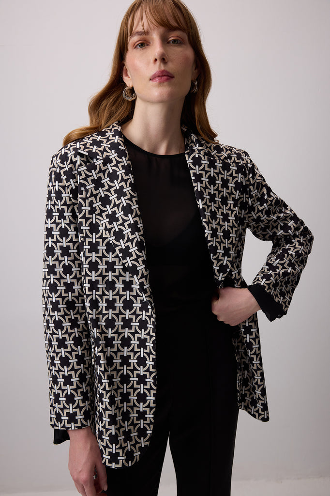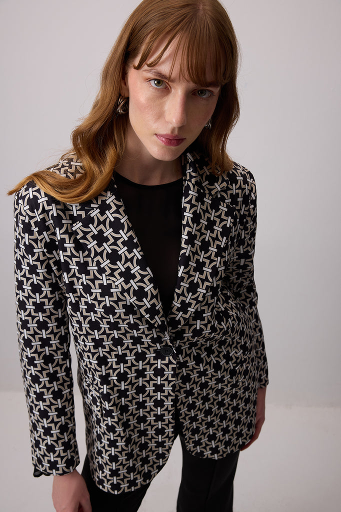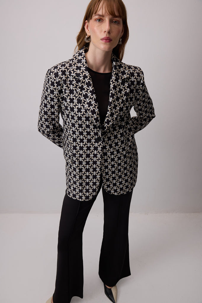 Klasik, çentik yaka. Uzun kollu. Kilit desenli. Önden düğme kapamalı blazer ceket.