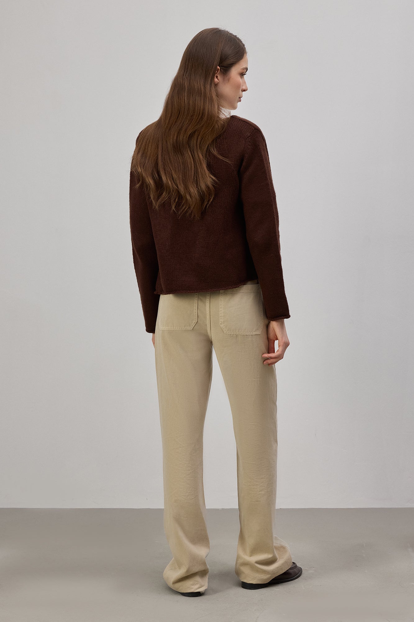 Bisiklet yaka. Önü tam boy düğme kapamalı. Uzun kol. Triko hırka.