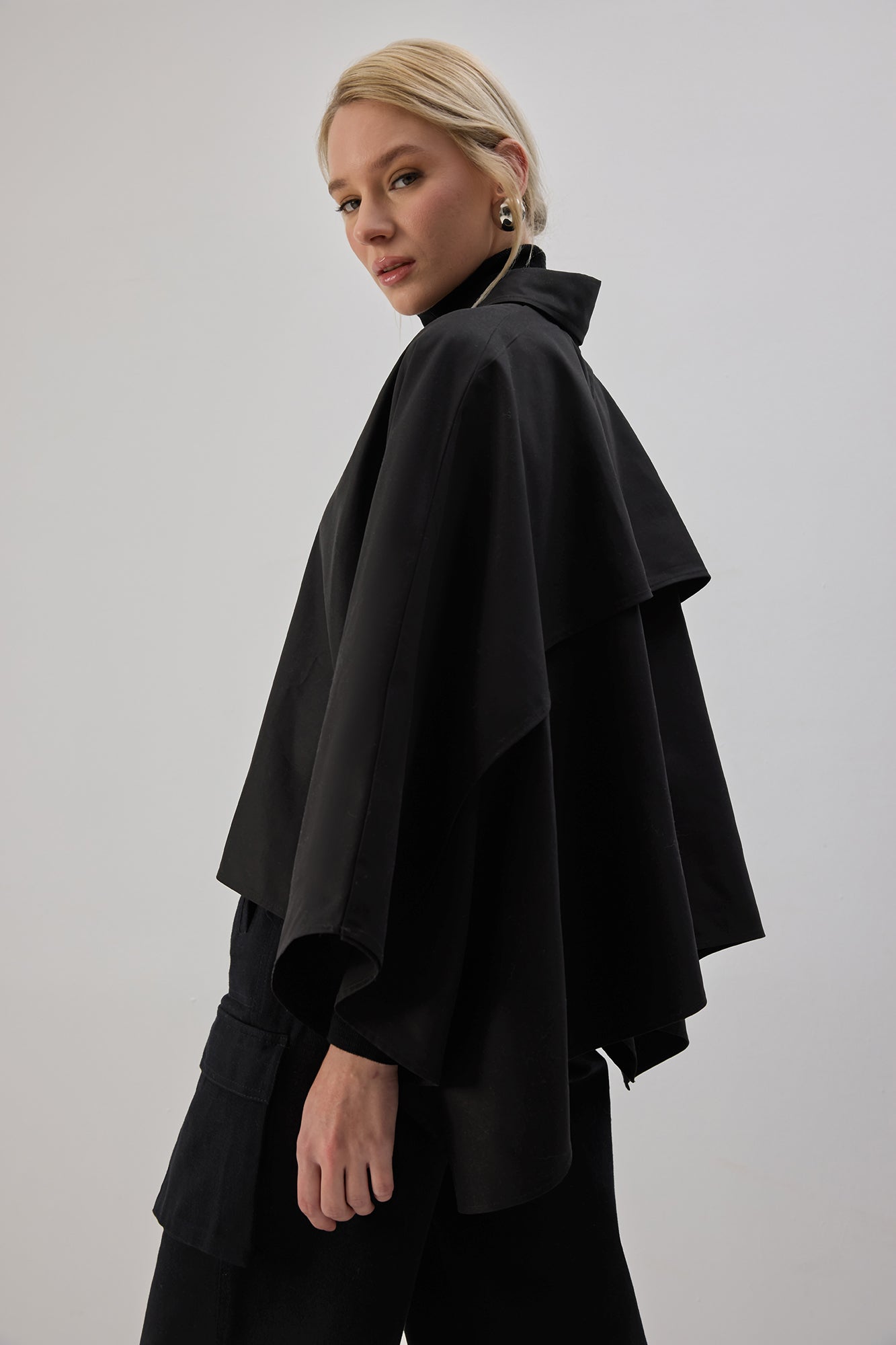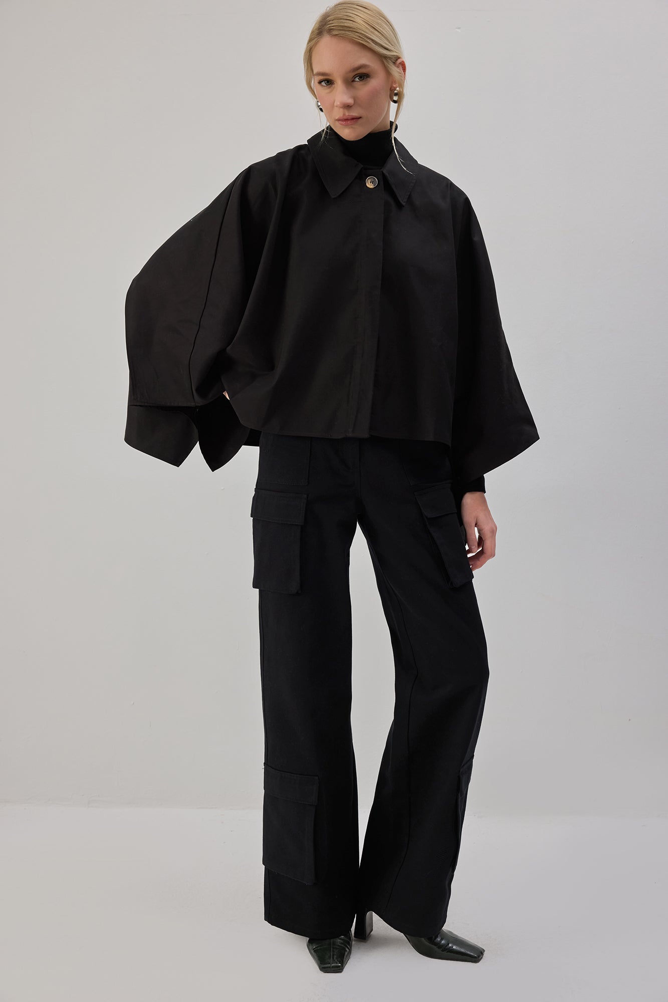 Gömlek yaka. Önden düğmeli kapama. Kısa trenç panço.