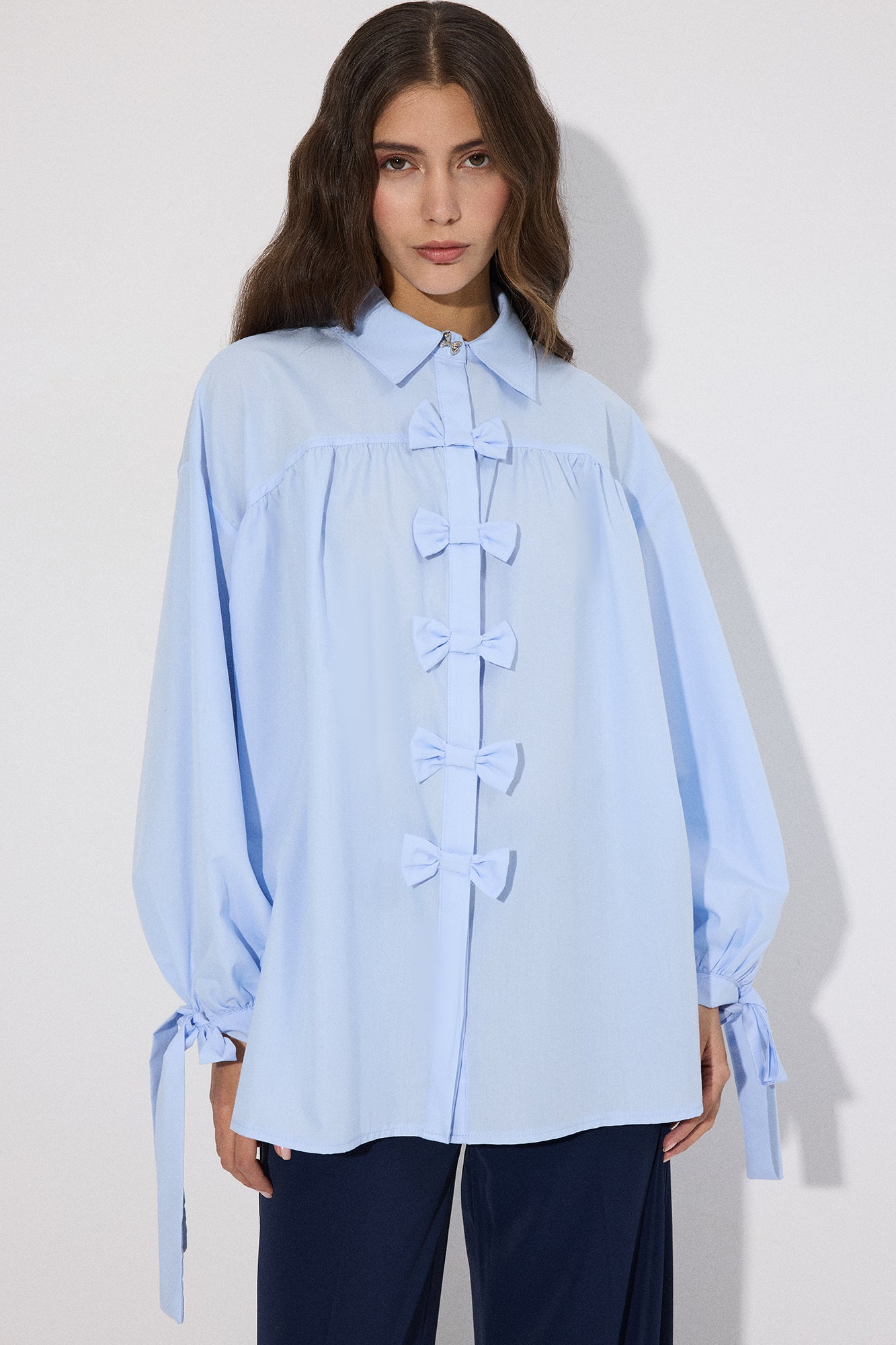 Gömlek yaka. Önü gizli patlı kapama. Ön bölümde fiyonk detayları. Uzun kollu.