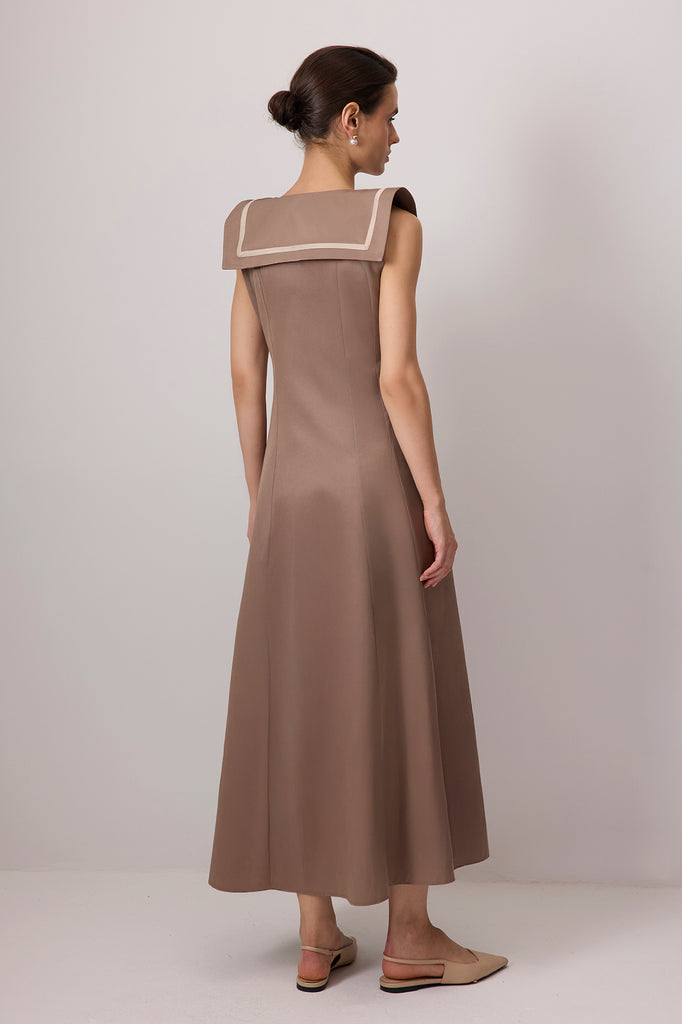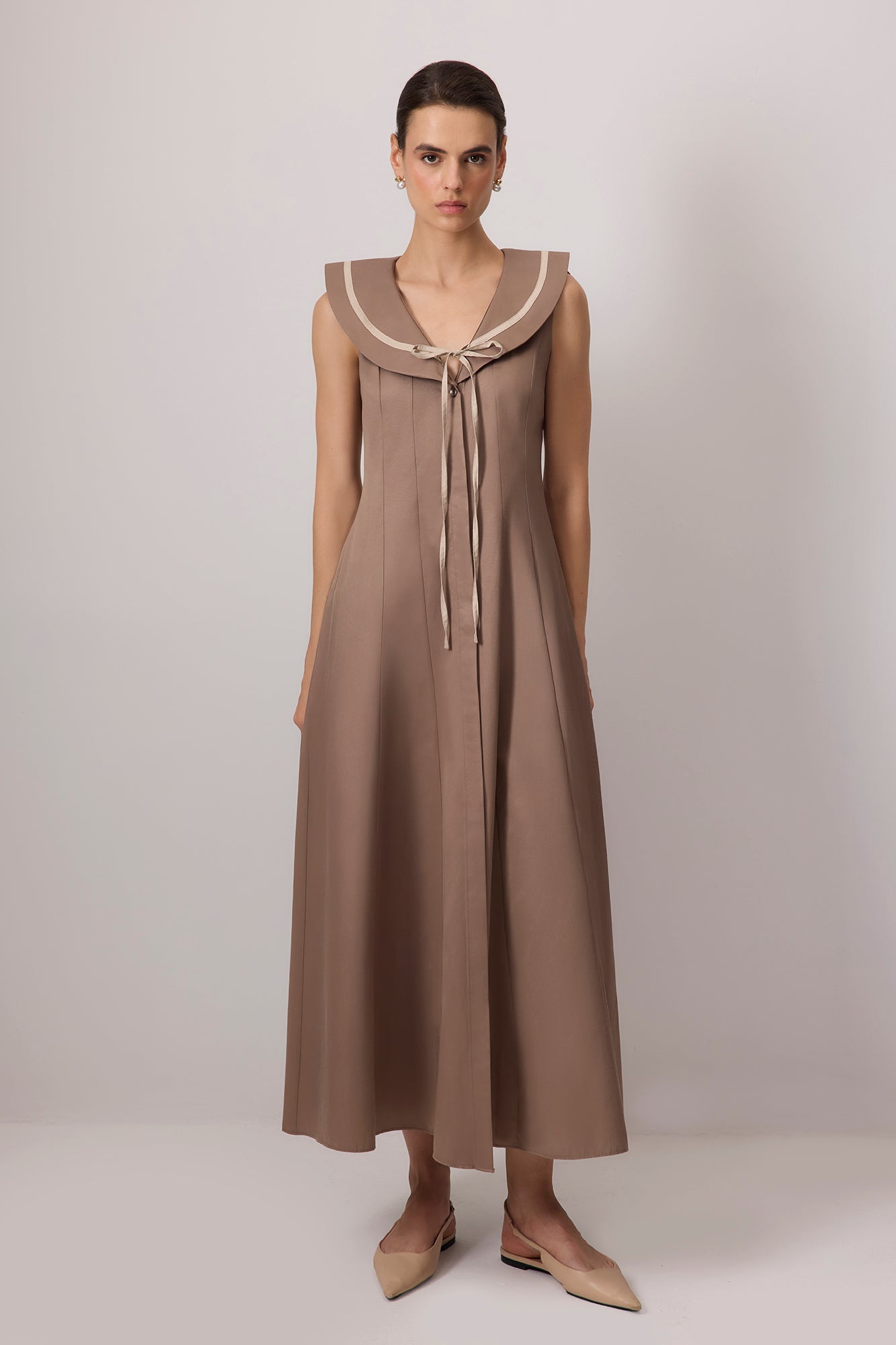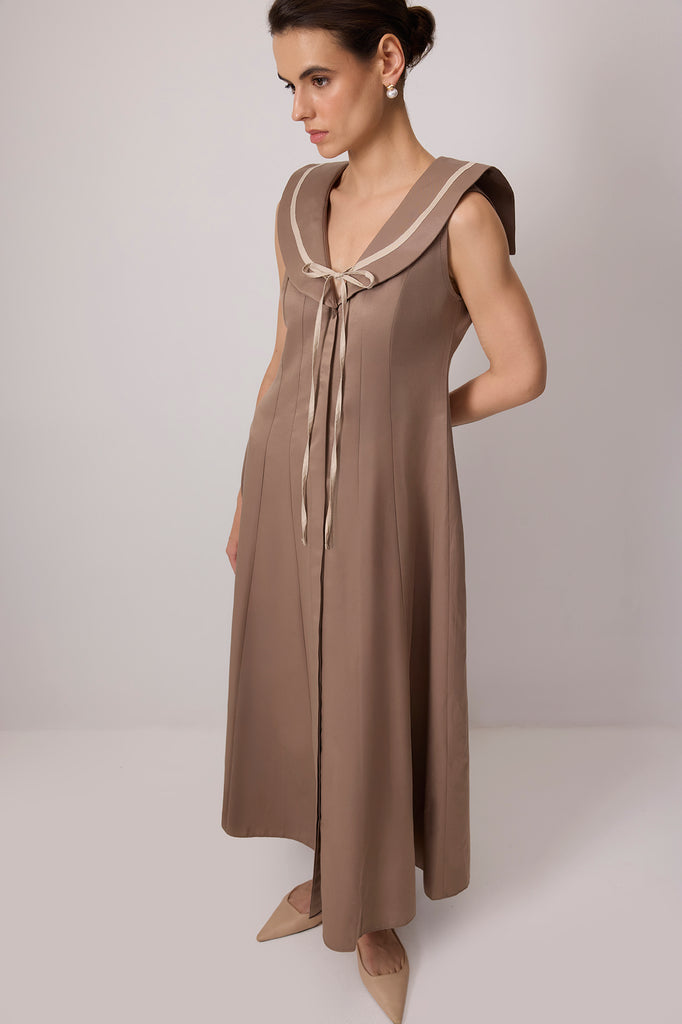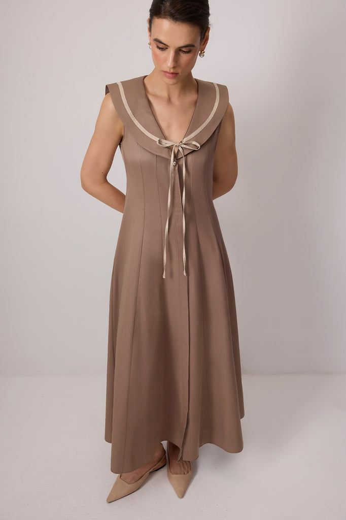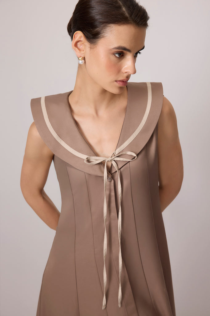 Kontrast biyeli denizci yaka. Kolsuz. Önden bağlama detaylı.