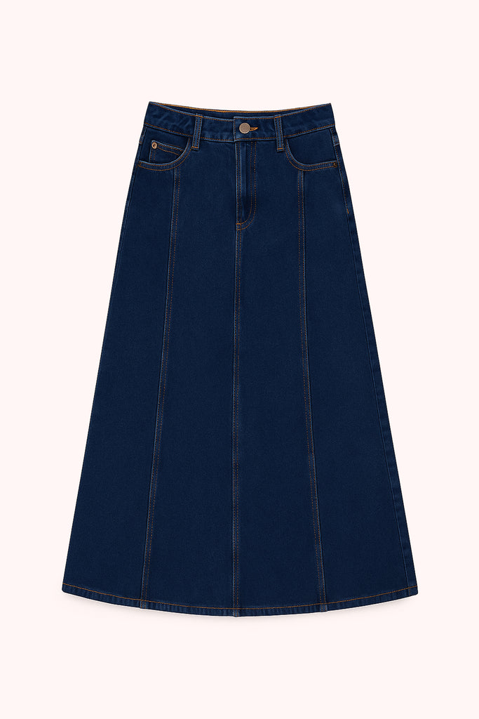 Pamuk karışımlı kumaş. Bisiklet yaka. Yakadan etek ucuna doğru uzanan kontrast biyeli. Aynı kumaştan ayarlanabilir kuşak. Etek ucuna doğru genişleyen form.